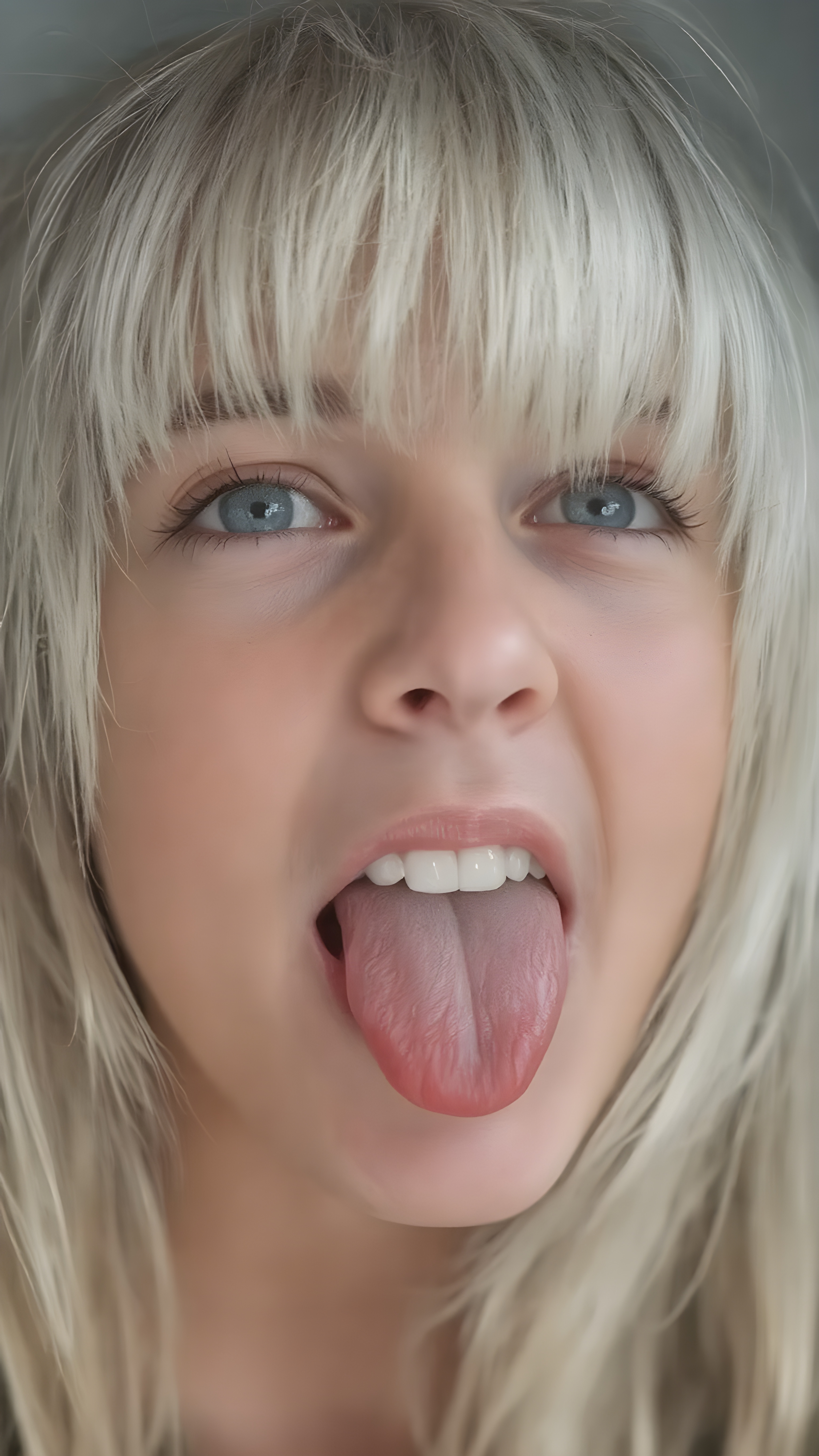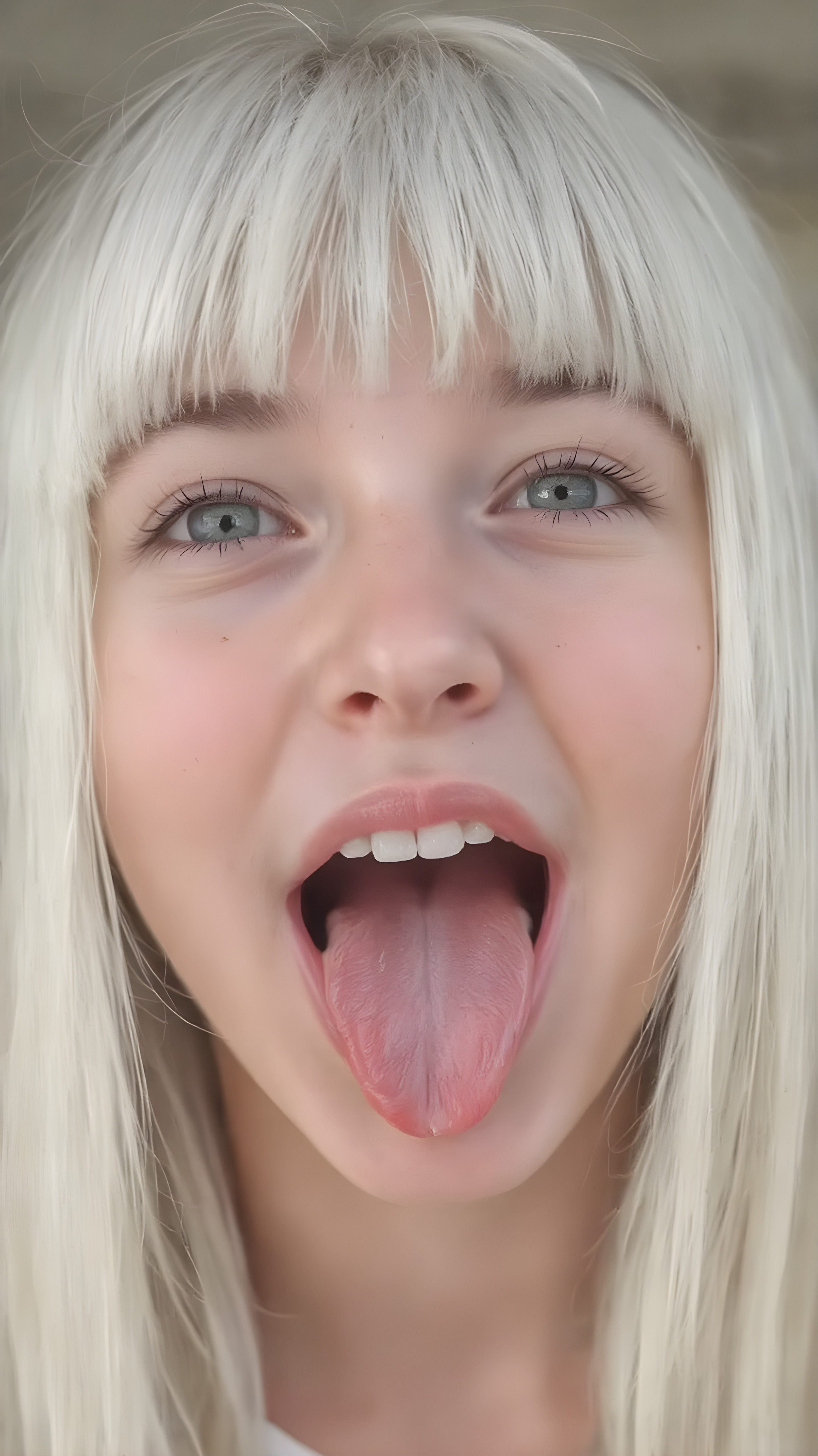 a teenage girl with straight white hair, bangs, long soft hair, detailed face, looks up, wide open mouth, white teeth, full kissable lips, sticks out his tongue, full head in focus