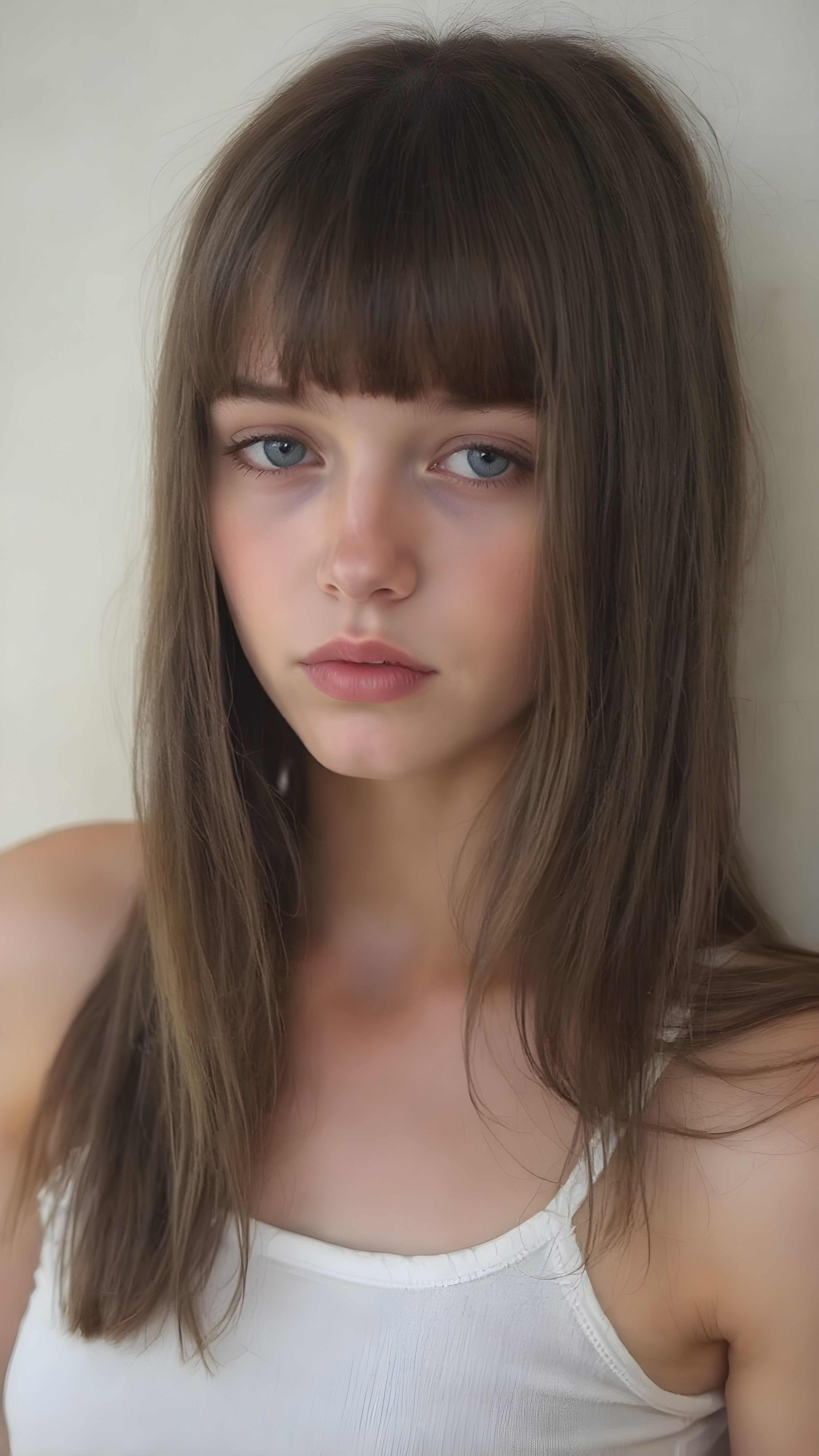 visualize a cute picture: a detailed teen girl, 13 years old, with soft straight very long jet hair, bangs cut frame her round face, exuding a sense of melancholy and loneliness, full lips, (((white cropped short tank top made of fine wool)) which perfectly shaped her body), side view (((against a wall backdrop)))