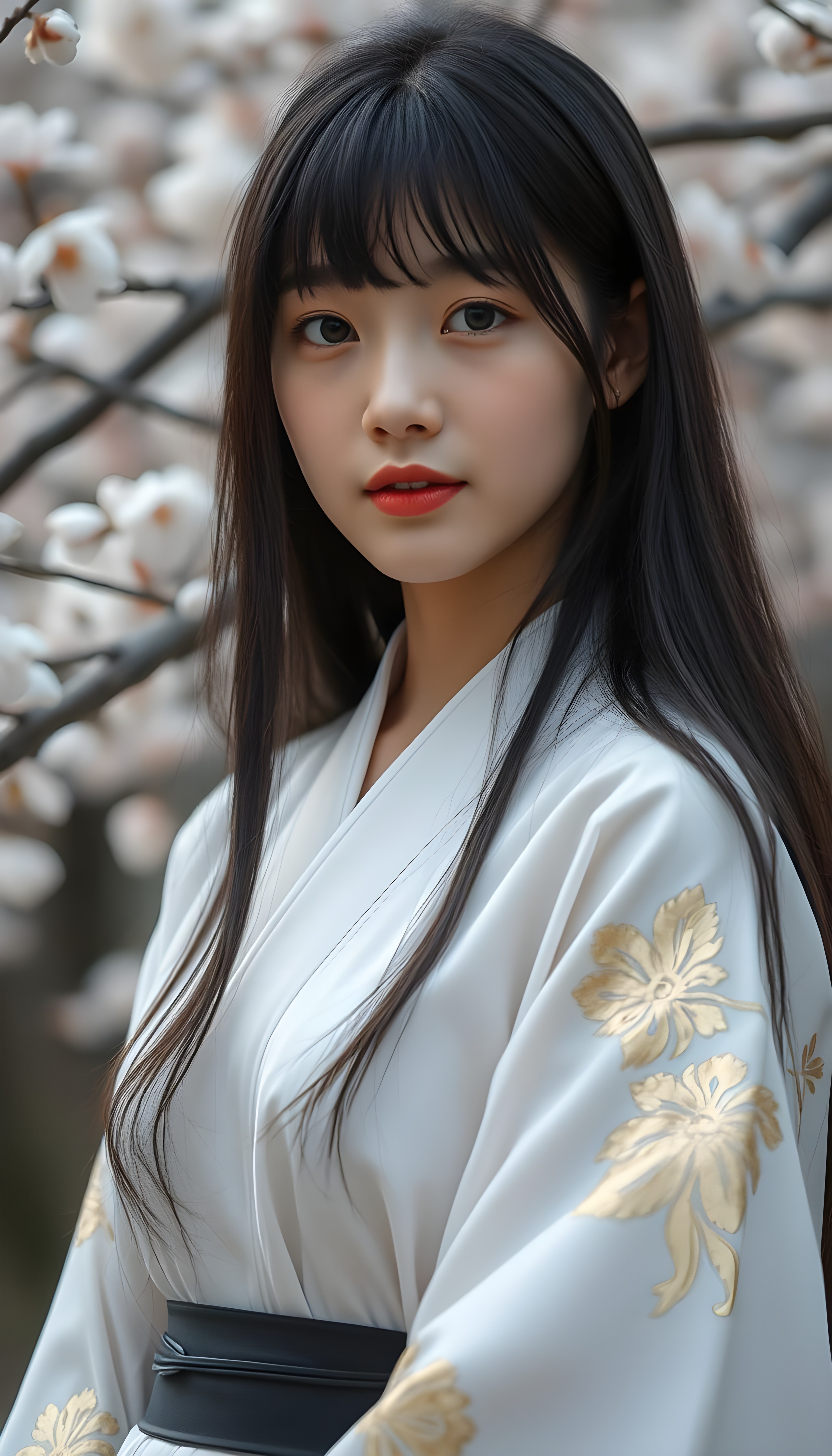 A close-up portrait of a breathtakingly stunning Korean girl with length, sleek black hair (OR bob cut) styled in a chic blowout. Her bangs are perfectly aligned, framing her face. She is wearing a vibrant red traditional hanbok with intricate gold embroidery, standing against a backdrop of cherry blossom trees in full bloom. The lighting is soft and warm, casting a gentle glow on her flawless skin and highlighting her warm brown eyes. The composition captures her serene expression and the delicate beauty of the hanbok and cherry blossoms, creating a harmonious blend of traditional and natural elegance.