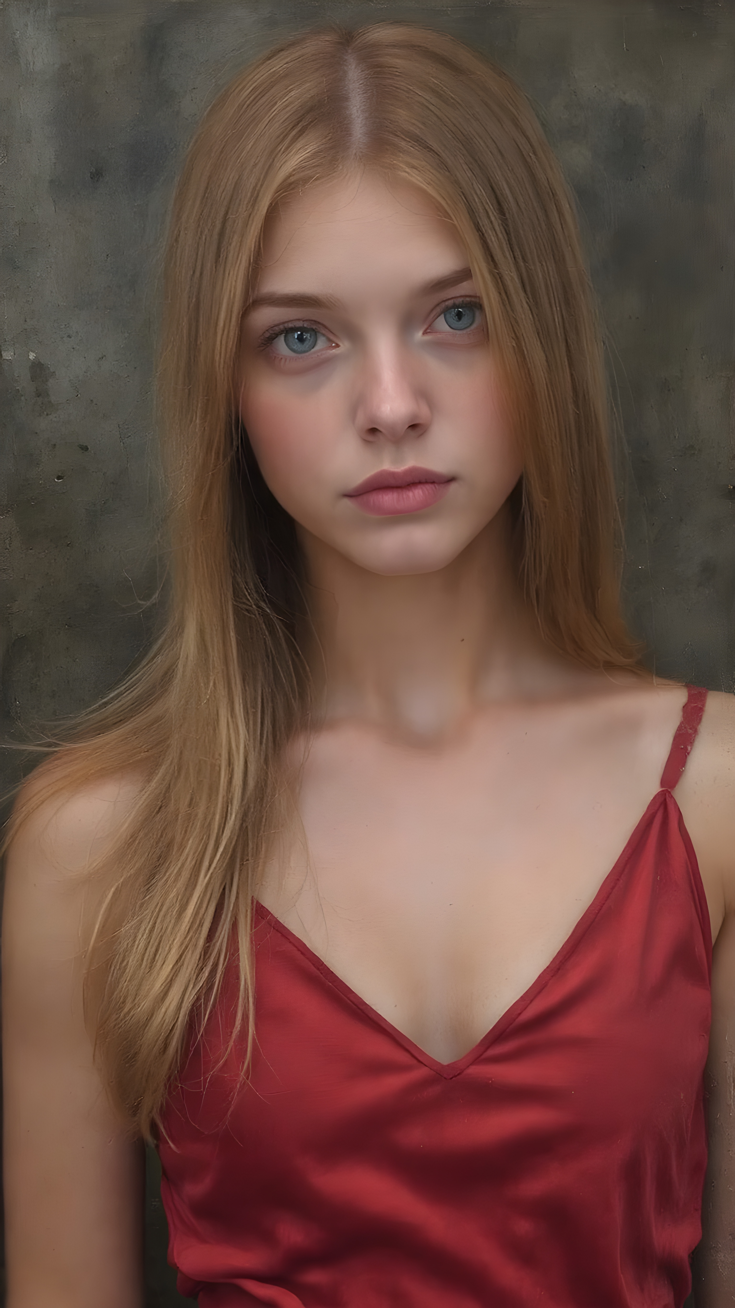 a young Victorian girl with straight ginger color very long slick-back soft hair, wearing a short red silk tank top, deep v-neck, view from the front