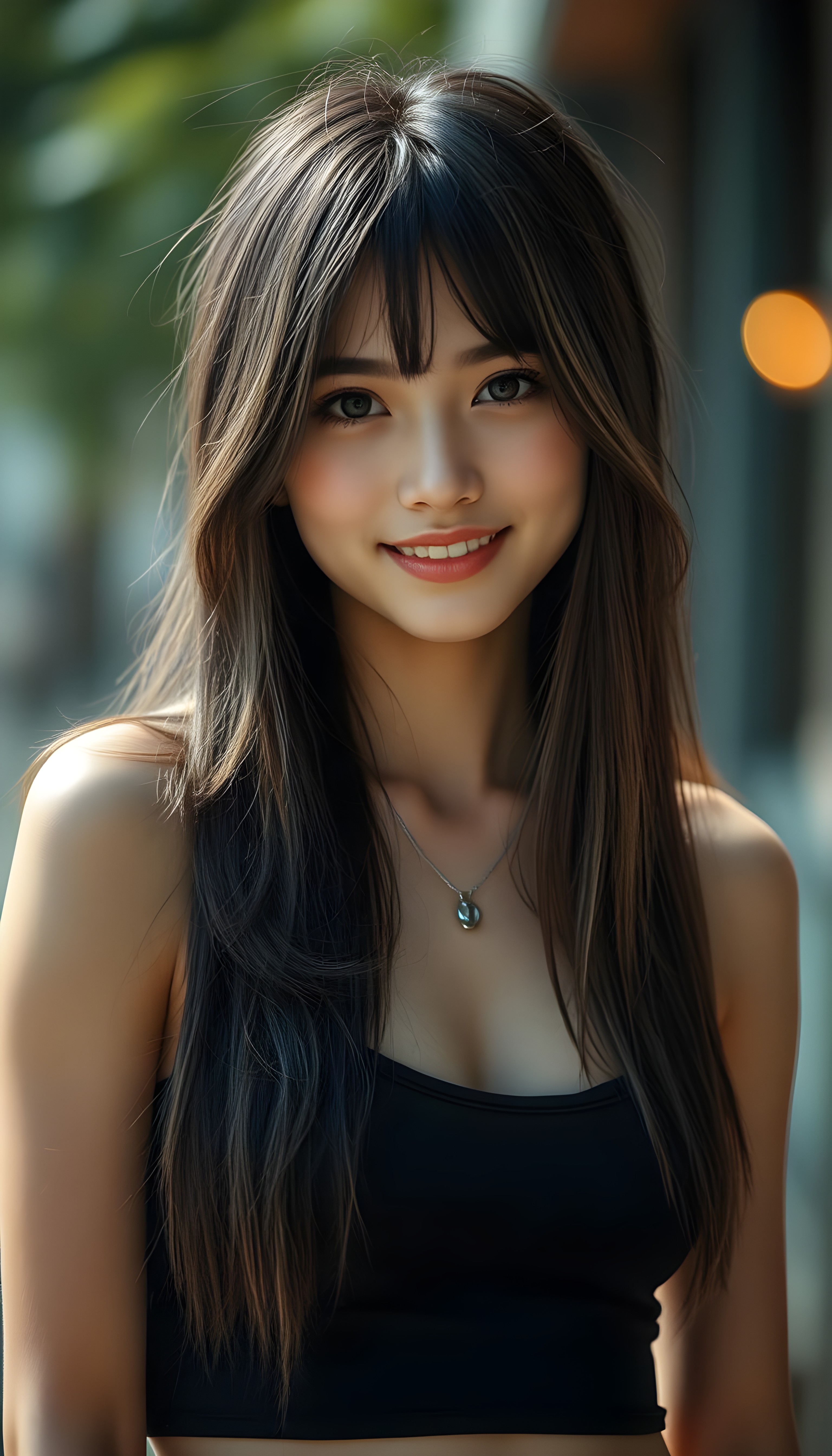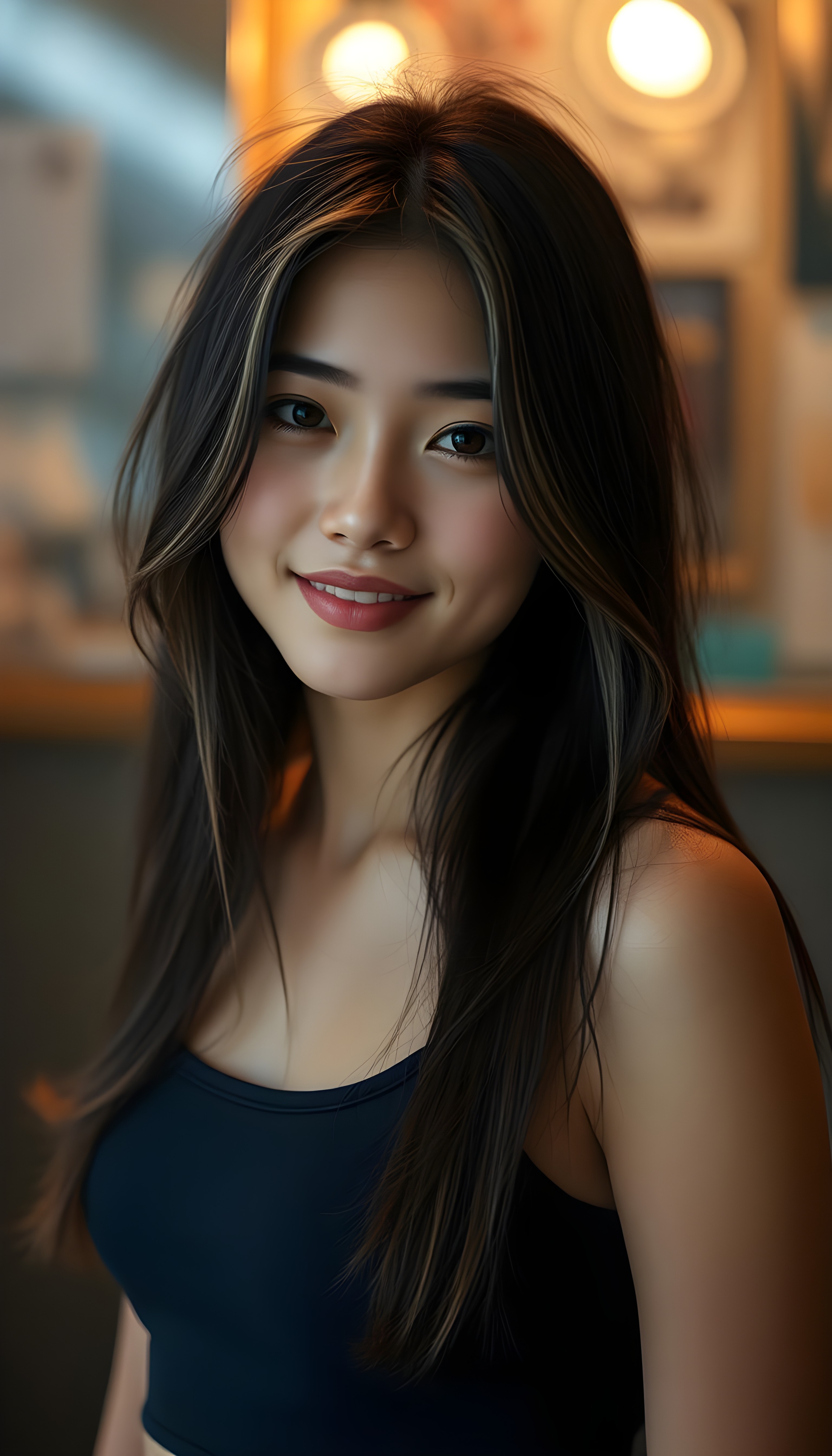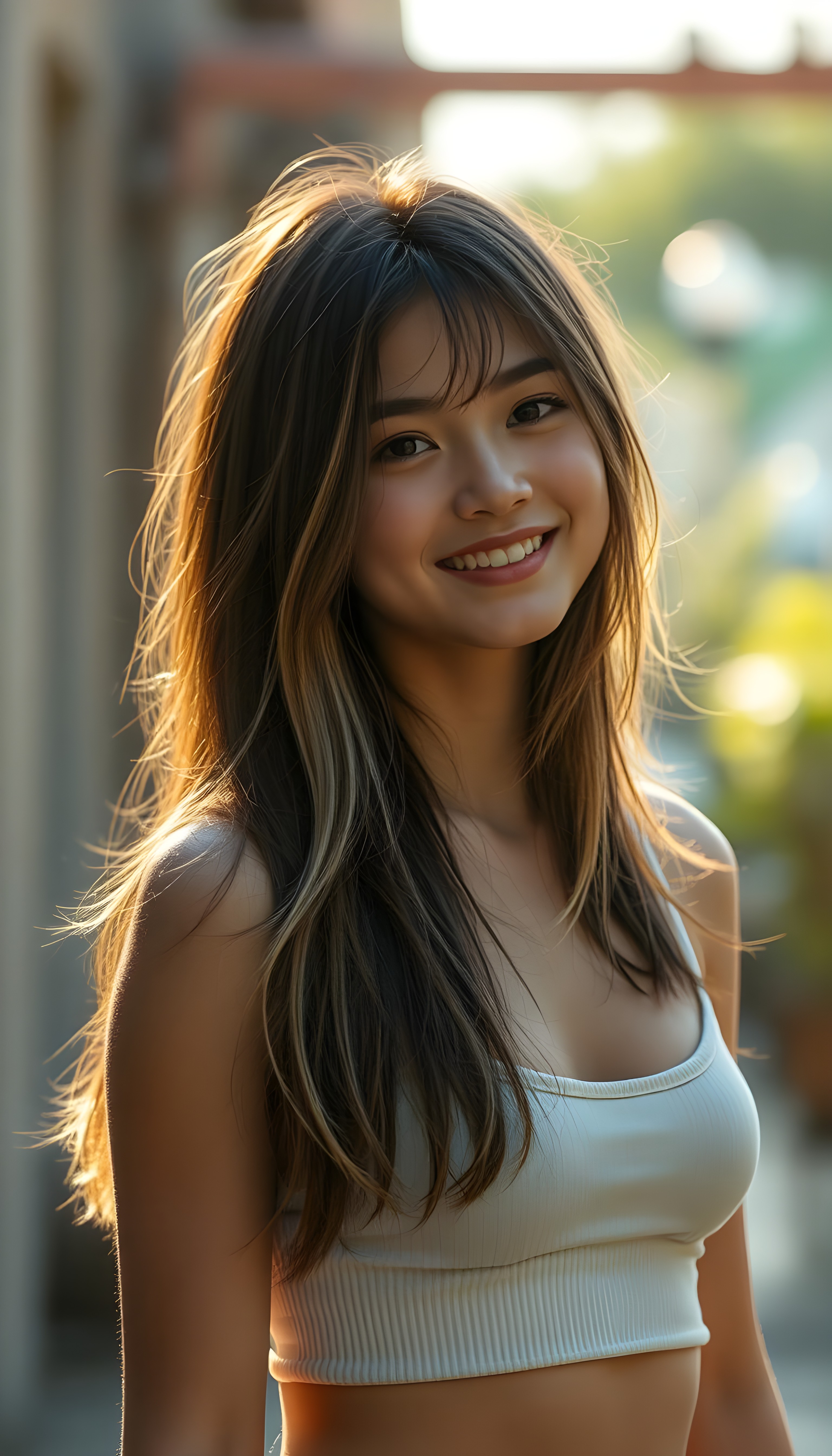 a beautiful, young teen girl, ((detailed and realistic dark straight hair with blond highlights)), ((detailed, realistic photo)) ((perfect curved body)) ((gorgeous)) ((stunning)) ((cute)), short crop tank top, enjoy her carefree life, she is smiling, posing