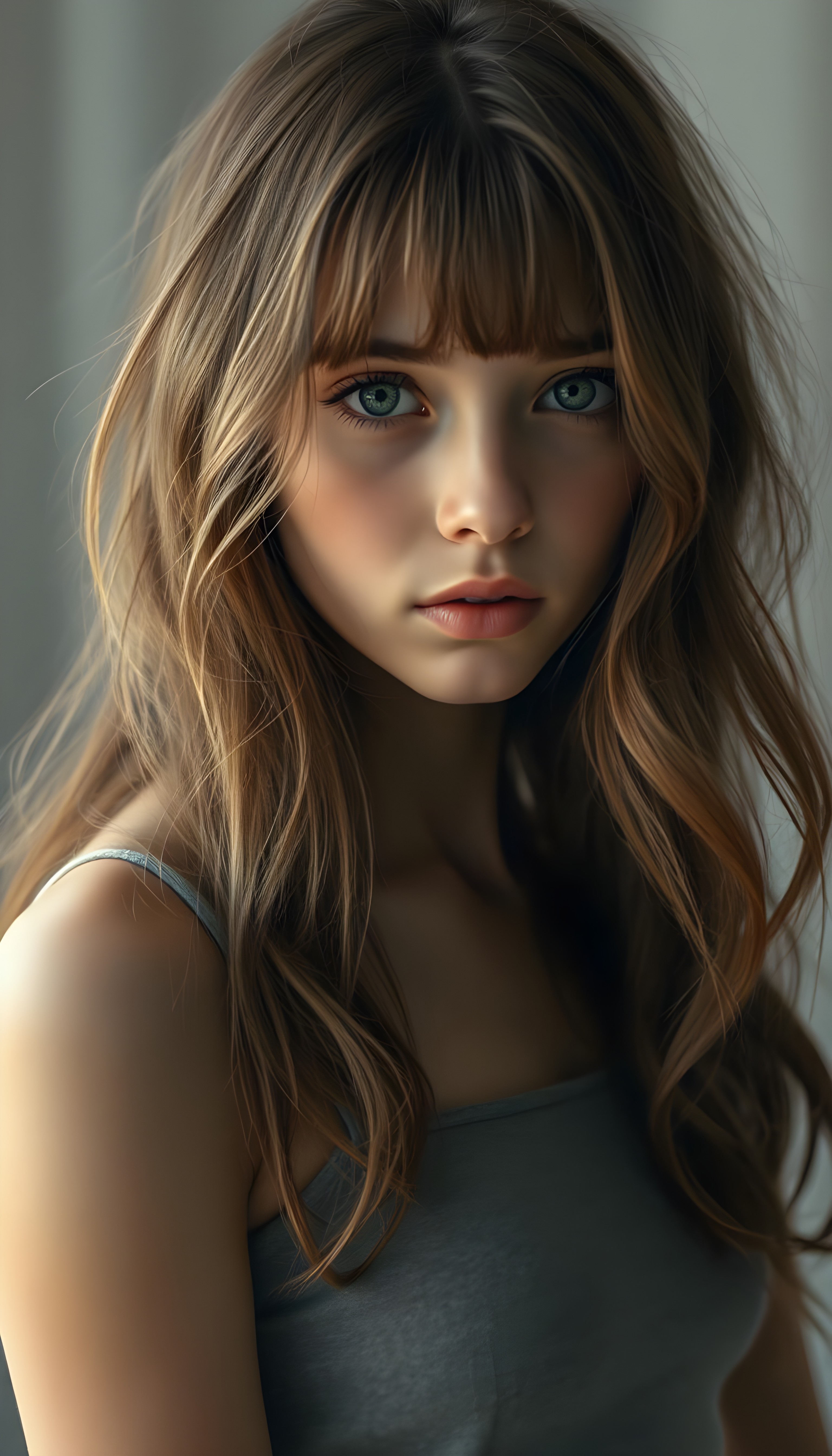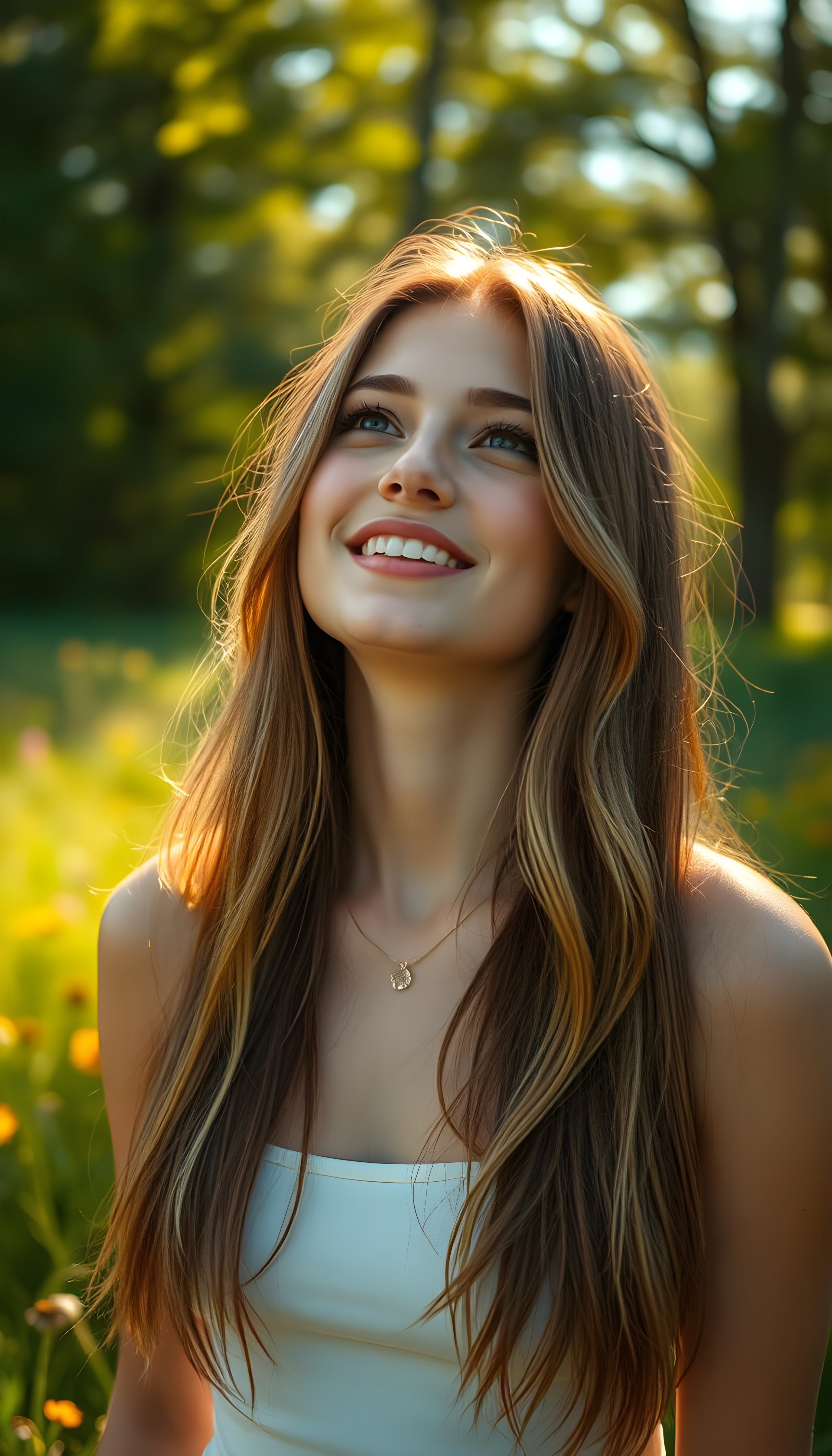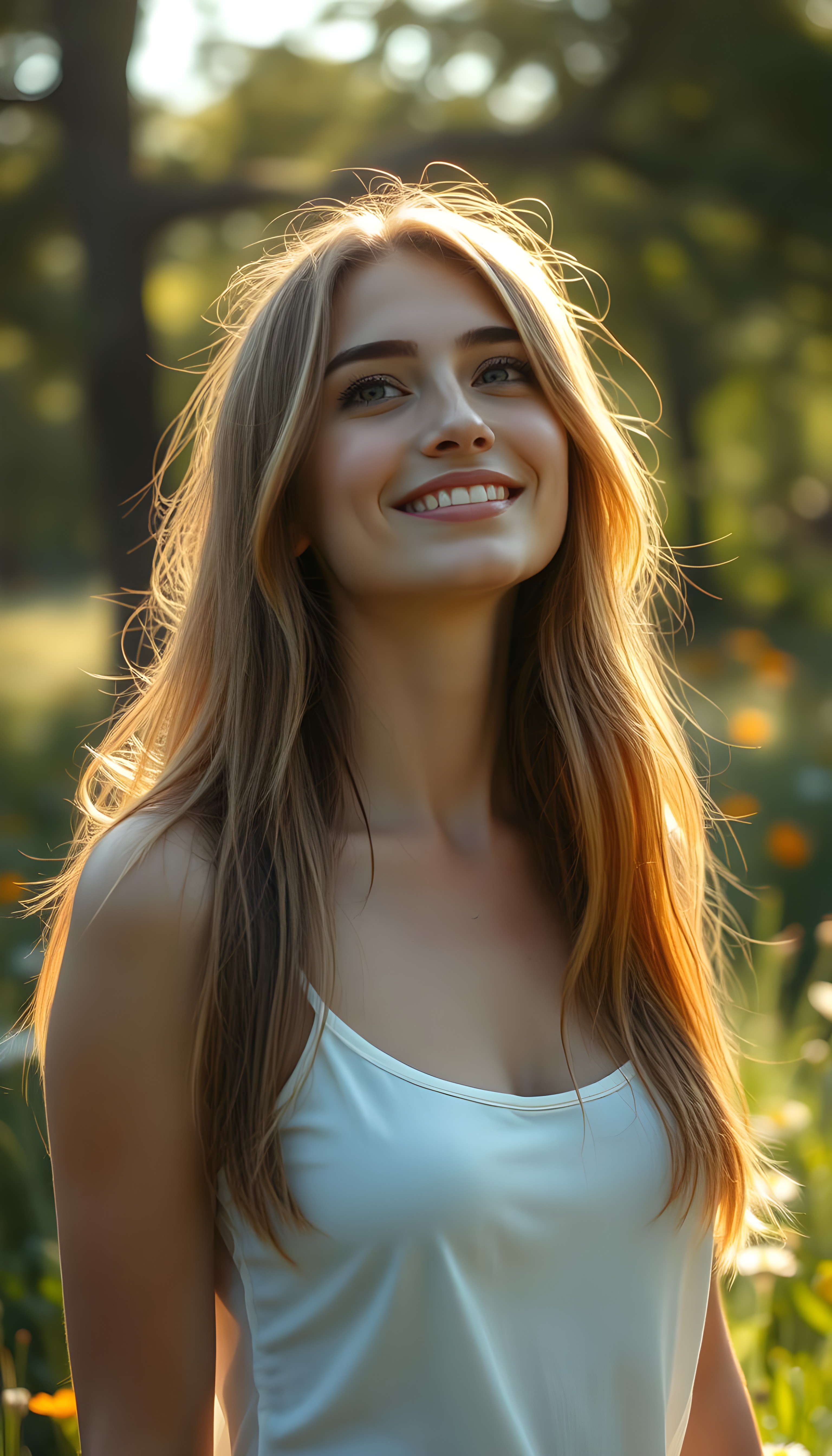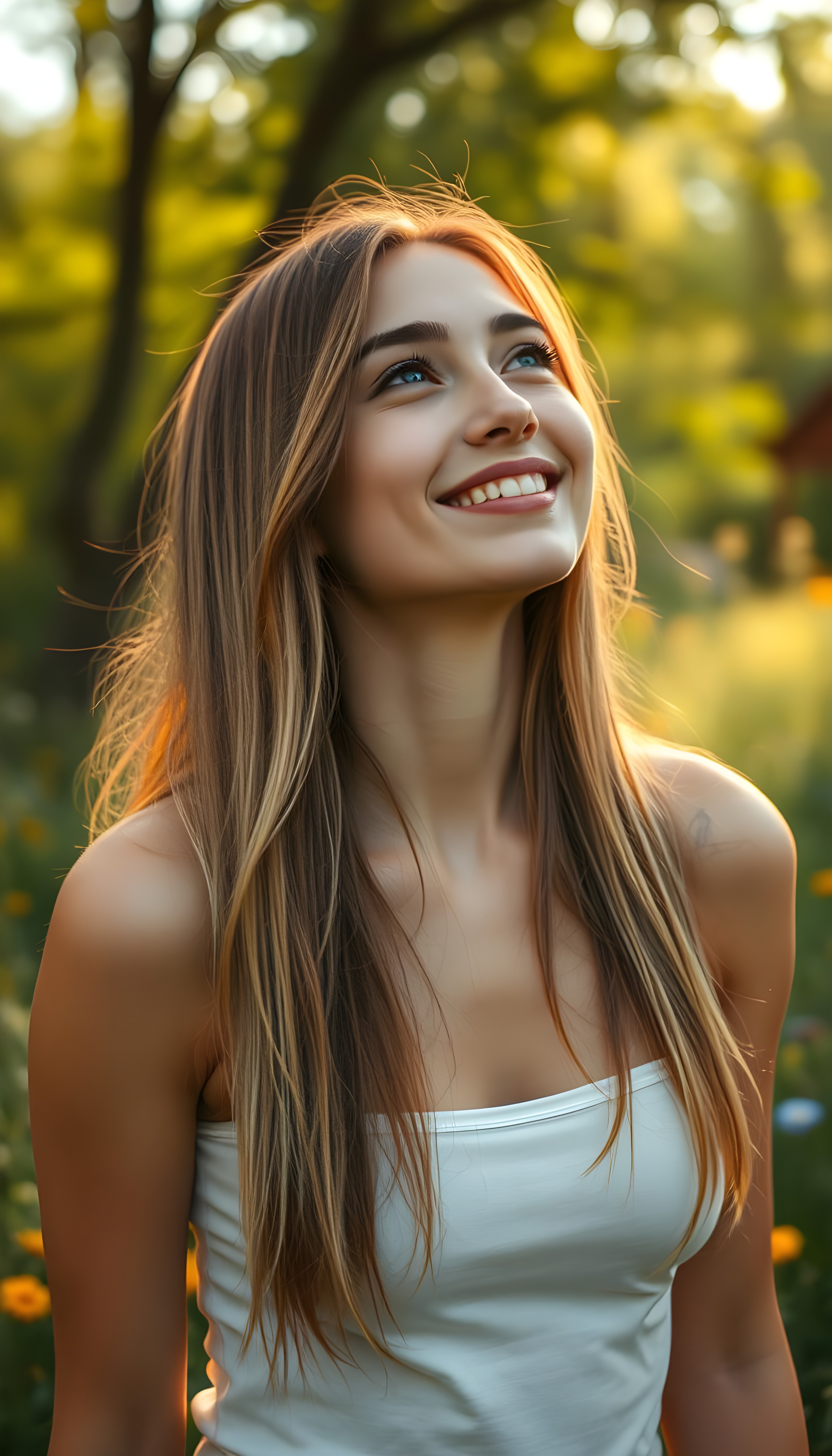 a beautiful, young teen girl, ((detailed and realistic dark straight hair with blond highlights)), ((detailed, realistic photo)) ((perfect curved body)) ((gorgeous)) ((stunning)) ((cute)), short crop tank top, enjoy her carefree life, she is smiling, posing