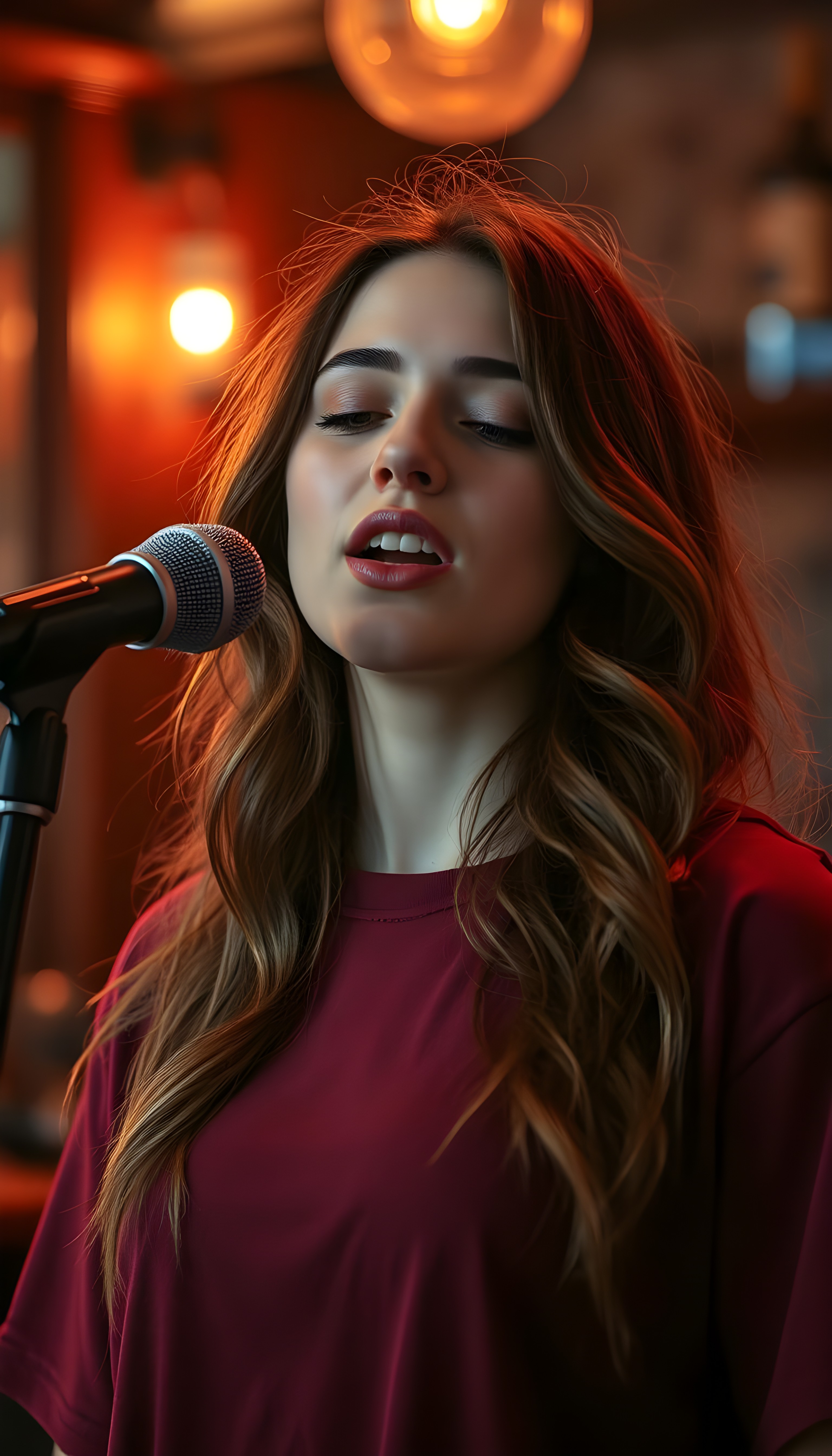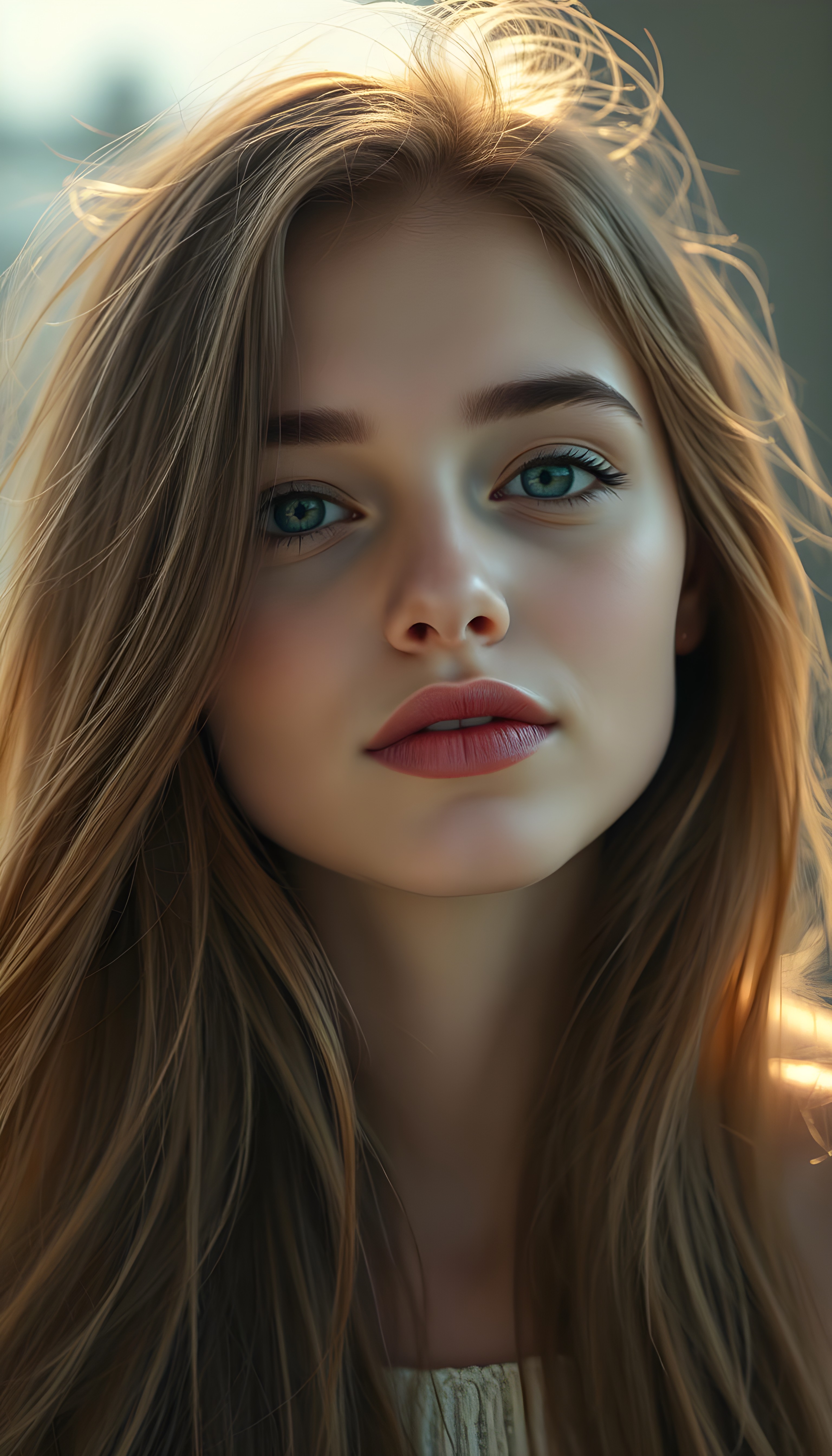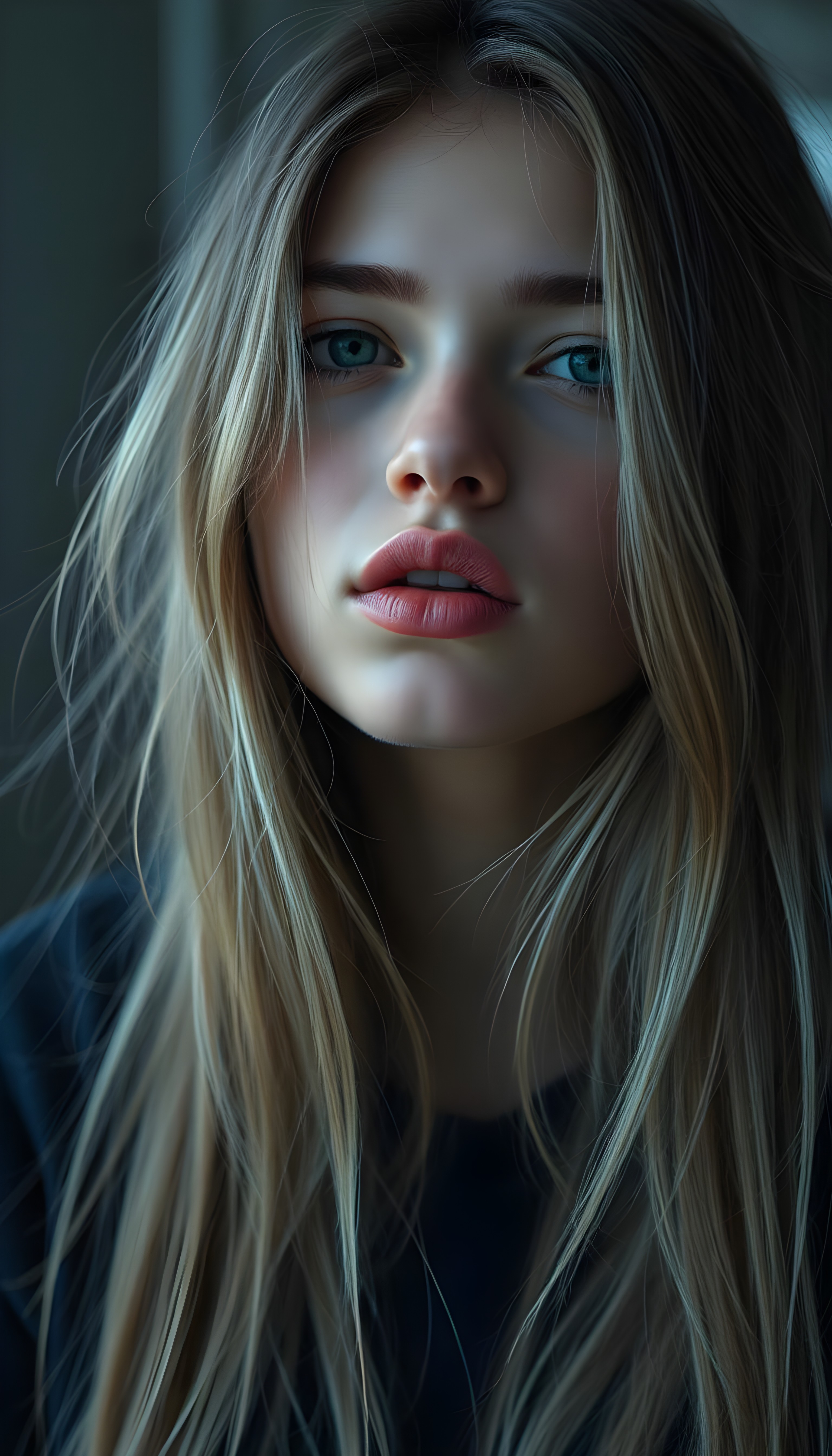 A young, cute Scandinavian girl, she pouts her lips, happy, long soft hair, perfect makeup, red lips, kissable. HDR, 4K, perfect shadows and light.