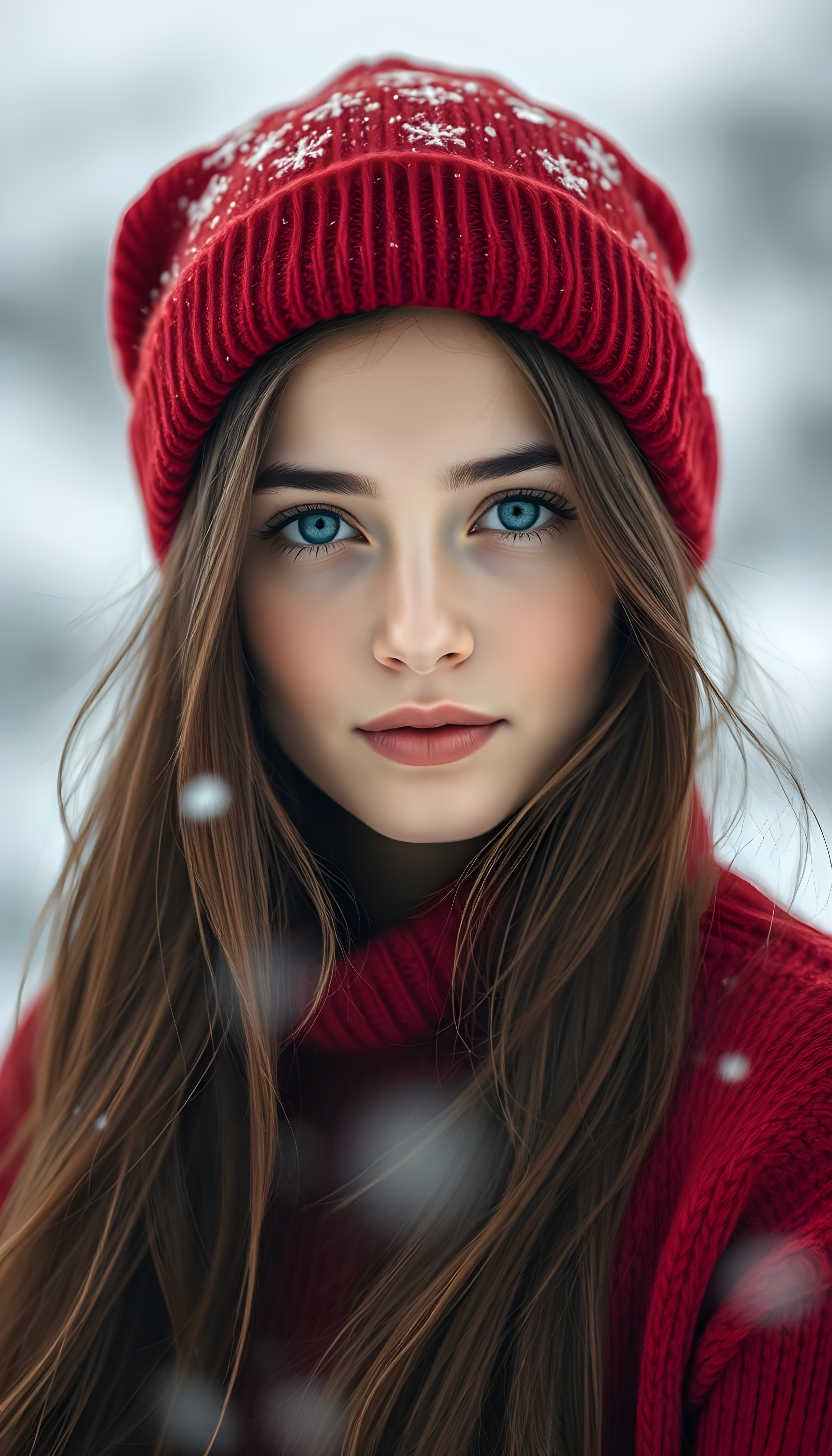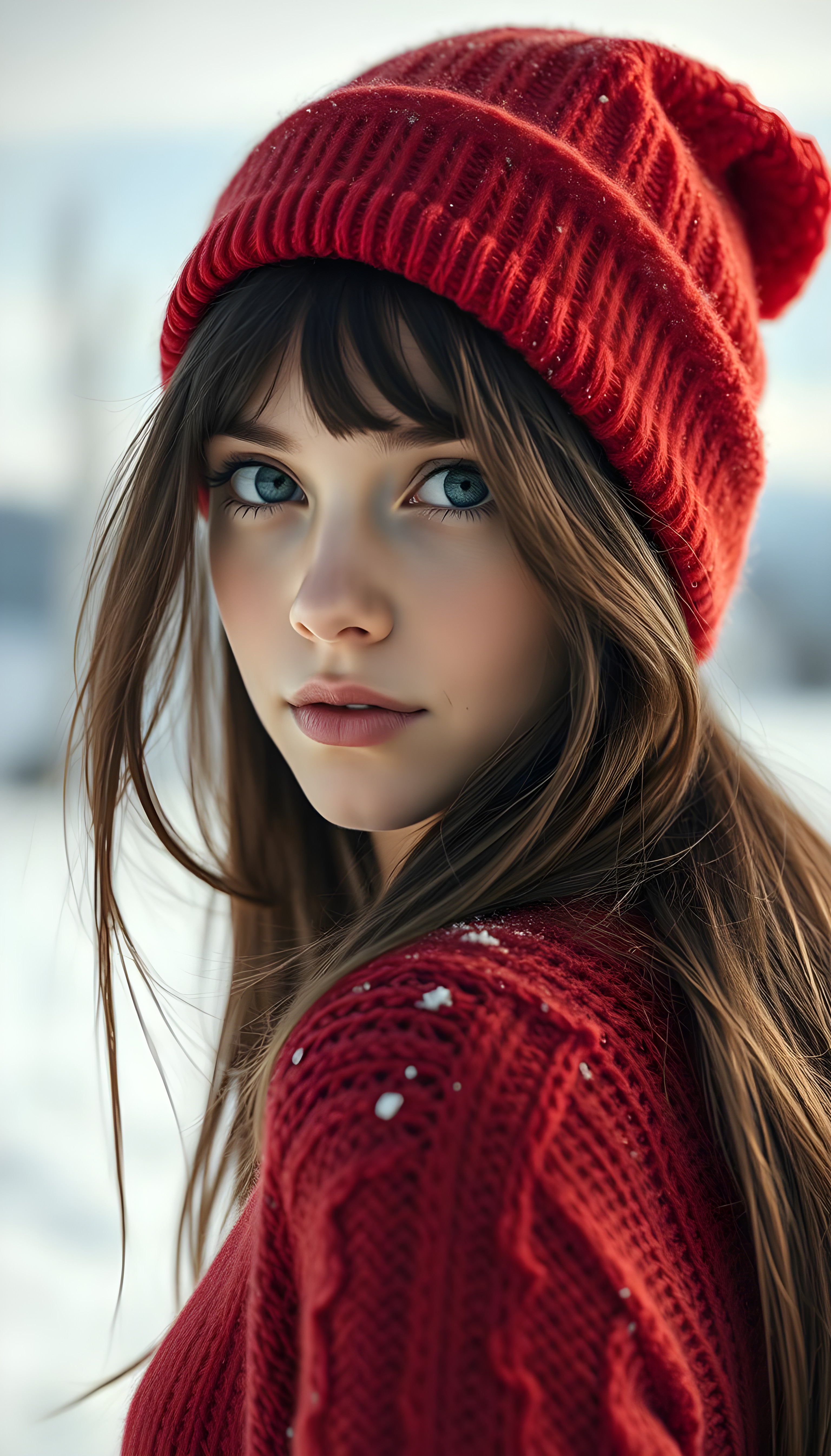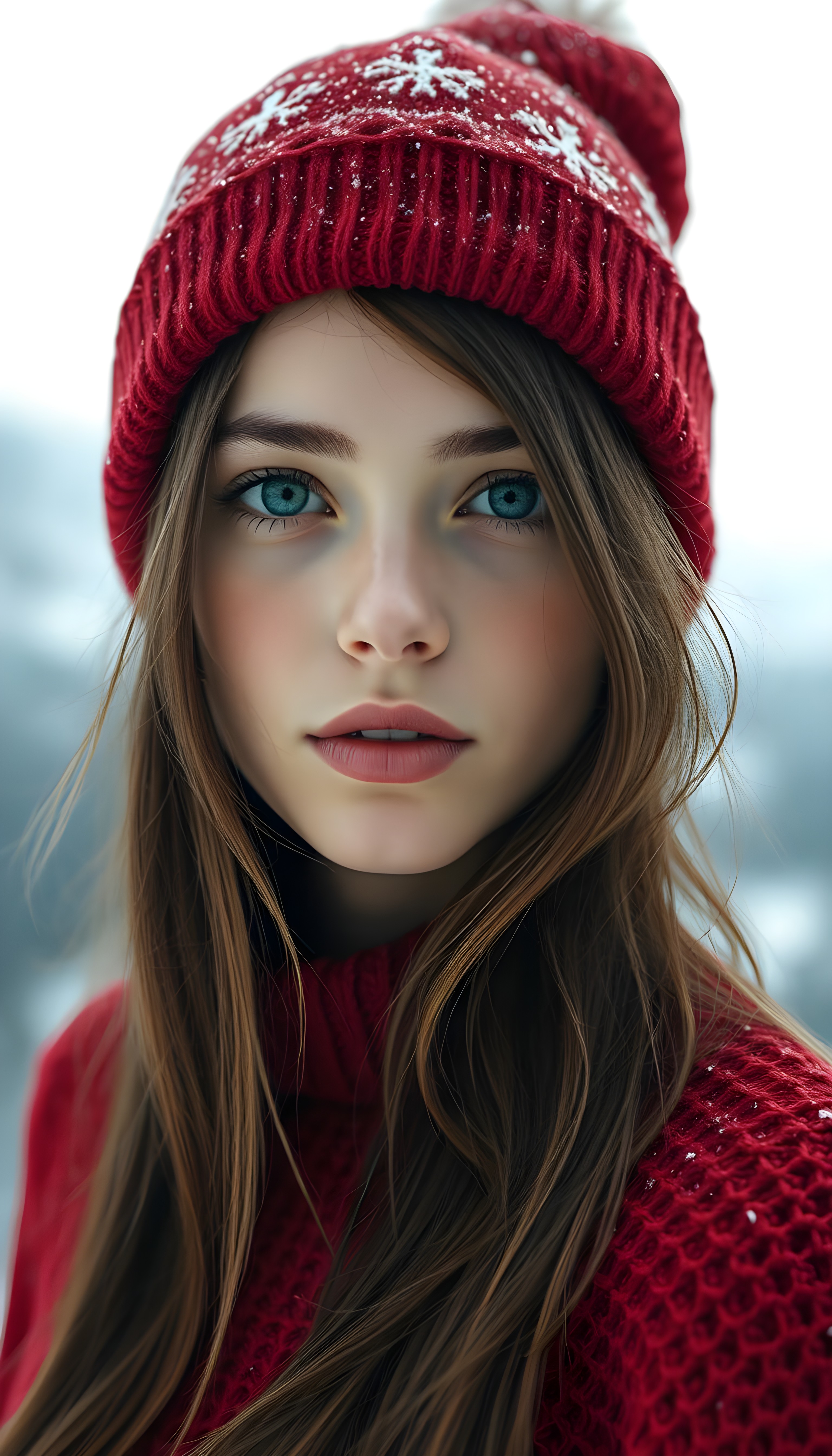 A pretty young girl with silky brown hair and black hinglights, deep blue eyes, and flawless skin. She is wearing a red Christmas hat and a red, fine thin wool sweater, support her perfect curved female figure. White, snowy backdrop in the mountains.