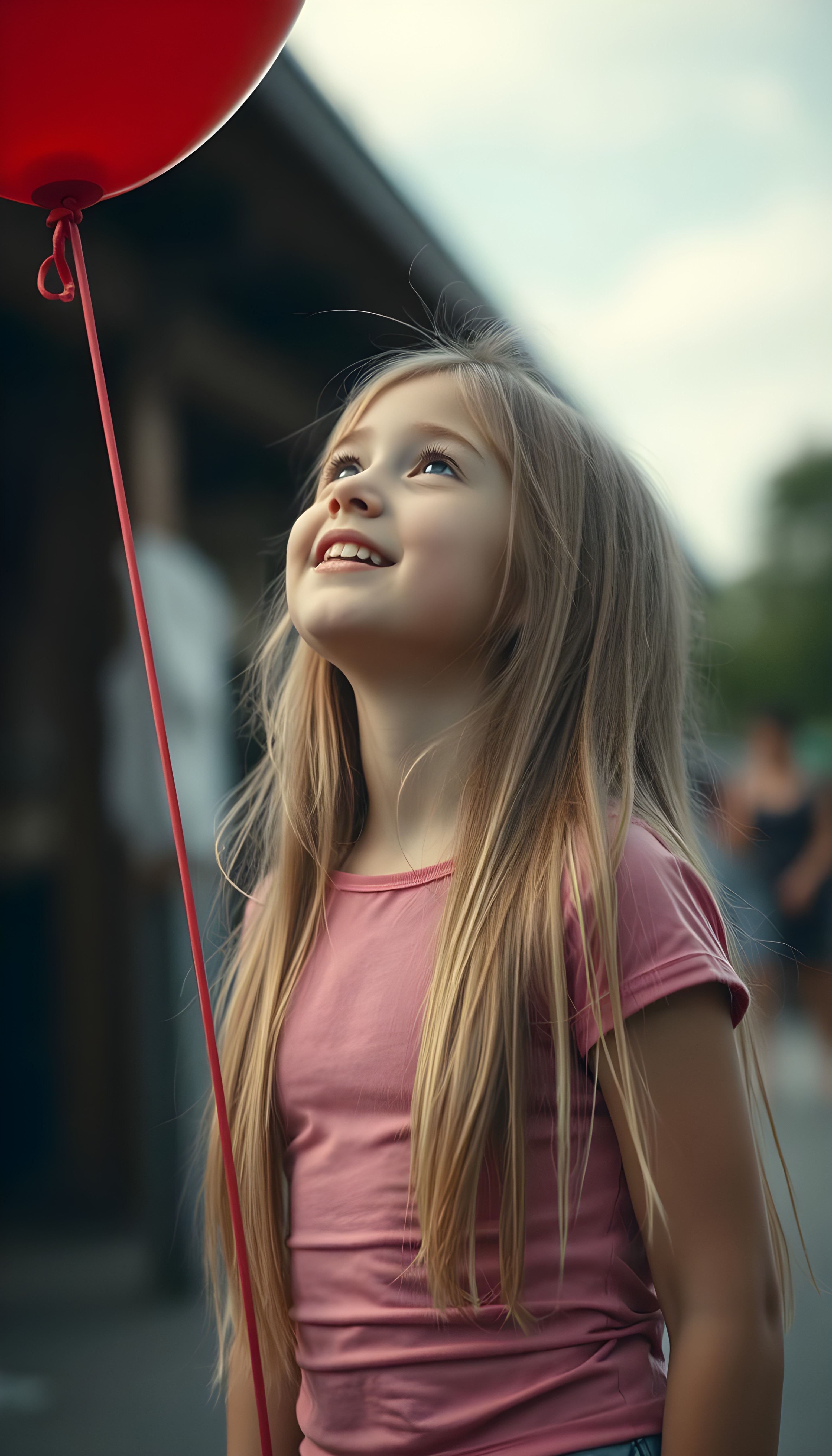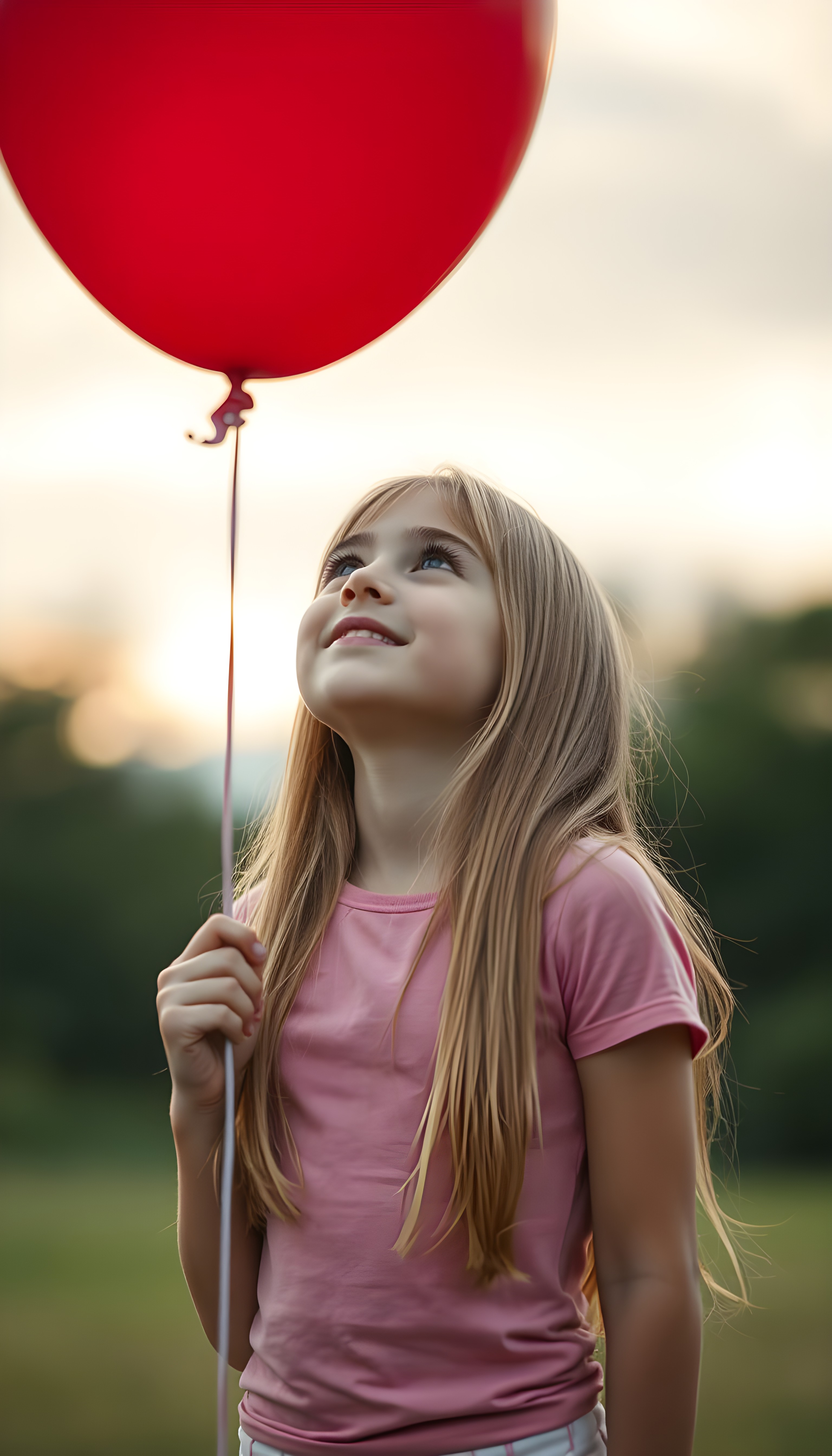 A young girl holds with one hand a red balloon, her long, straight blonde hair falling elegantly over her body. She is happy and content. She wears a pink tight t-shirt. She looks up at the sky and searches for something.