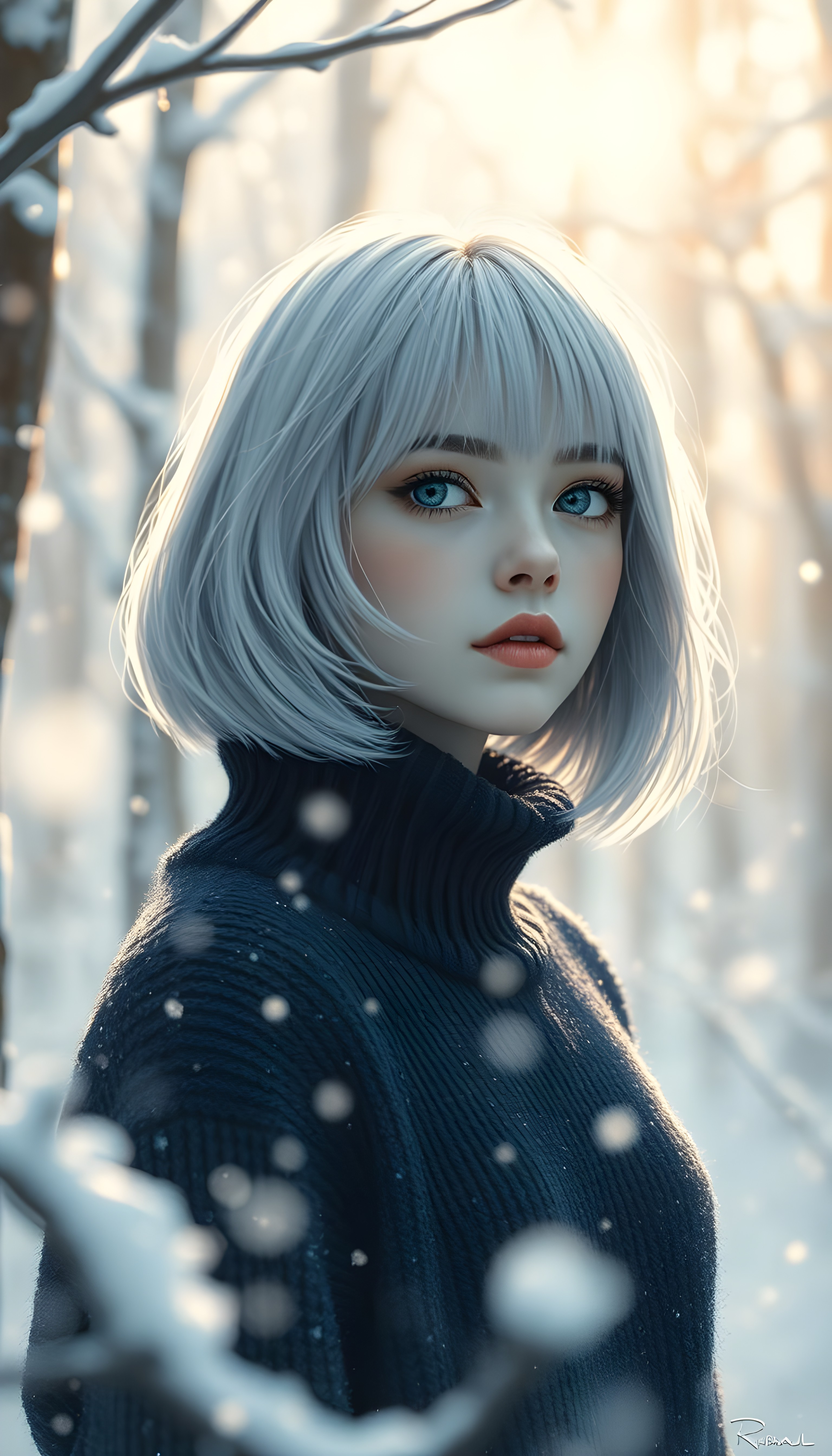 In a serene winter forest, a young girl with flowing snow-white hair and deep blue eyes gazes into the distance, her bob haircut framing her delicate face. Wearing a cozy dark blue sweater. The scene is bathed in soft, golden sunlight, creating a magical and dreamy atmosphere, with snowflakes gently falling around her.