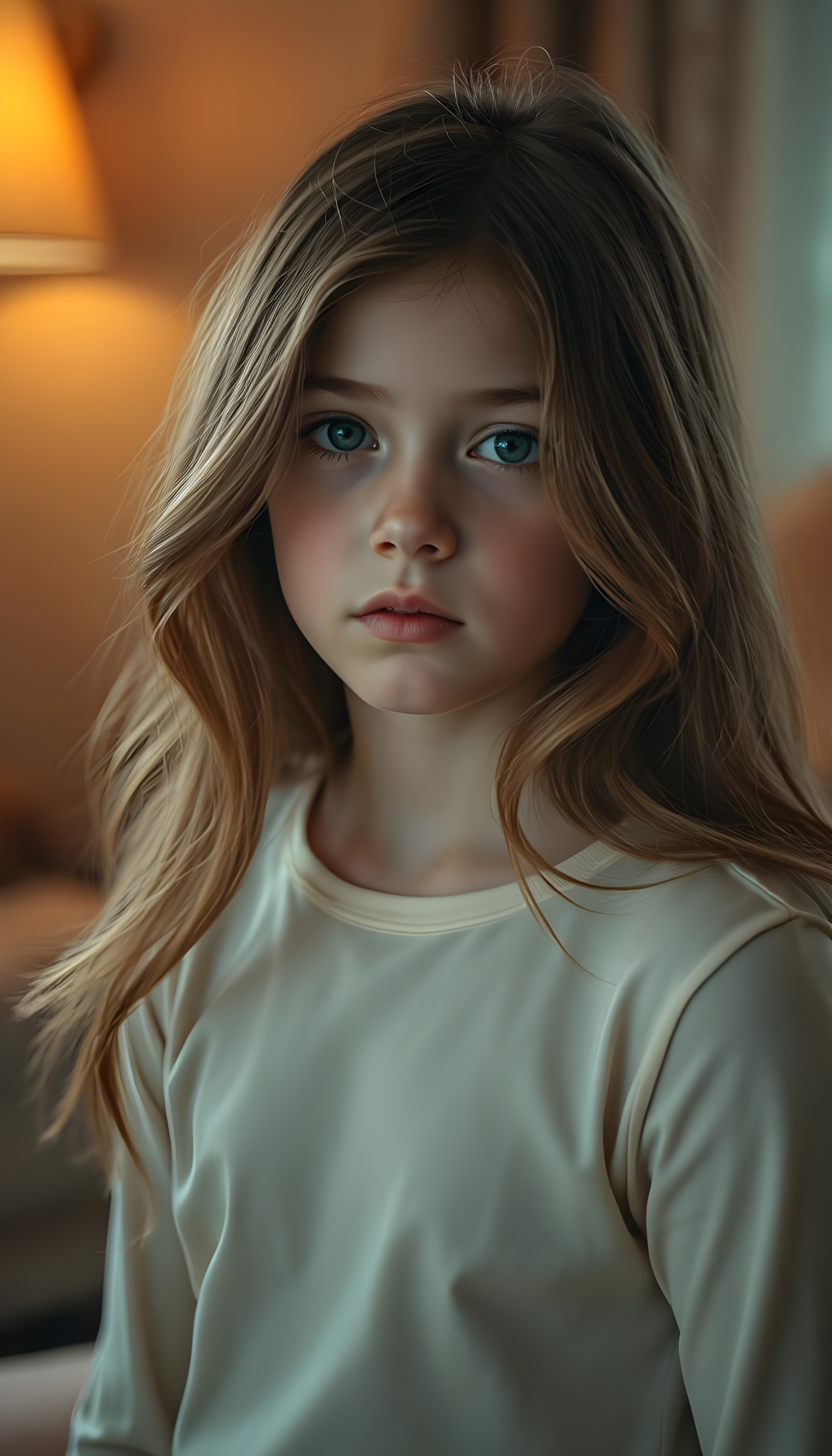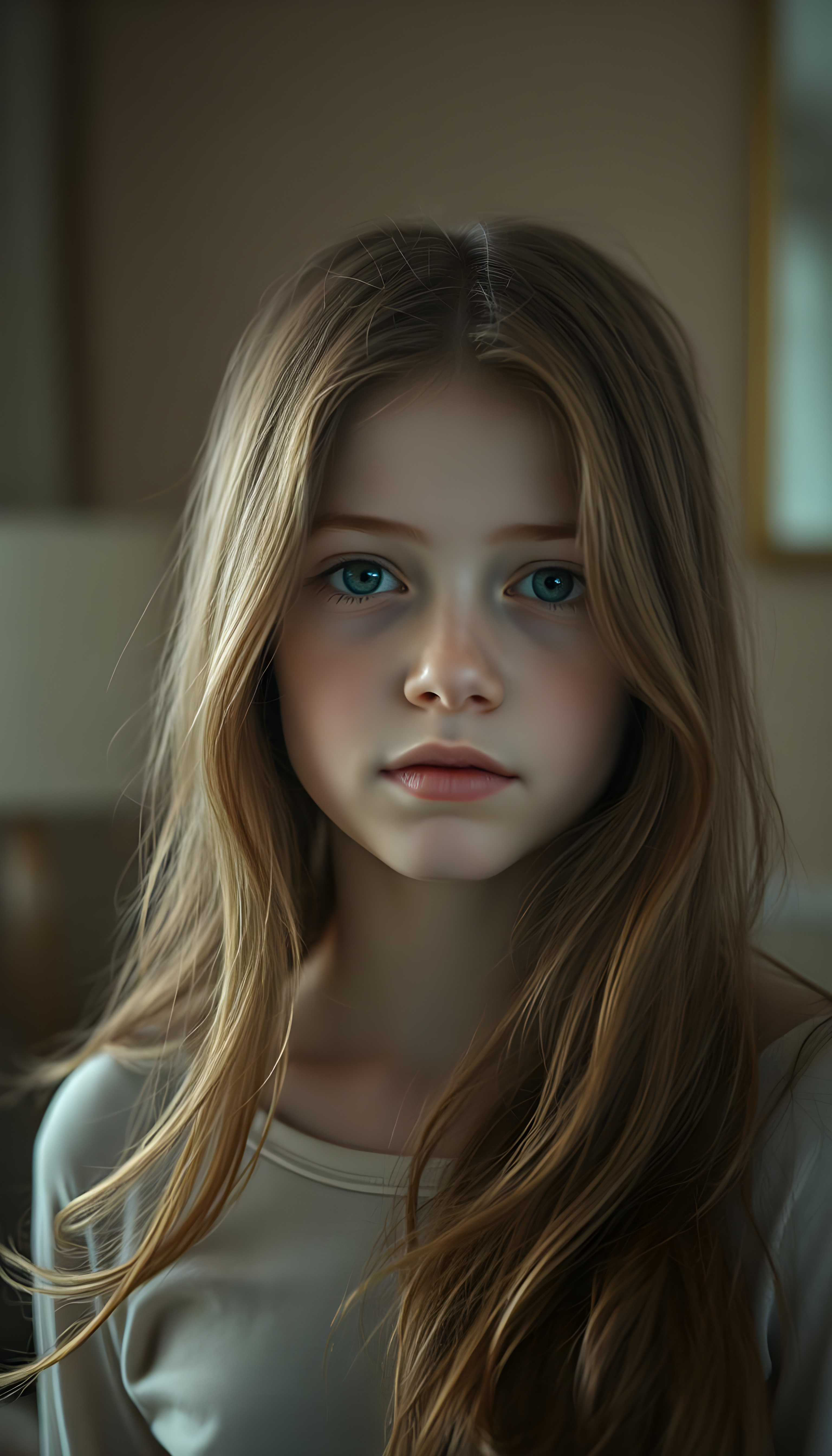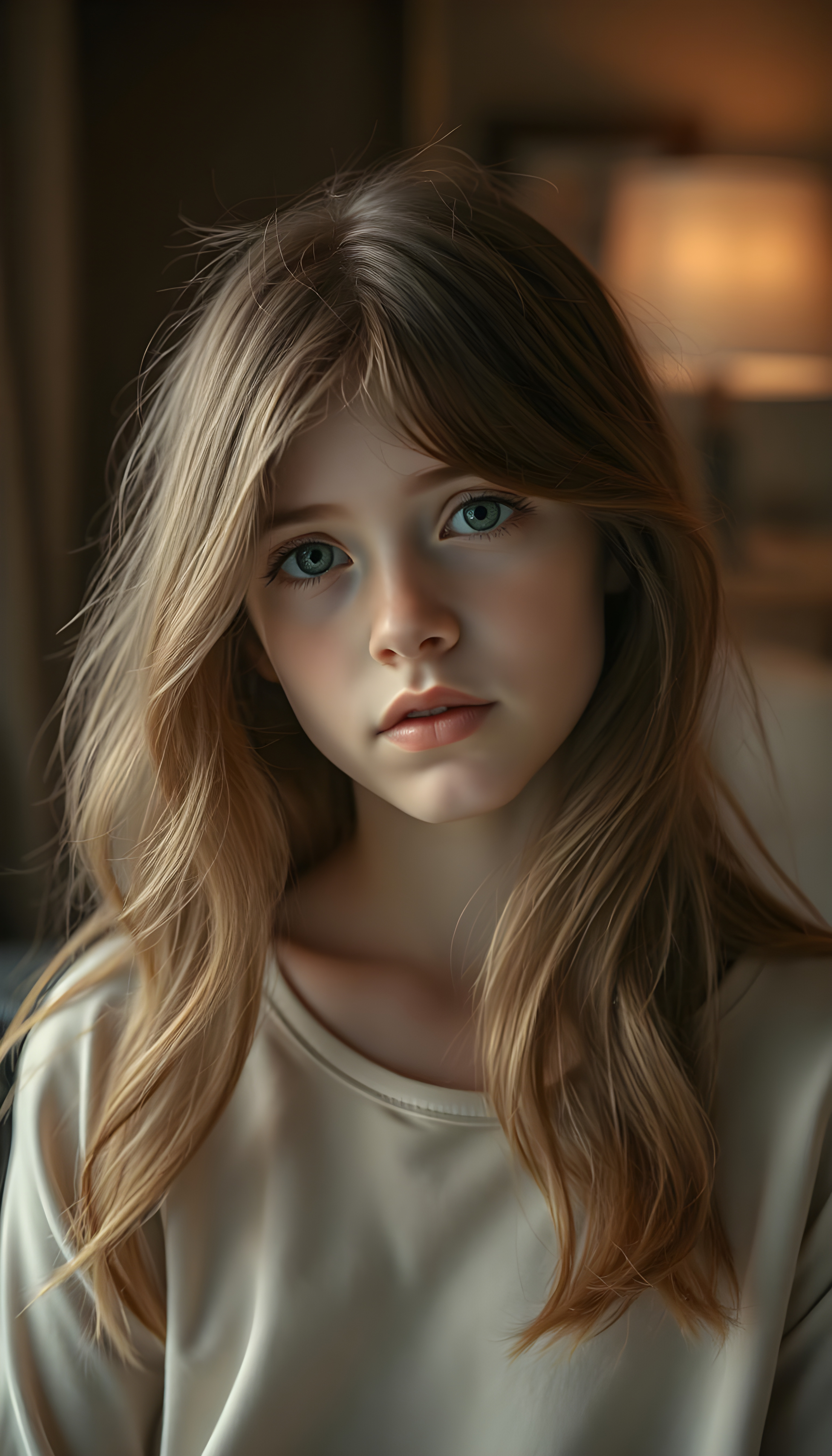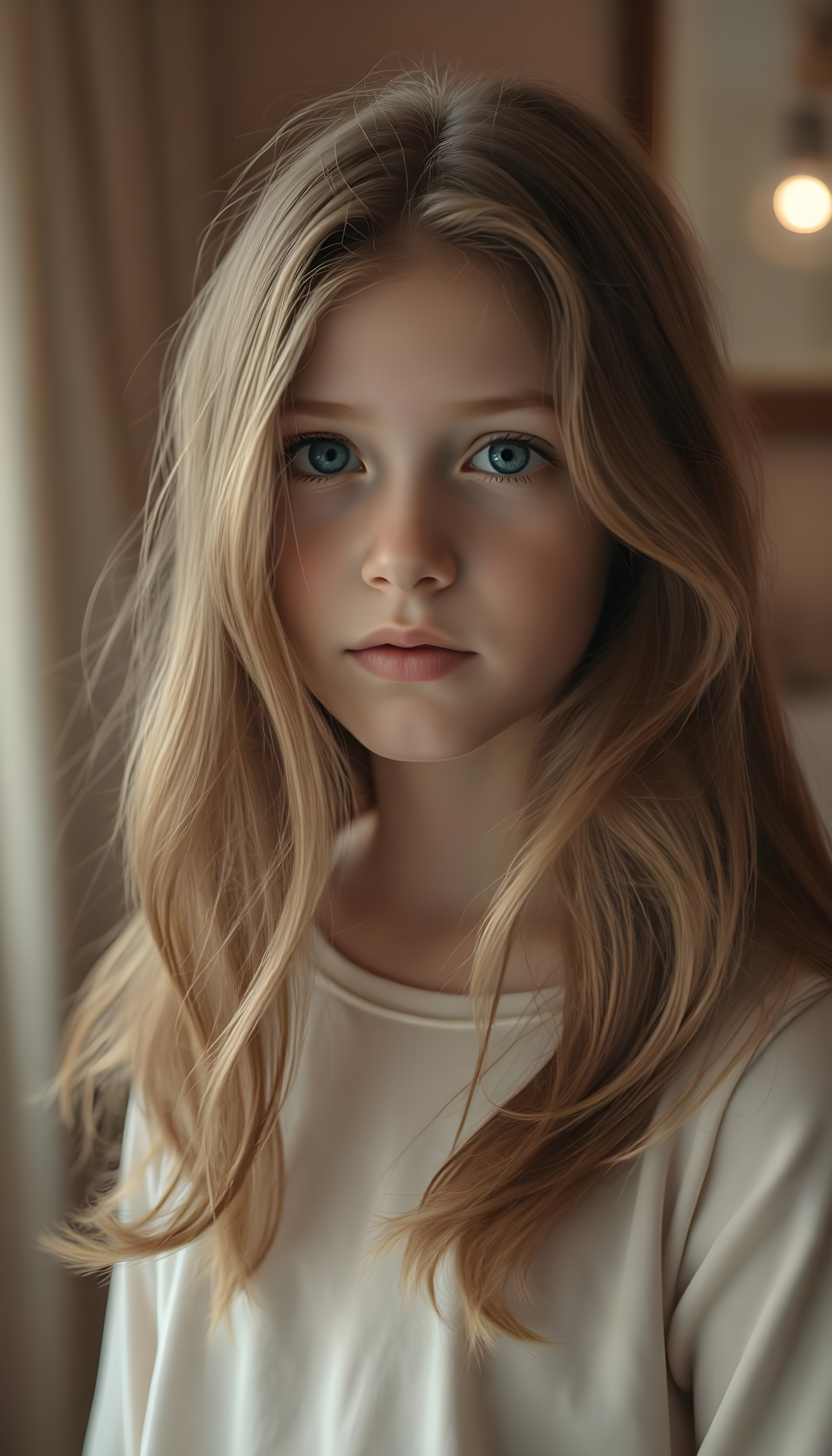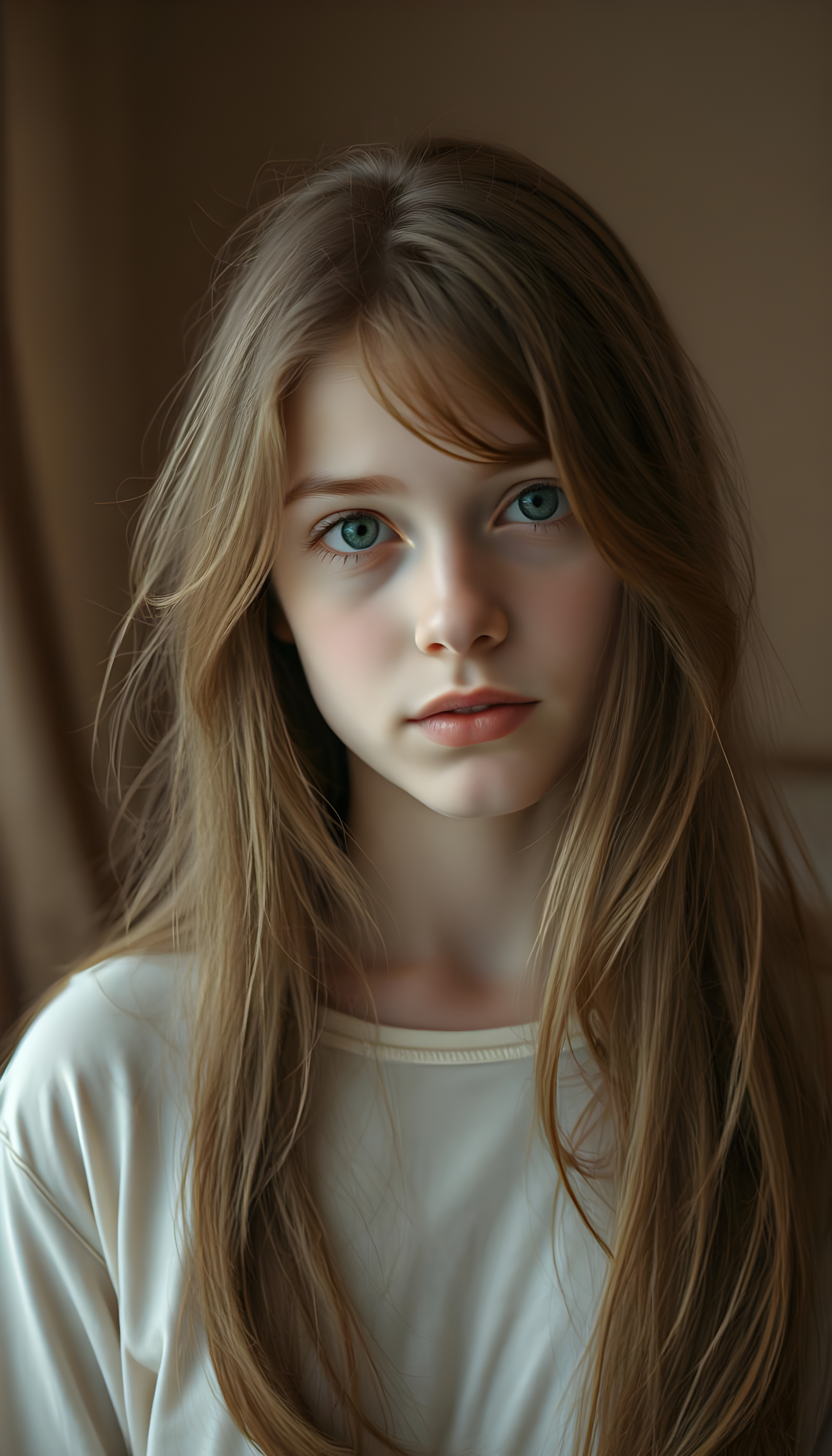 A captivating young girl with flowing, auburn hair that cascades over her shoulders in soft, elegant waves. Her eyes are a luminous sky blue mixed with honey light brown, clear and expressive, standing out against her smooth, porcelain skin. She wears a light cream-colored top, subtly contrasting with the warm tones of her hair. The lighting is soft and diffused, creating a dreamy, intimate atmosphere. The background is gently blurred, with warm, muted colors suggesting a refined, cozy interior. The overall mood is serene and introspective, a quiet, tender moment frozen in time, evoking a sense of gentle melancholy and depth.
