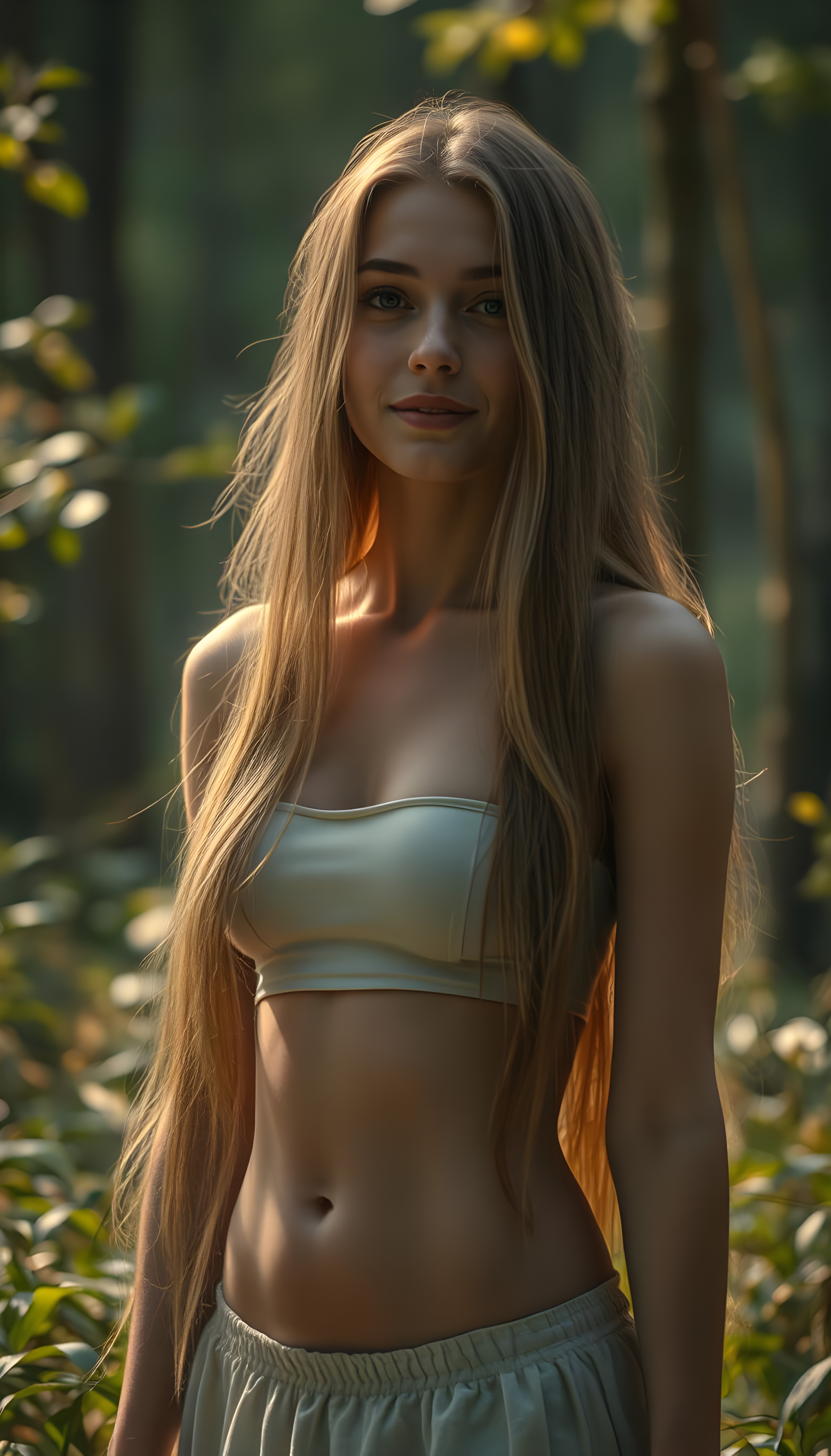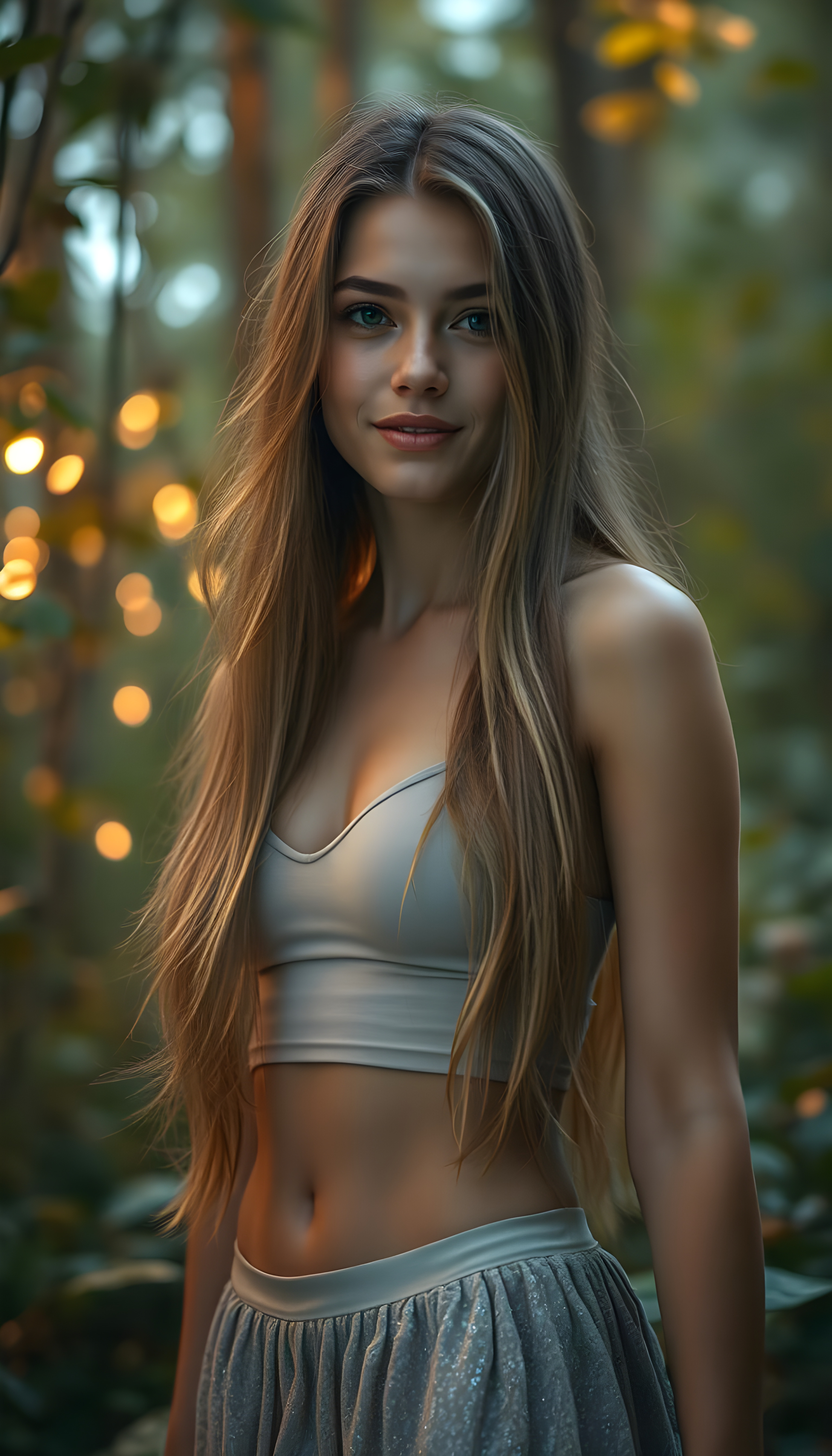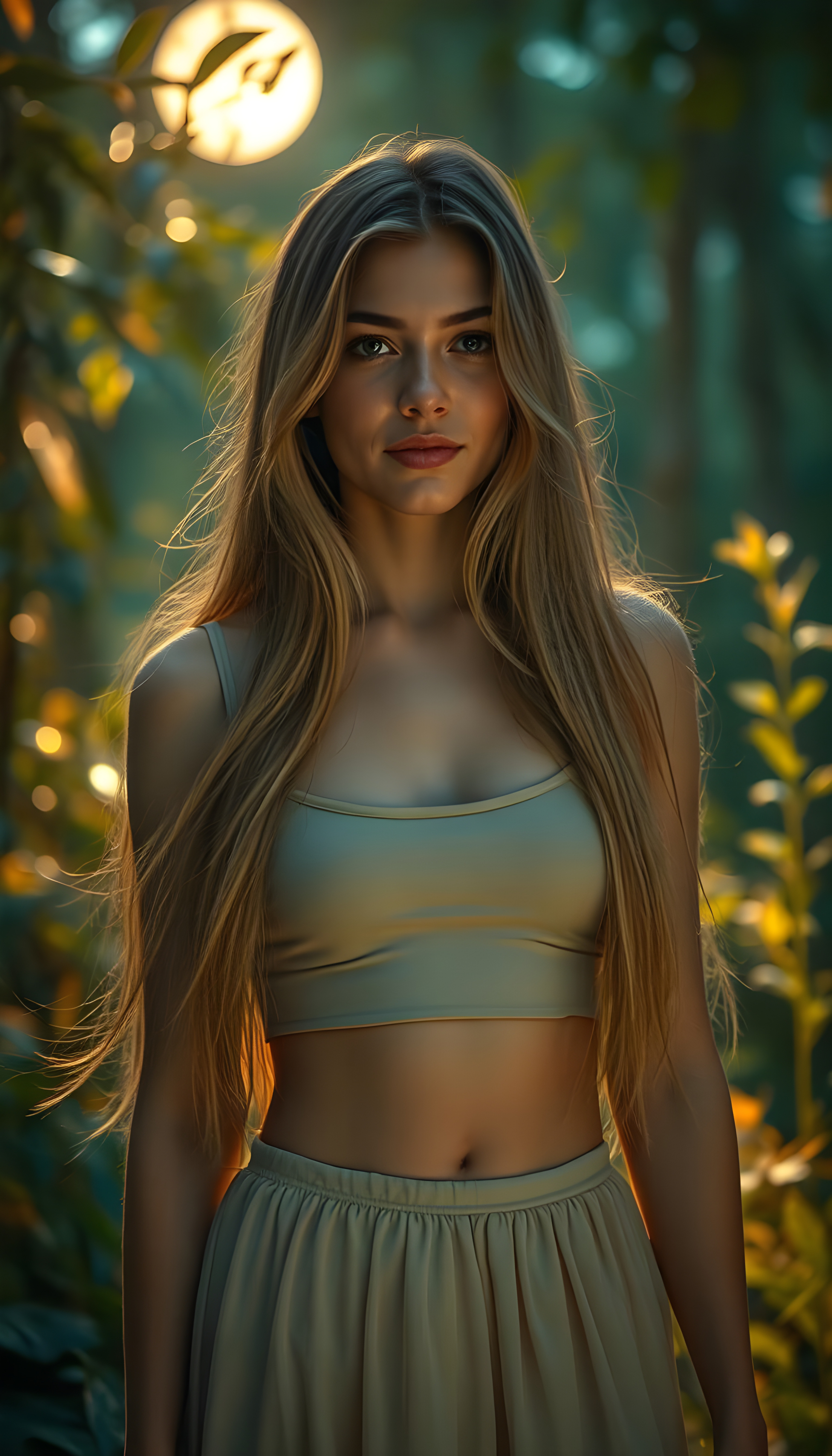 A vibrant, enchanting scene featuring a stunning busty teenage girl with long, flowing hair that cascades like a golden waterfall. Her figure is perfectly sculpted, exuding grace and allure. She stands in a mystical forest, where the trees are aglow with ethereal lights, casting a magical ambiance. The woman wears a short cropped tank top, round mini skirt that shimmers in the soft, moonlit light, blending harmoniously with the serene environment. Her eyes sparkle with wisdom and kindness, and her smile is warm and inviting. The background is filled with lush, vibrant flora and fauna, with a soft, dreamy color palette dominated by shades of green, gold, and pastel hues, creating a whimsical and enchanting atmosphere. The overall composition is both dynamic and tranquil, capturing the essence of beauty and serenity.