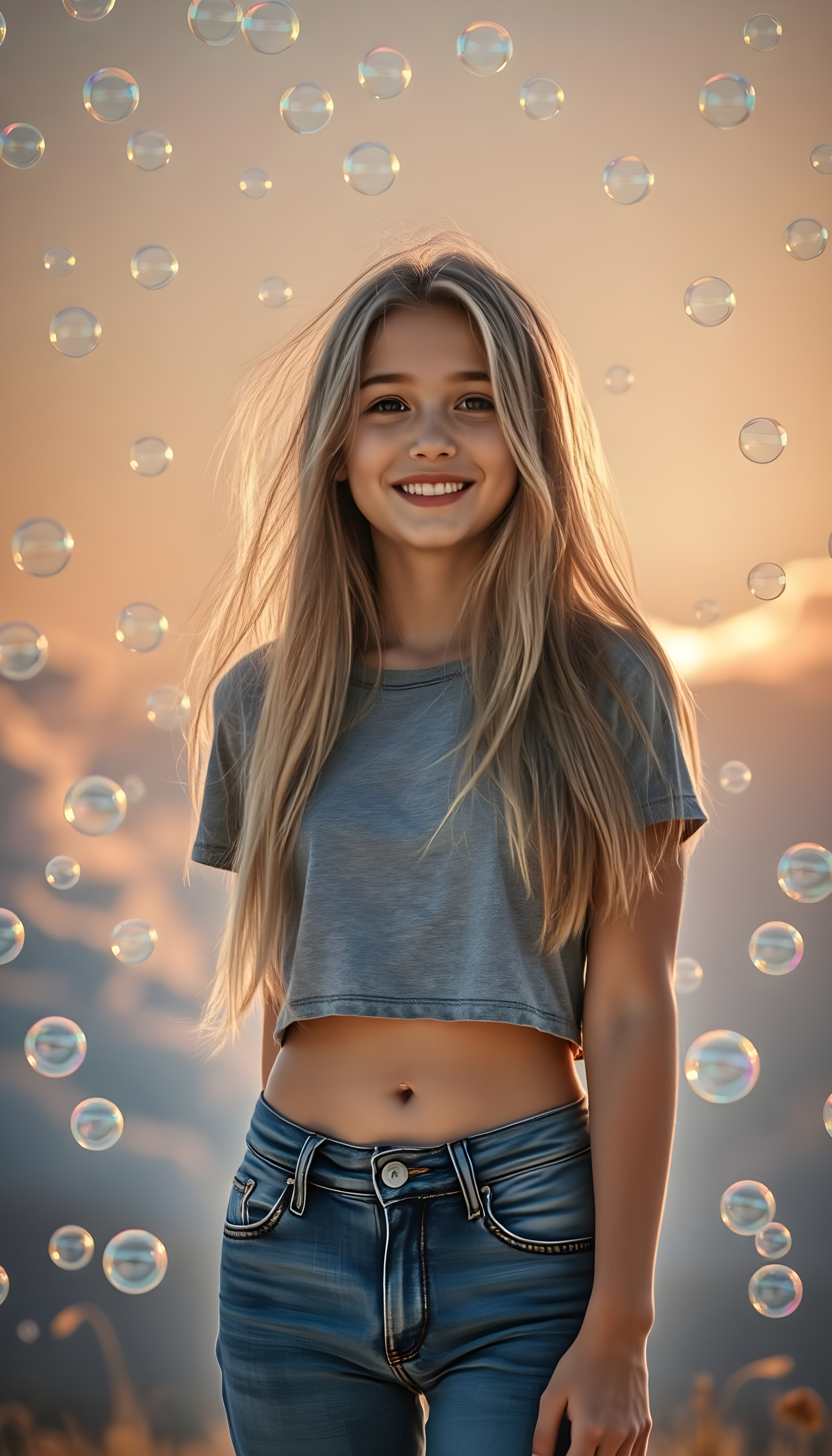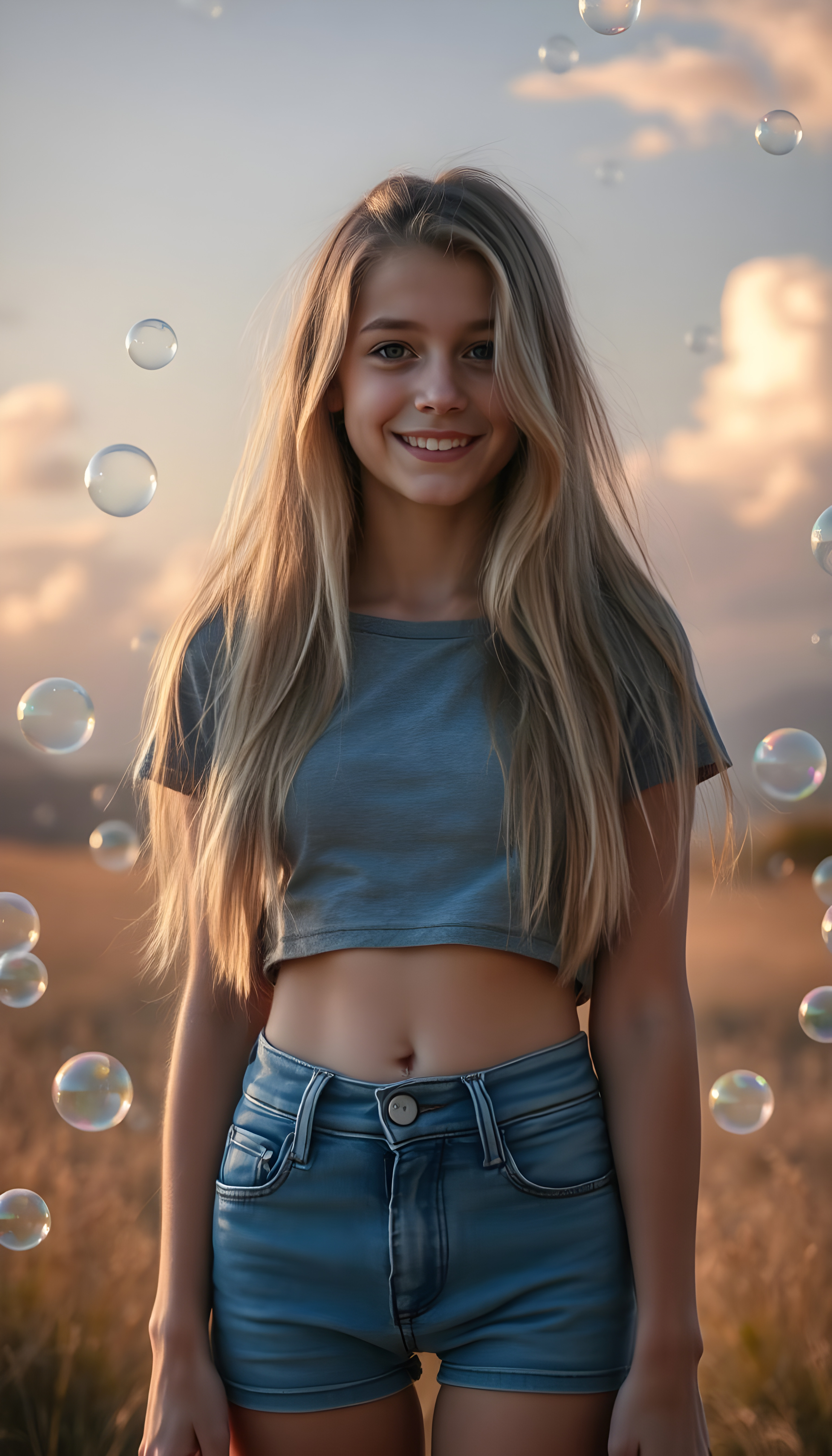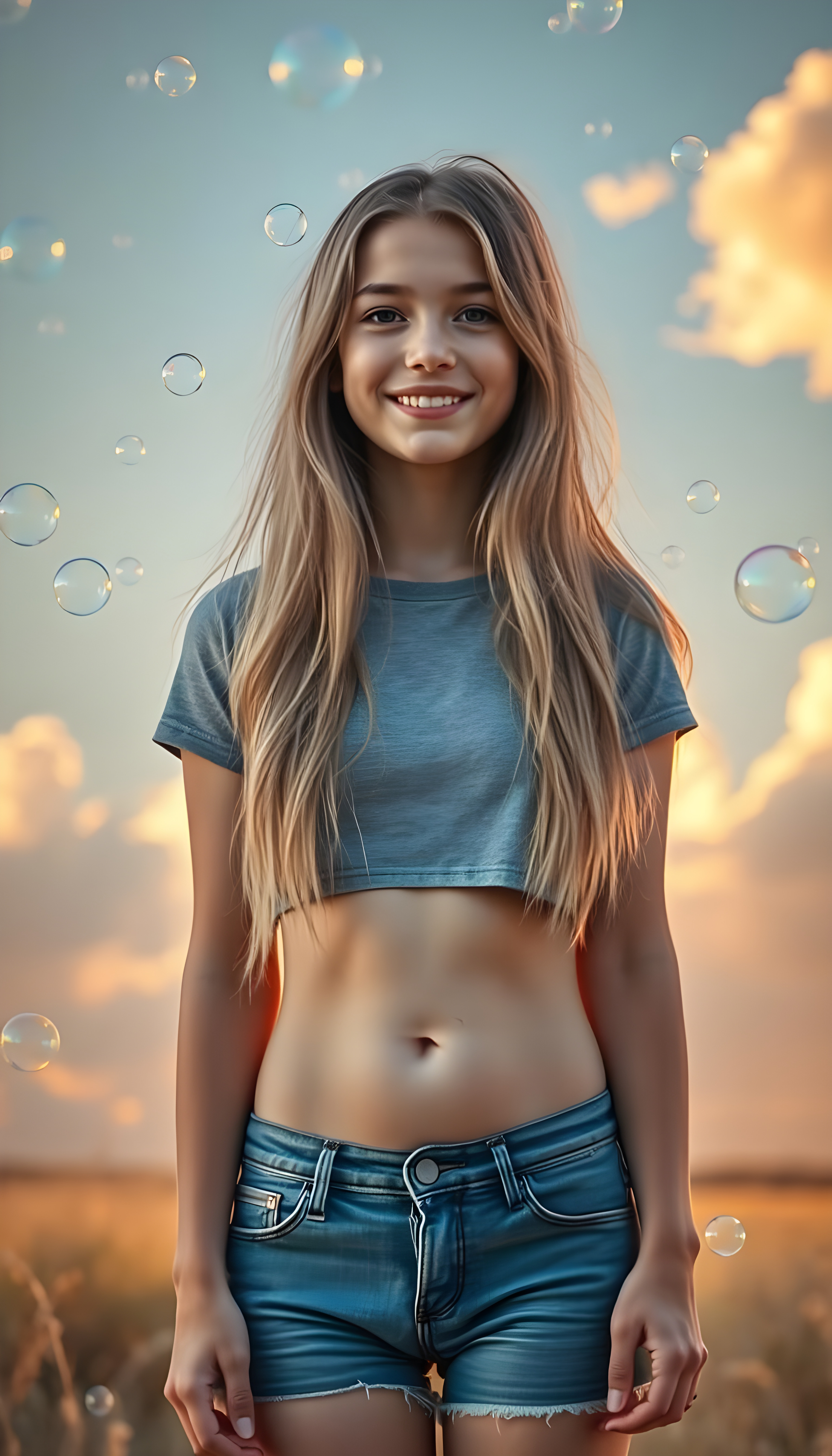 A whimsical scene where a young woman with long, soft, golden hair stands confidently in the foreground, her blue short denim jeans contrasting against the soft grey of her cropped t-shirt. She has a cute round belly button. She is surrounded by a magical cascade of iridescent soap bubbles that float and shimmer in the air, creating a sense of wonder and enchantment. The background is a dreamy, pastel-colored landscape with fluffy clouds and a soft, golden sunset, casting a warm glow over the entire scene. The lighting is soft and ethereal, enhancing the magical atmosphere. The girl’s expression is one of joy and curiosity, capturing the viewer’s imagination and inviting them into this enchanting world.