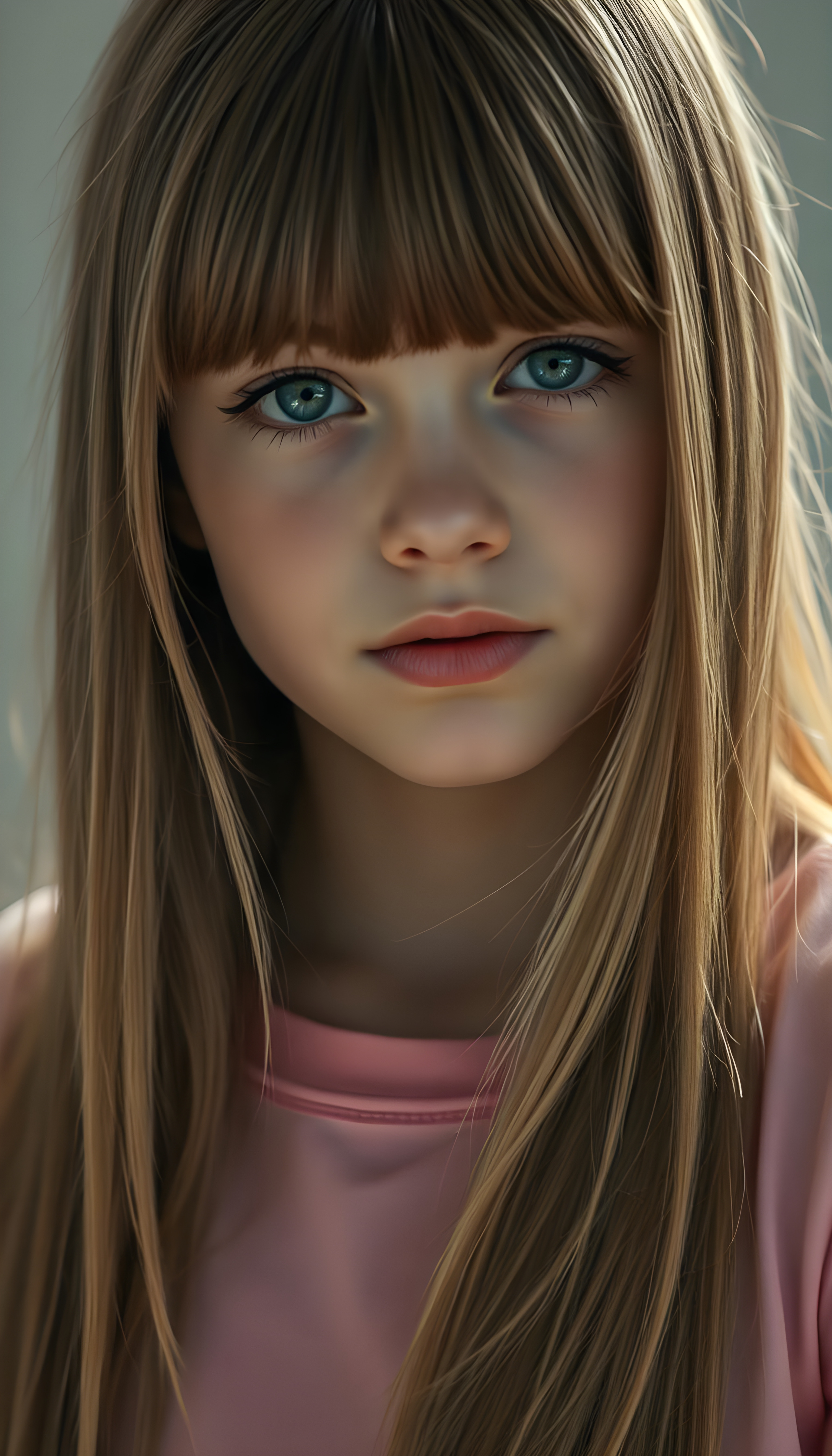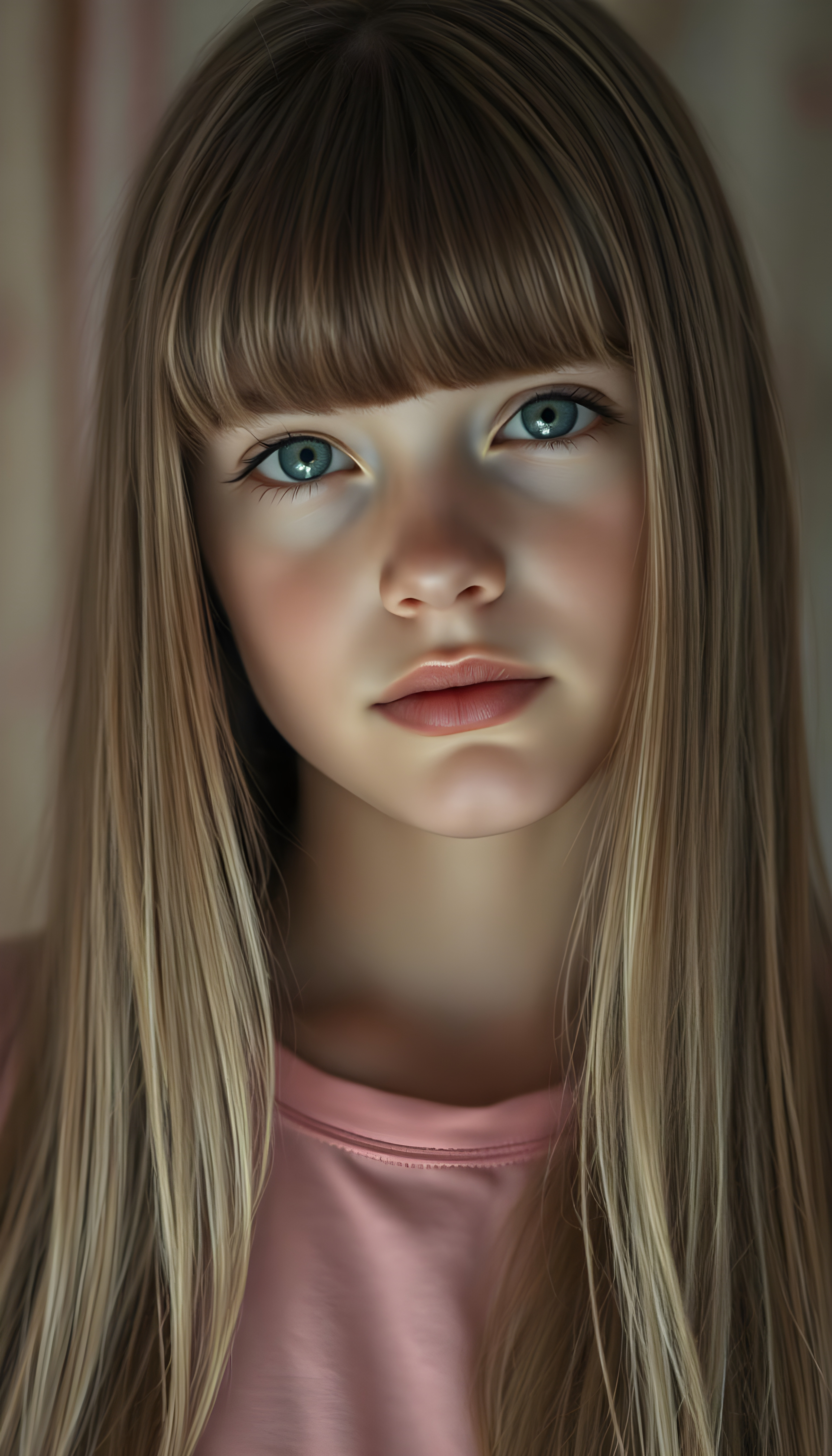 An upper body photo from a young girl, her fine, shiny very long amber straight hair with blonde highlights falls like a waterfall over her body. Bangs frame her face. She has a soft, round face, deep blue round eyes, and full, plump lips, white teeth, flawless skin. Soft light falls on her face. Her eyes reflect the light. Romantic touch. She appears very peaceful and calming. Blurred background in soft pastel colors. She wears a pink T-shirt that shows off her perfectly shaped body.