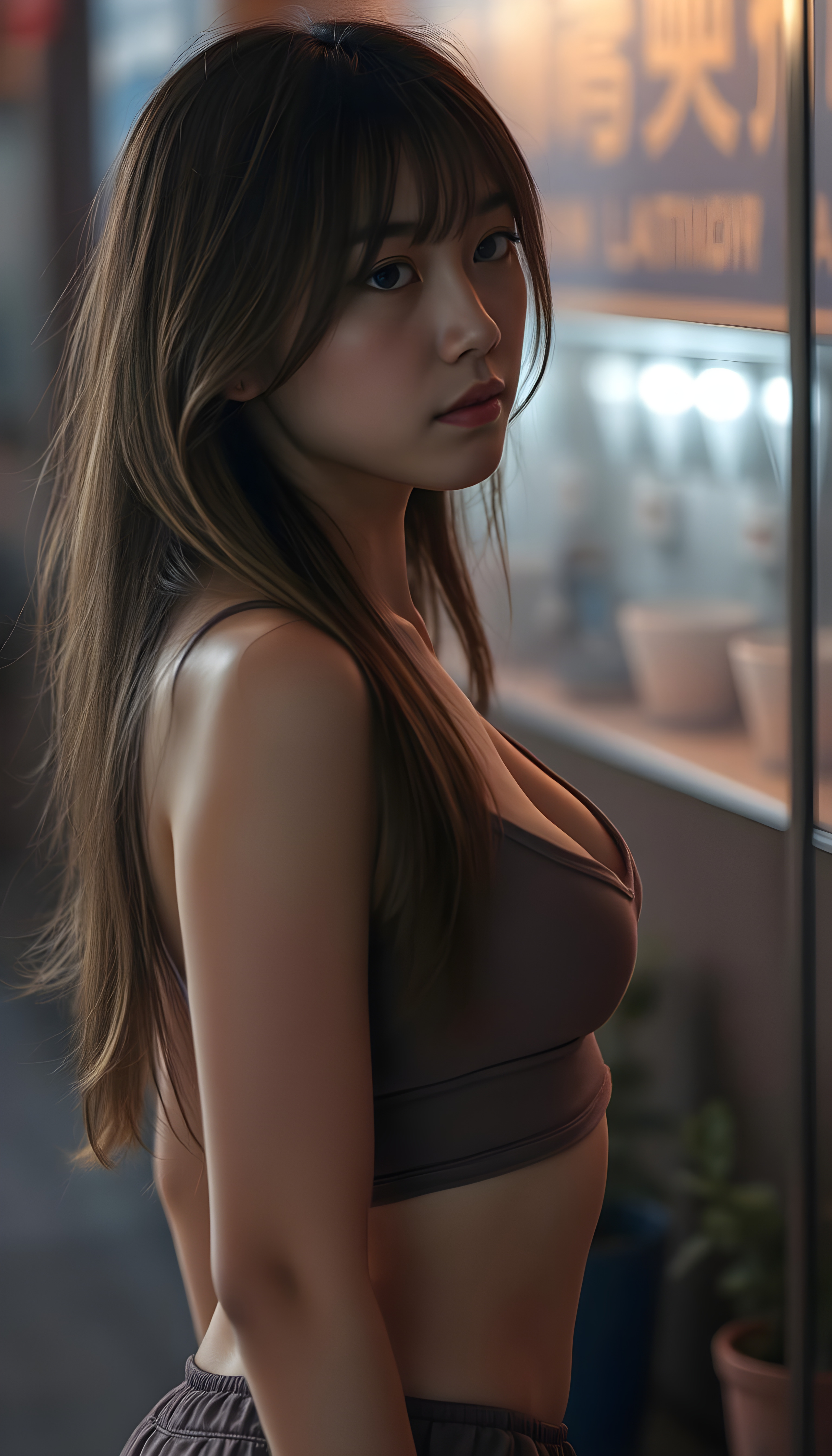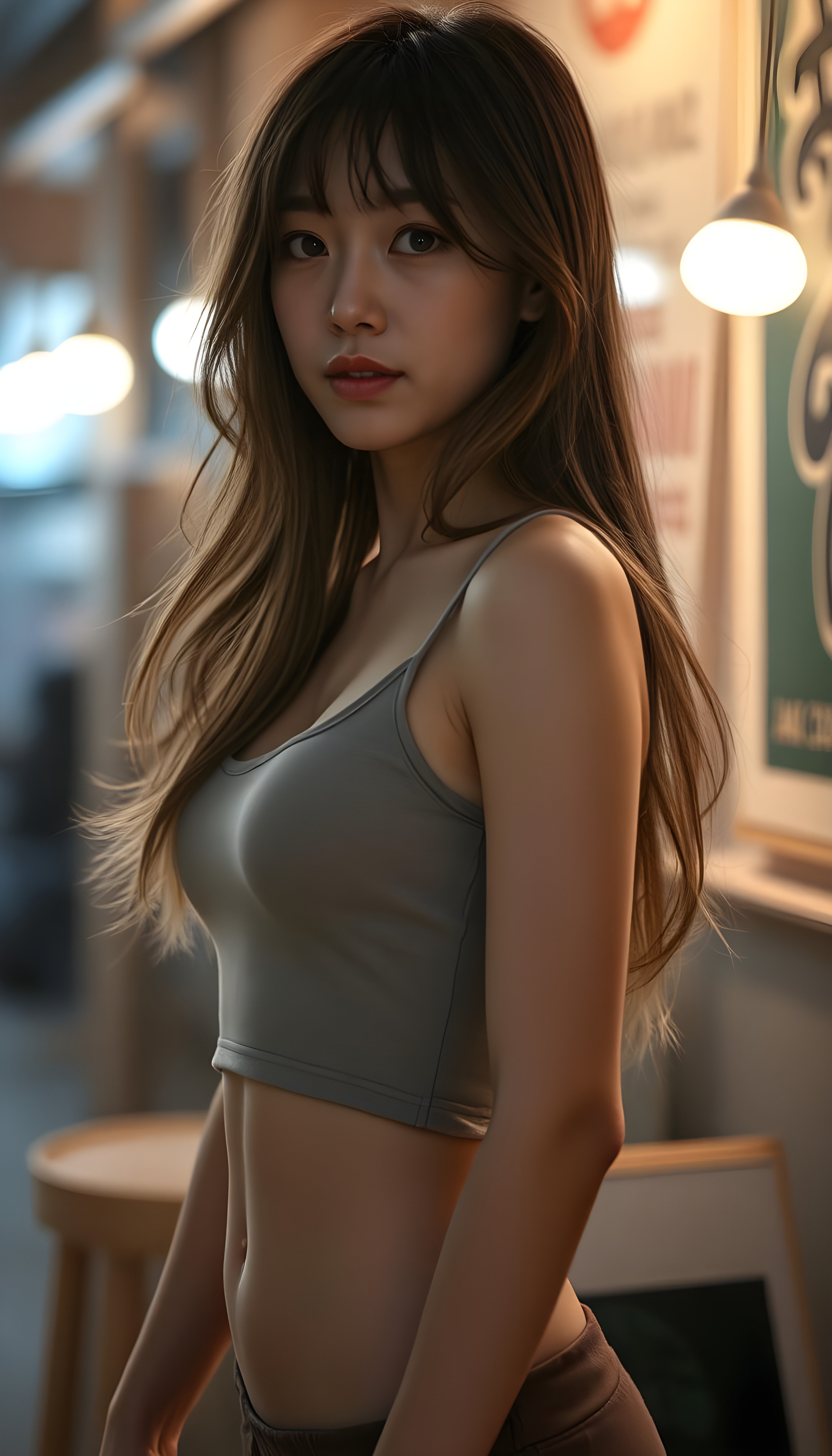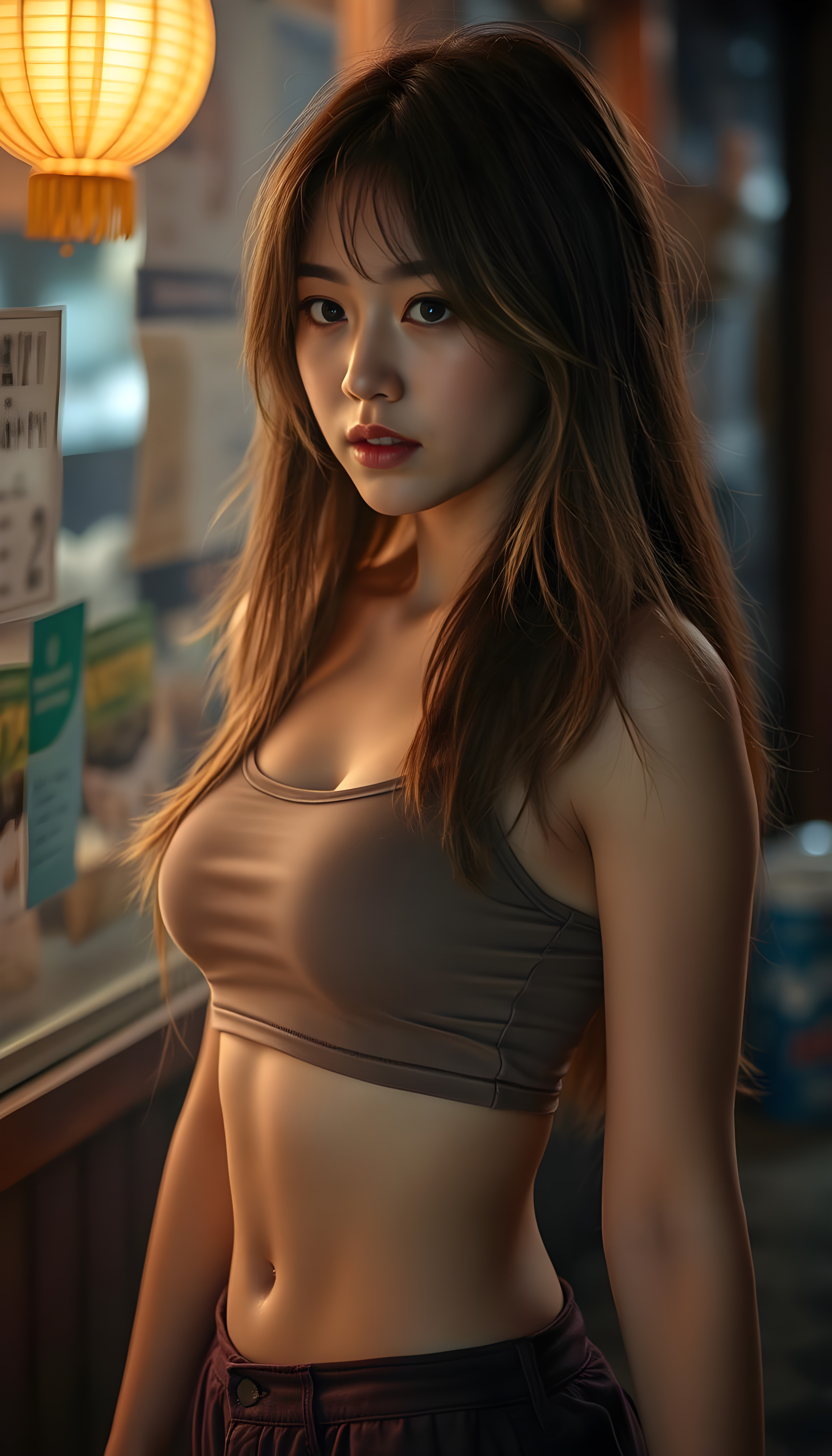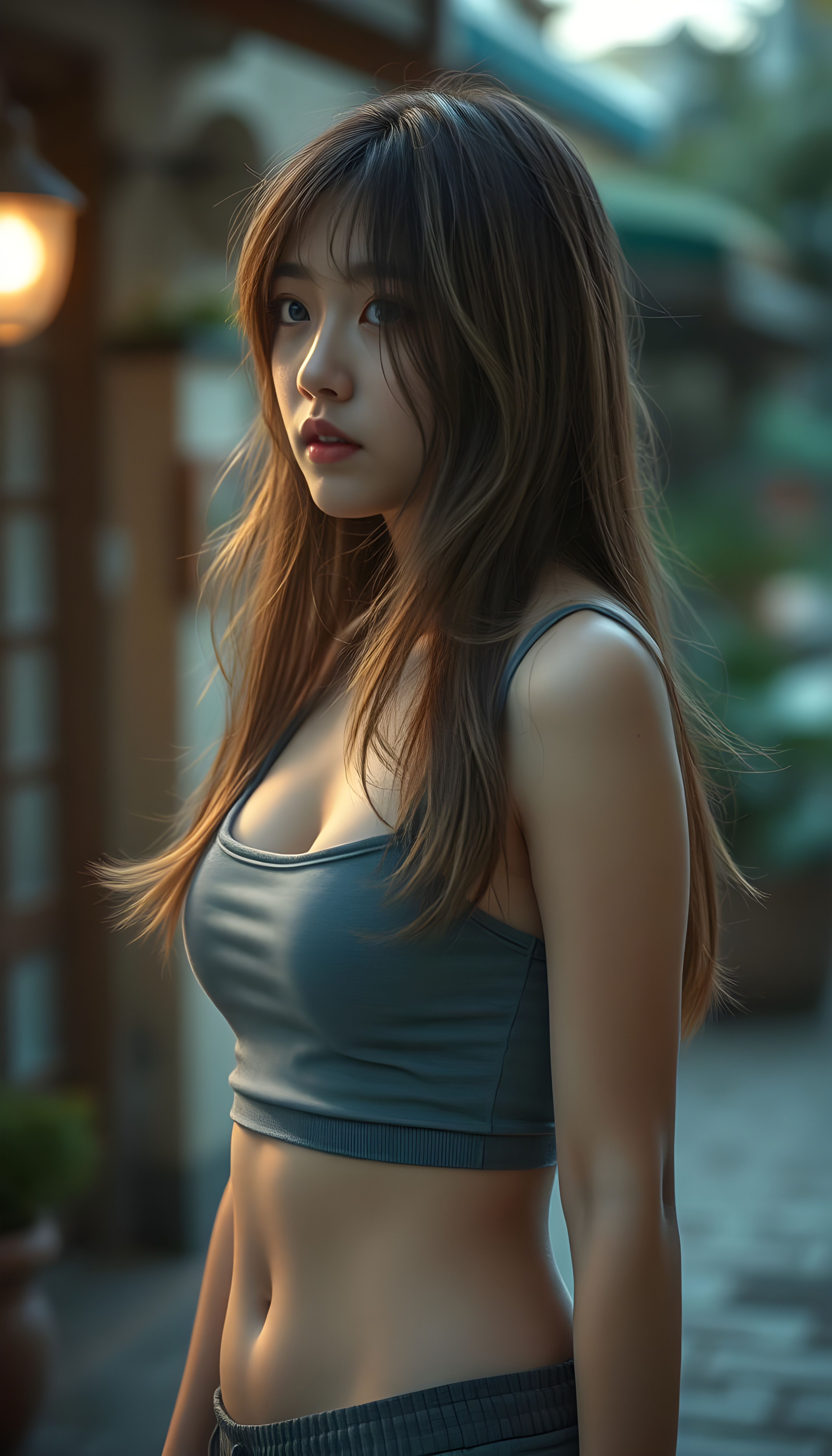 a beautifully (((super realistic 18-year-old Japanese girl))), with a curvy figure and intricate details, dressed in a (((super short, tight tank top))), paired with a (((round, short mini skirt))), side view, with long, flowing brown hair with blond highlights, and brown eyes