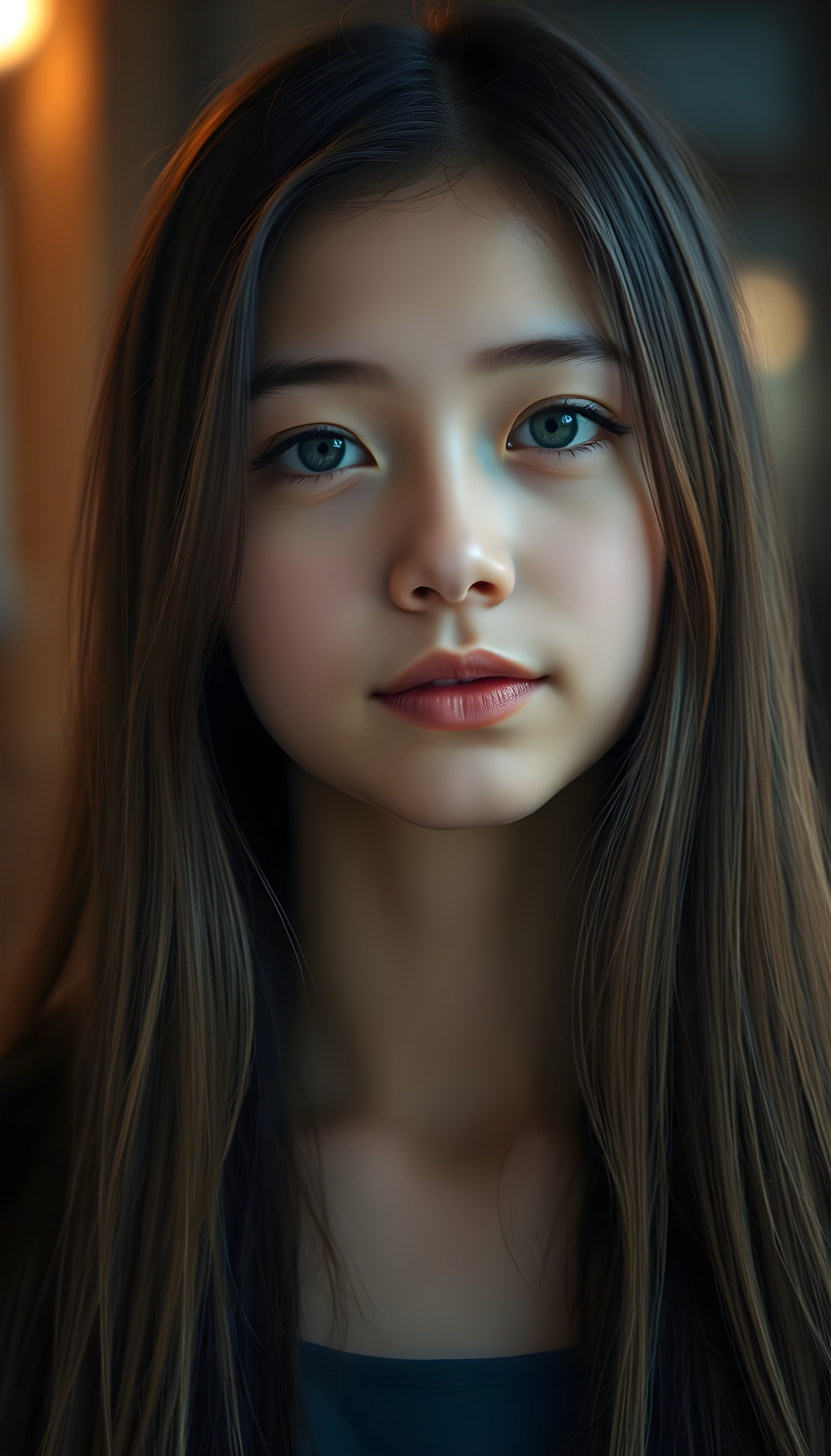 A gentle girl with delicate, long, straight hair, her head slightly tilted, her eyes sparkling like sapphires, her lips a soft rosy hue, her face perfectly symmetrical, gazing warmly at the viewer