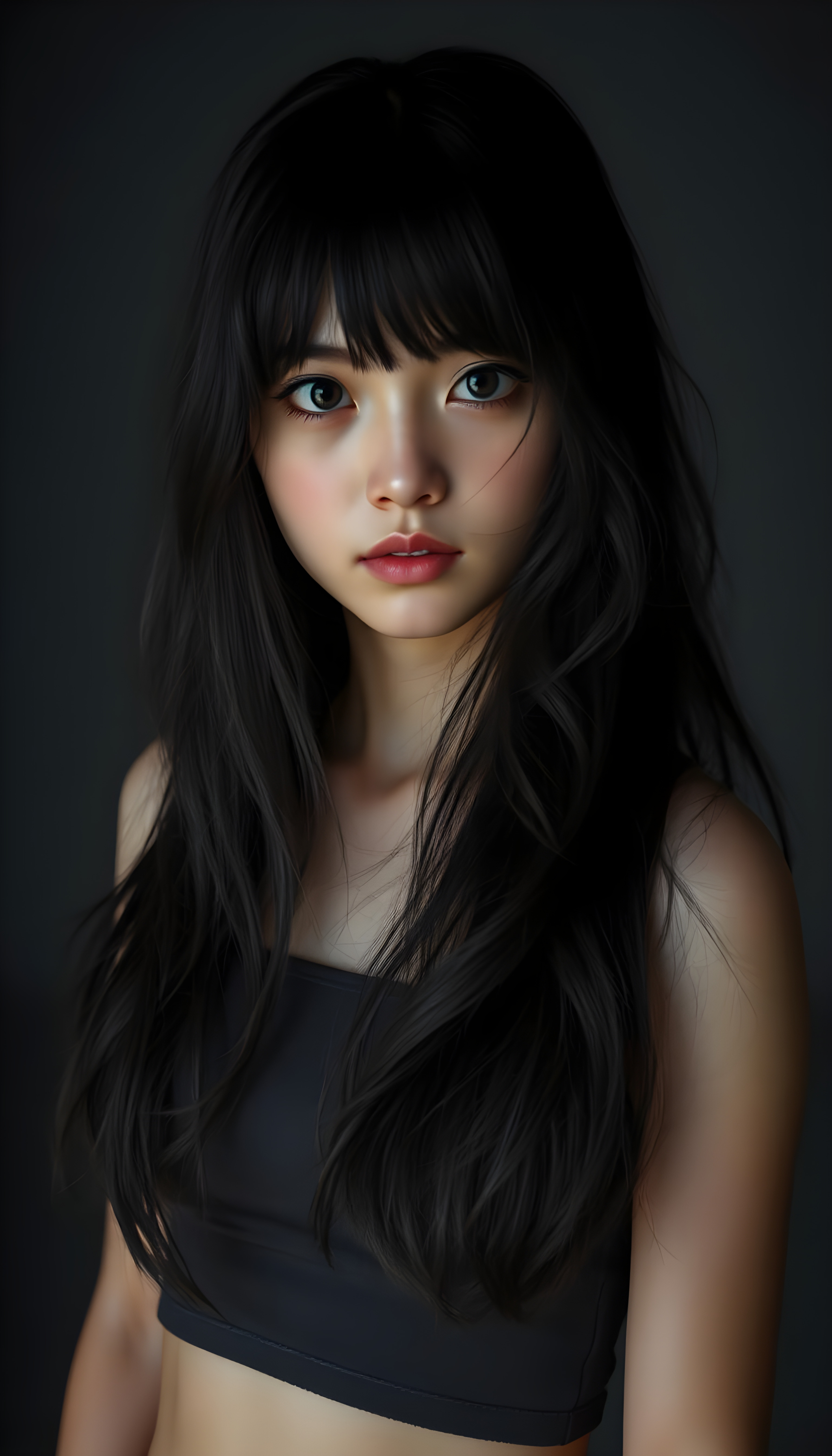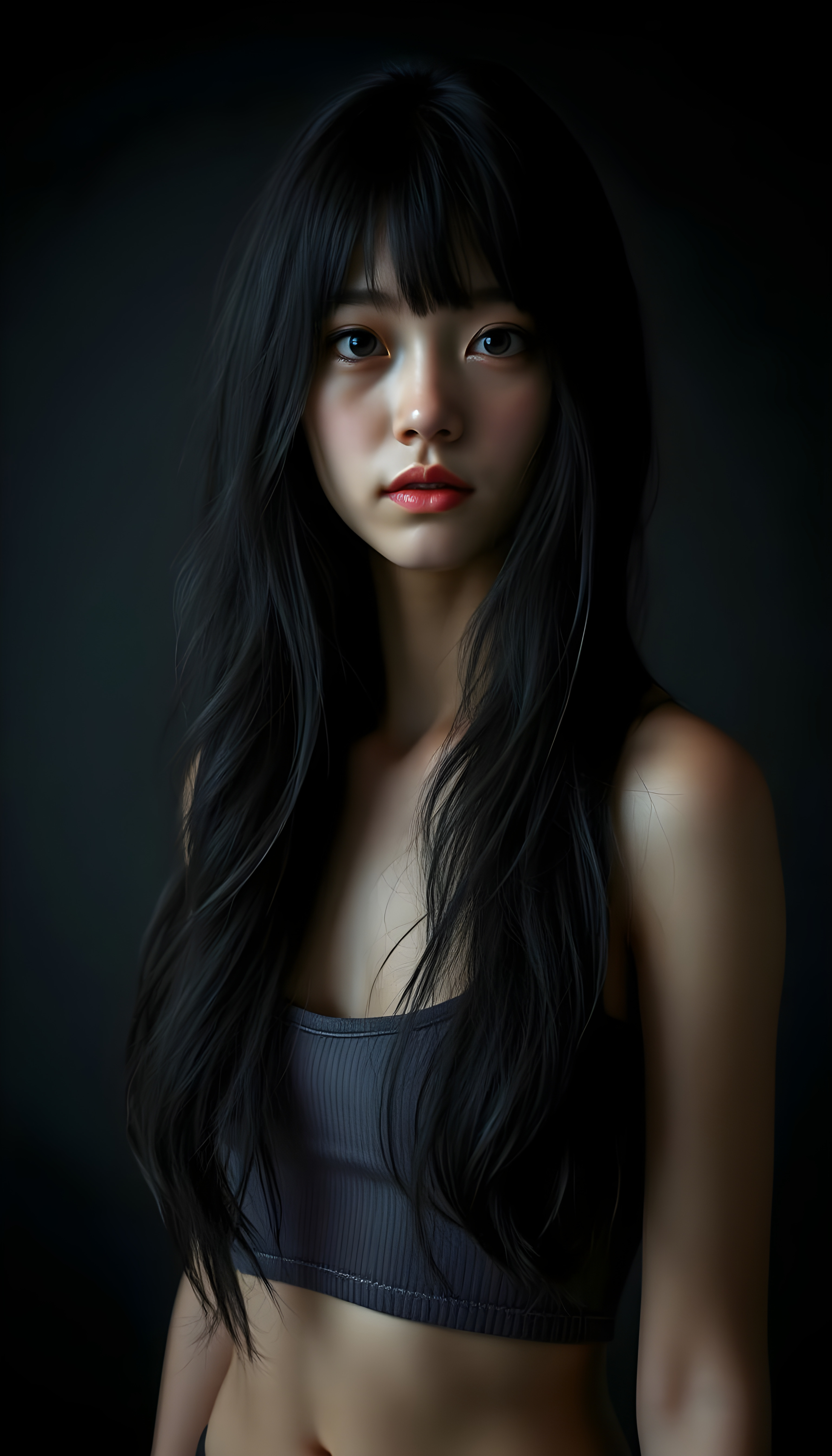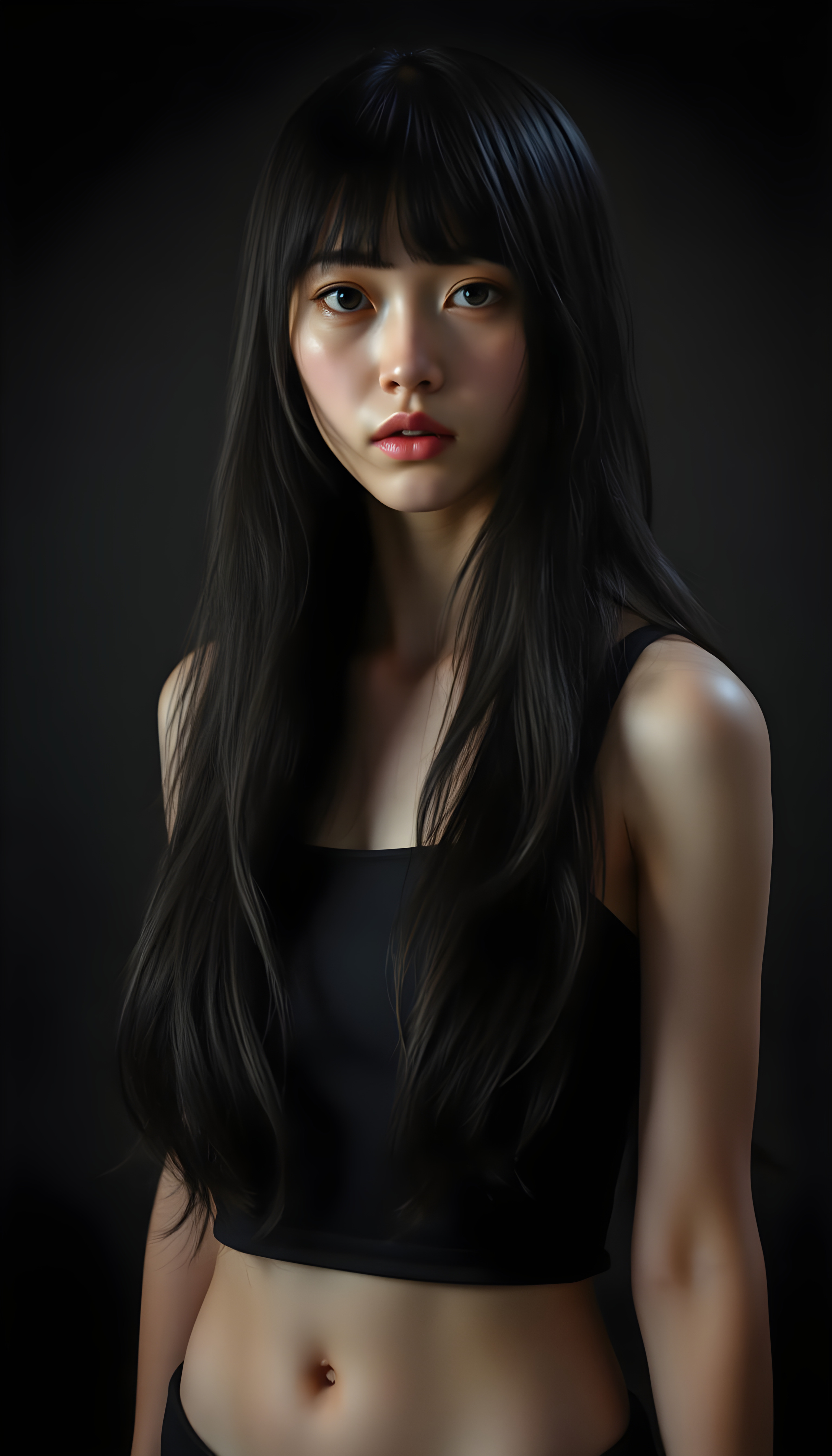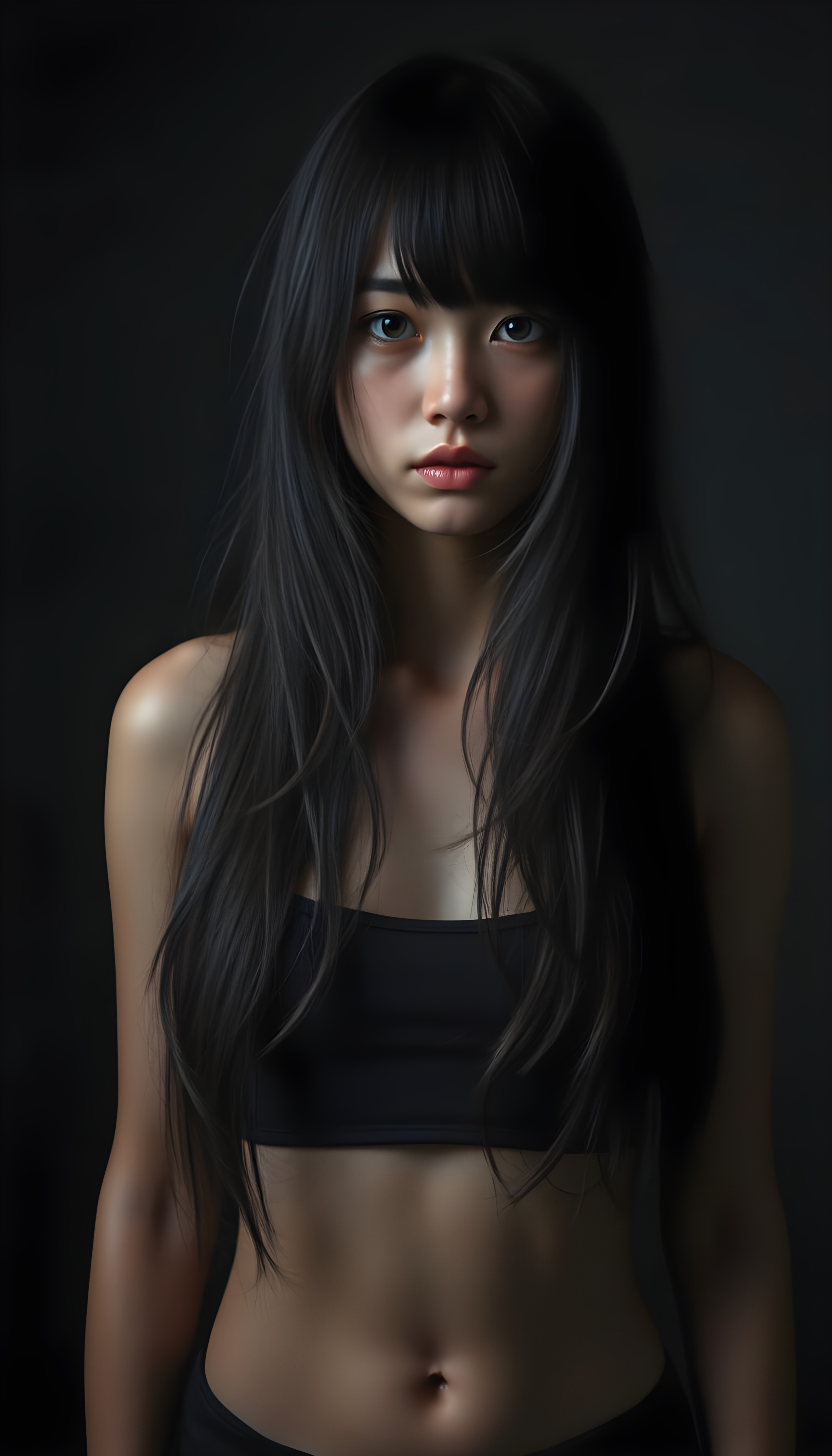 a (((super realistic and highly detailed full-body photo))), capturing a (((beautiful and innocent Asian Emo girl))) with (((very long, thick, wavy black hair))), and (a short, cropped tank top), she stands in a (dark, gloomy setting) with (volumetric lighting) that brings out her (natural features) and (beautiful eyes), set against a (plain, dark backdrop) that focuses on her face, with (black hair) (perfect, accurate anatomy) and (high quality, high detail) that make her a (super-realistic, 3D character)