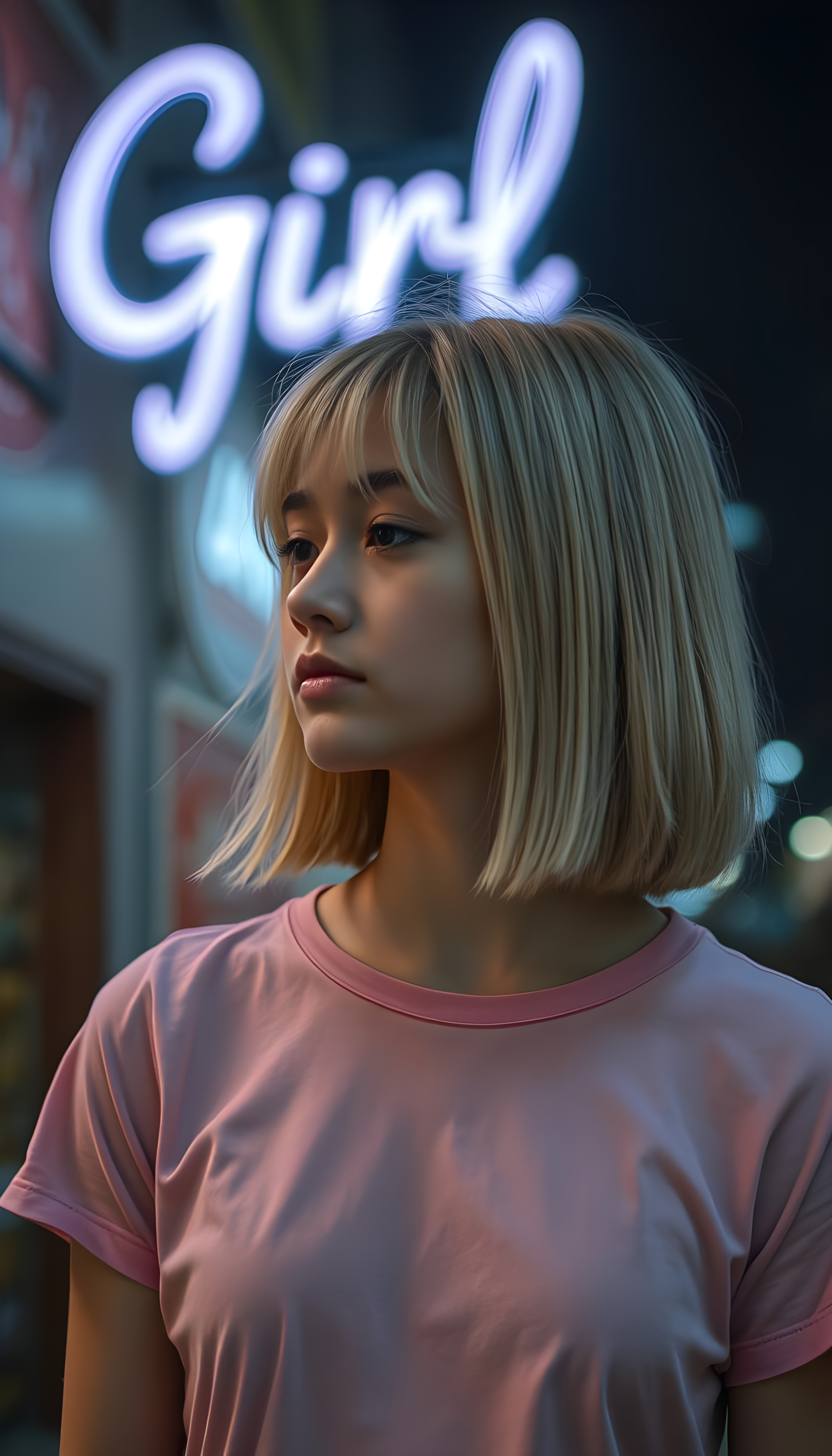 a teen girl dressed in a plain pink thin t-shirt, against a nightly background, straight open shoulder length blond hair in same length left and right and bob cut, side view, In the background you can see a neon sign with the word «Girl»