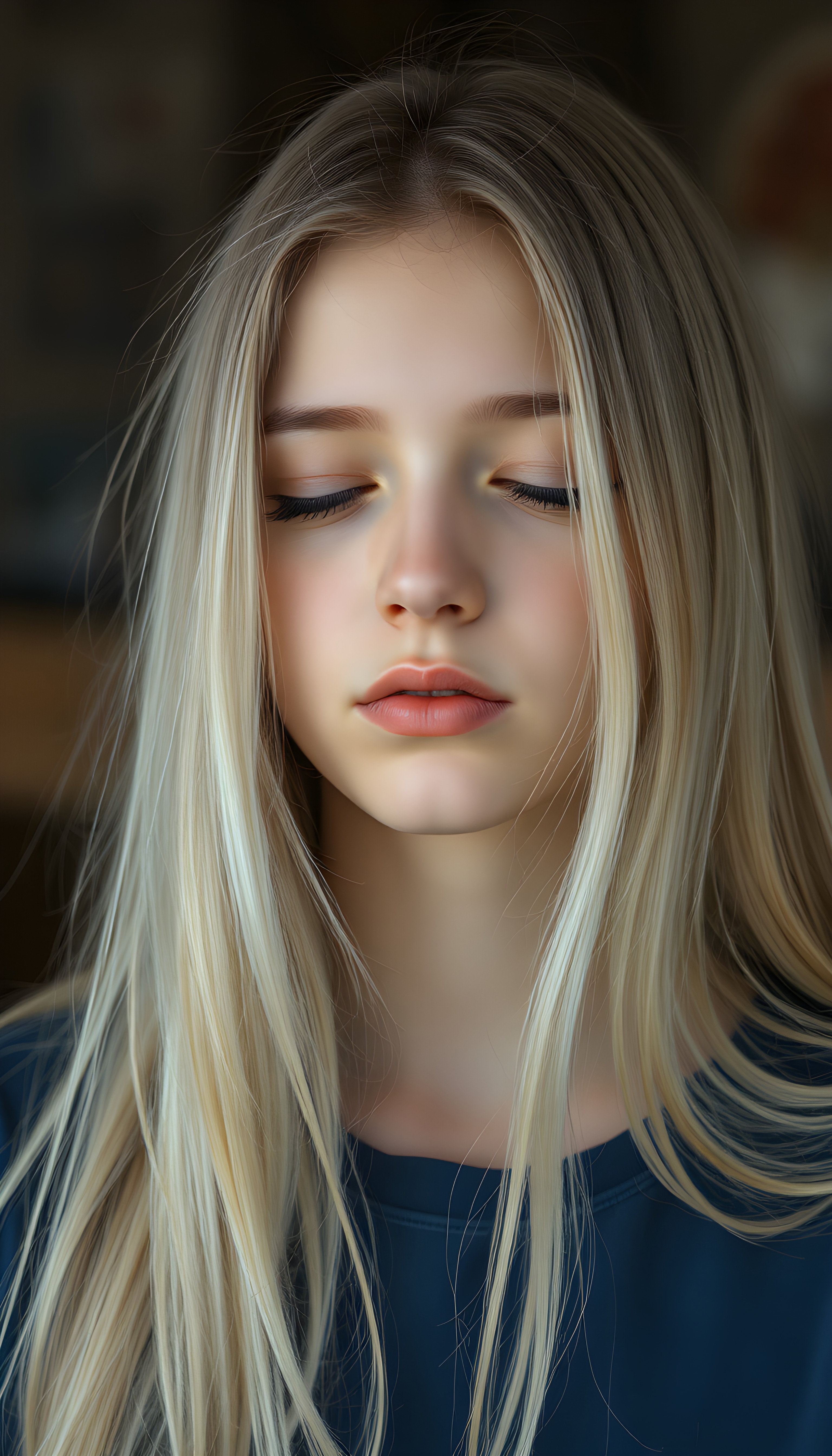 A teen girl. Her eyes are closed. Peaceful face. Long, white soft open hair falls over her upper body and is the same length on the right and left. She wears a deep blue t-shirt.