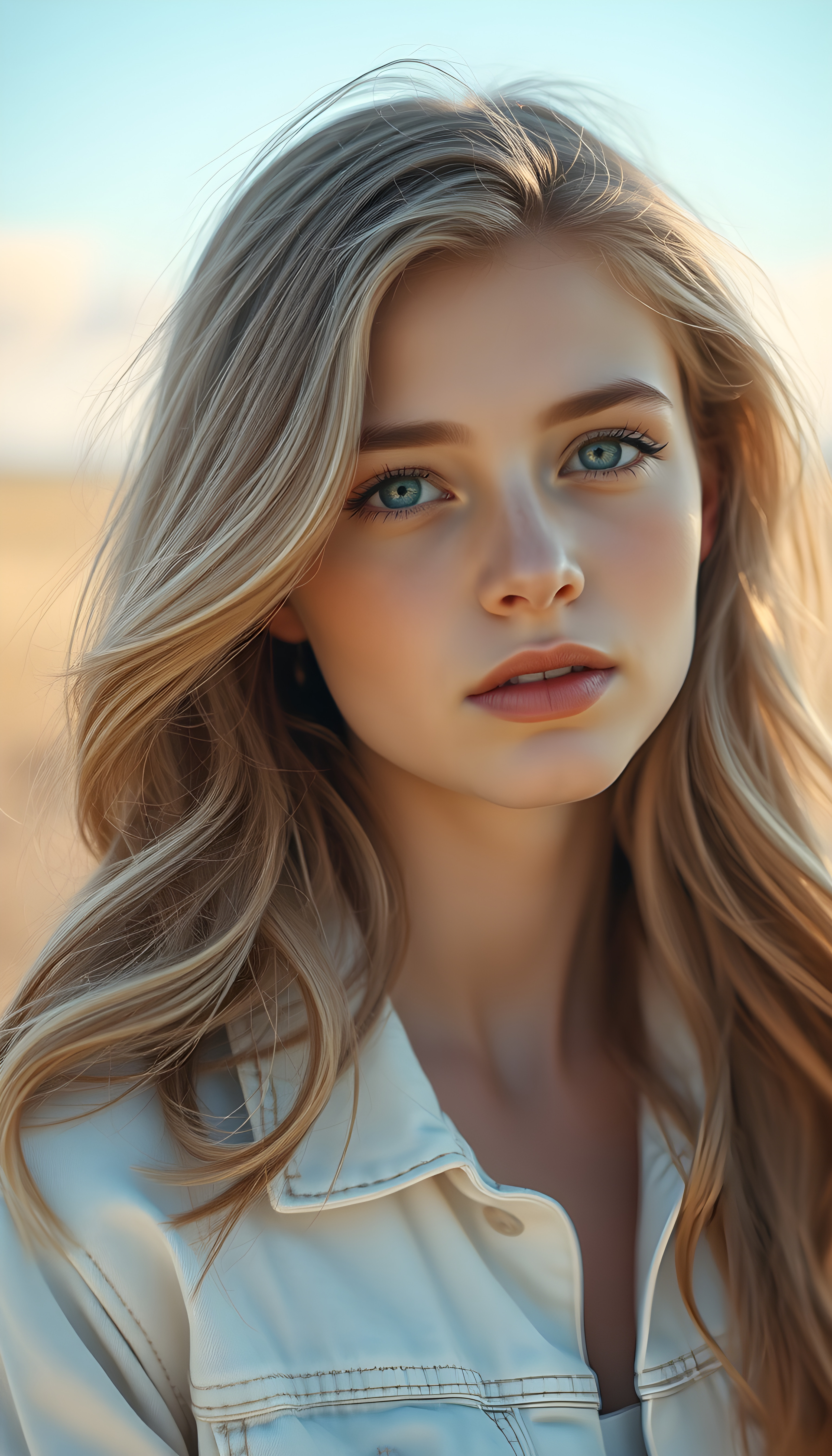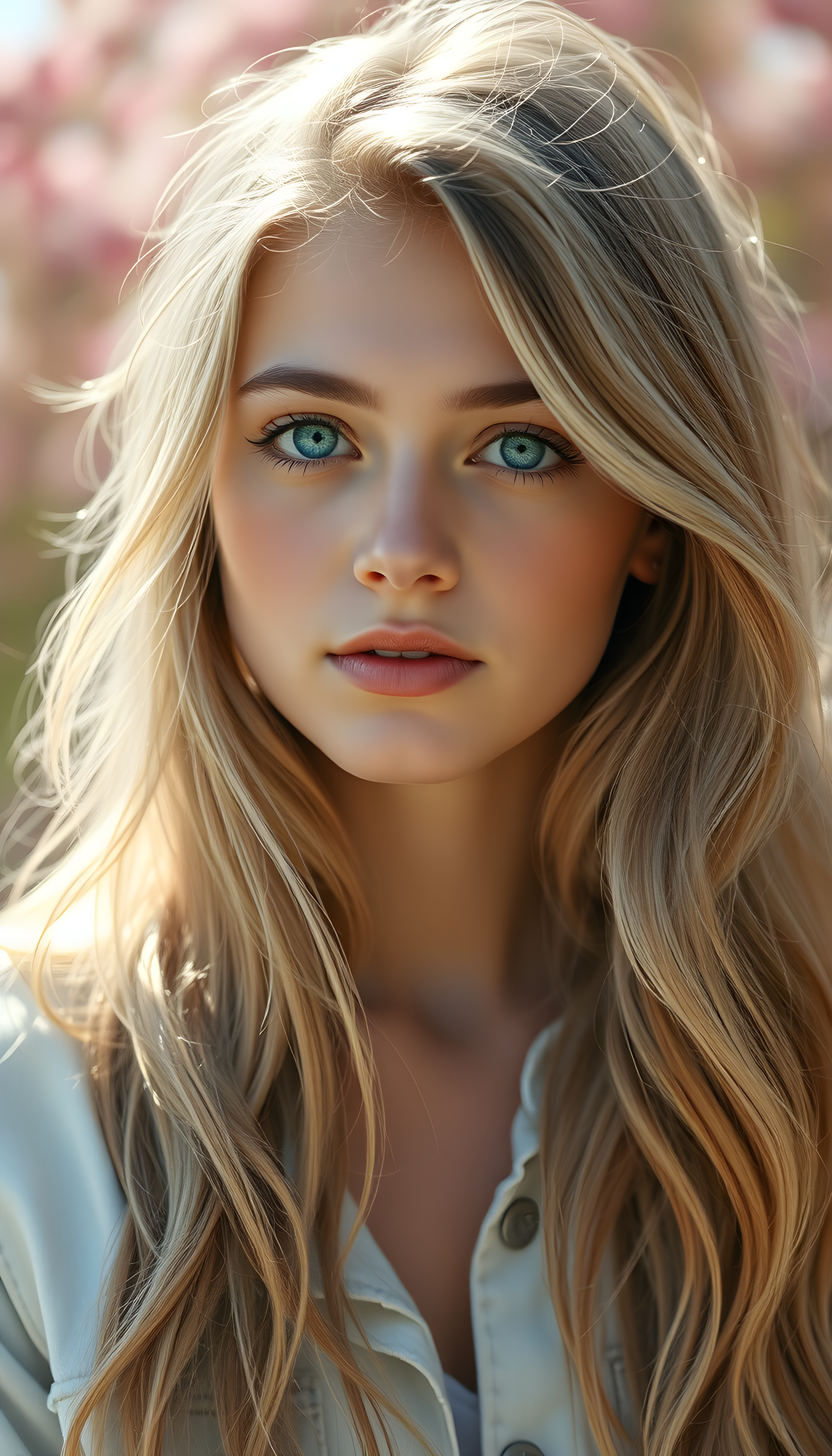 a pastel painting showcasing a young woman with long, flowing light blonde hair with brown highlights that gently curls at the ends, her bright blue eyes sparkling like the morning sky. She wears a white denim jacket, reflecting the sunlight in a soft, ethereal glow. Her angelic face is round, adding a touch of whimsy. The background is a dreamy blend of pastel pinks, blues, and greens, creating a serene and enchanting atmosphere.