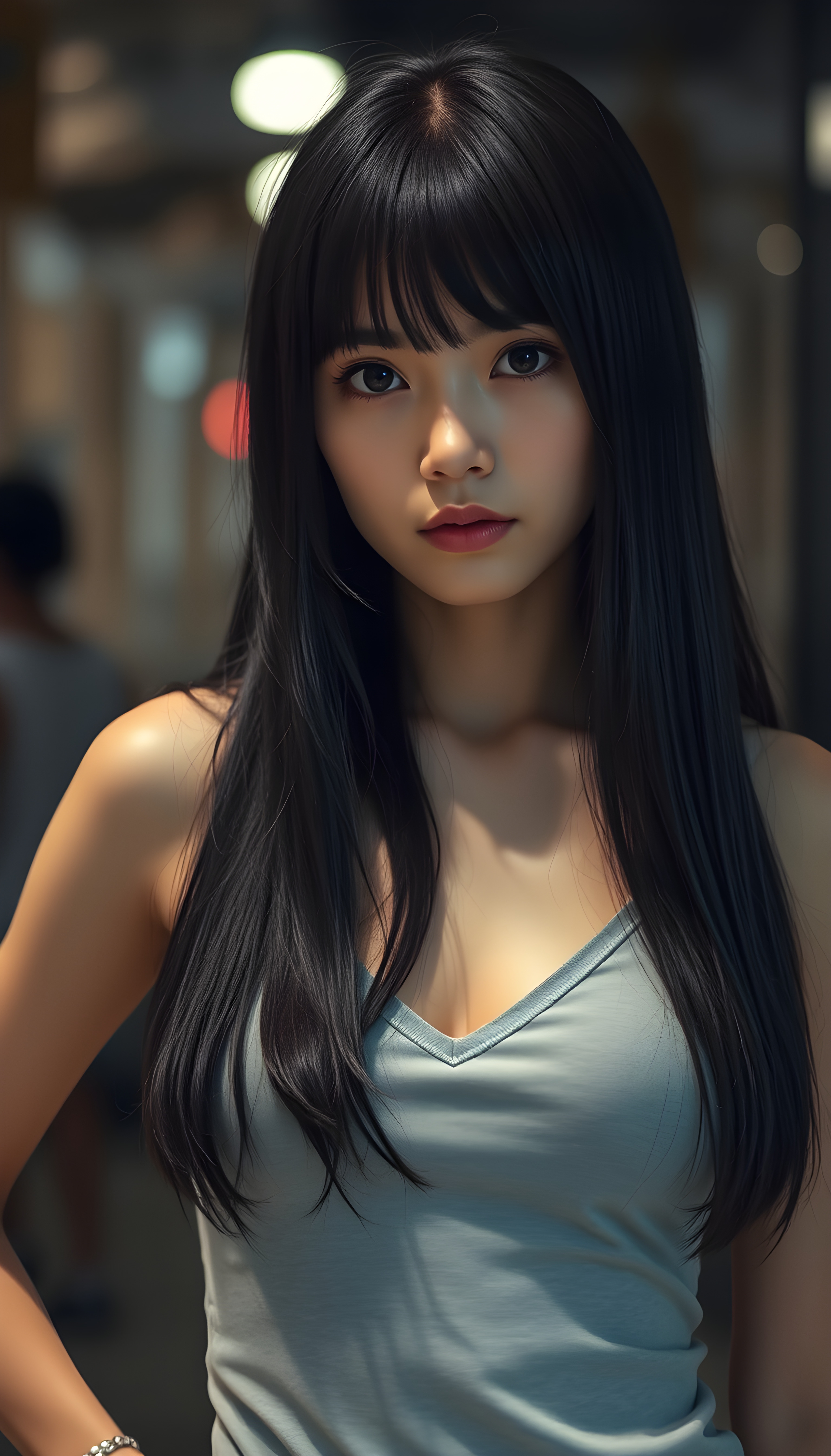 a young cute Japanese girl with open, straight soft black hair and brown fine strands, bangs cut, same length right and left, falling down to her body, she has round, shiny eyes, full plump lips, seductive, stunning, gorgeous, she is wearing a black plain t-shirt