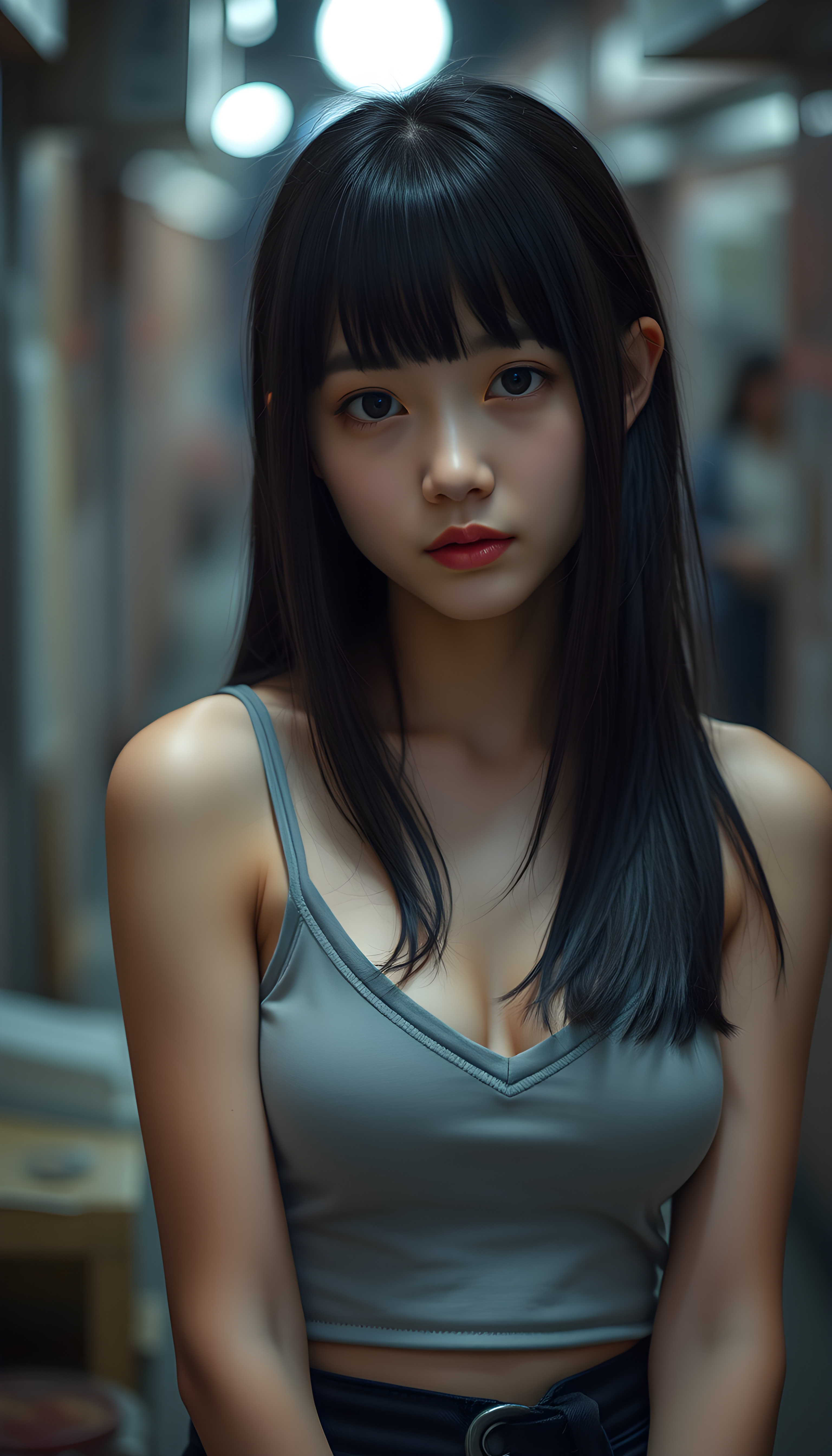 a typical japanese yandere girl, wears only a low v-cut thin light grey tank top, long black hair same length right and left, bangs