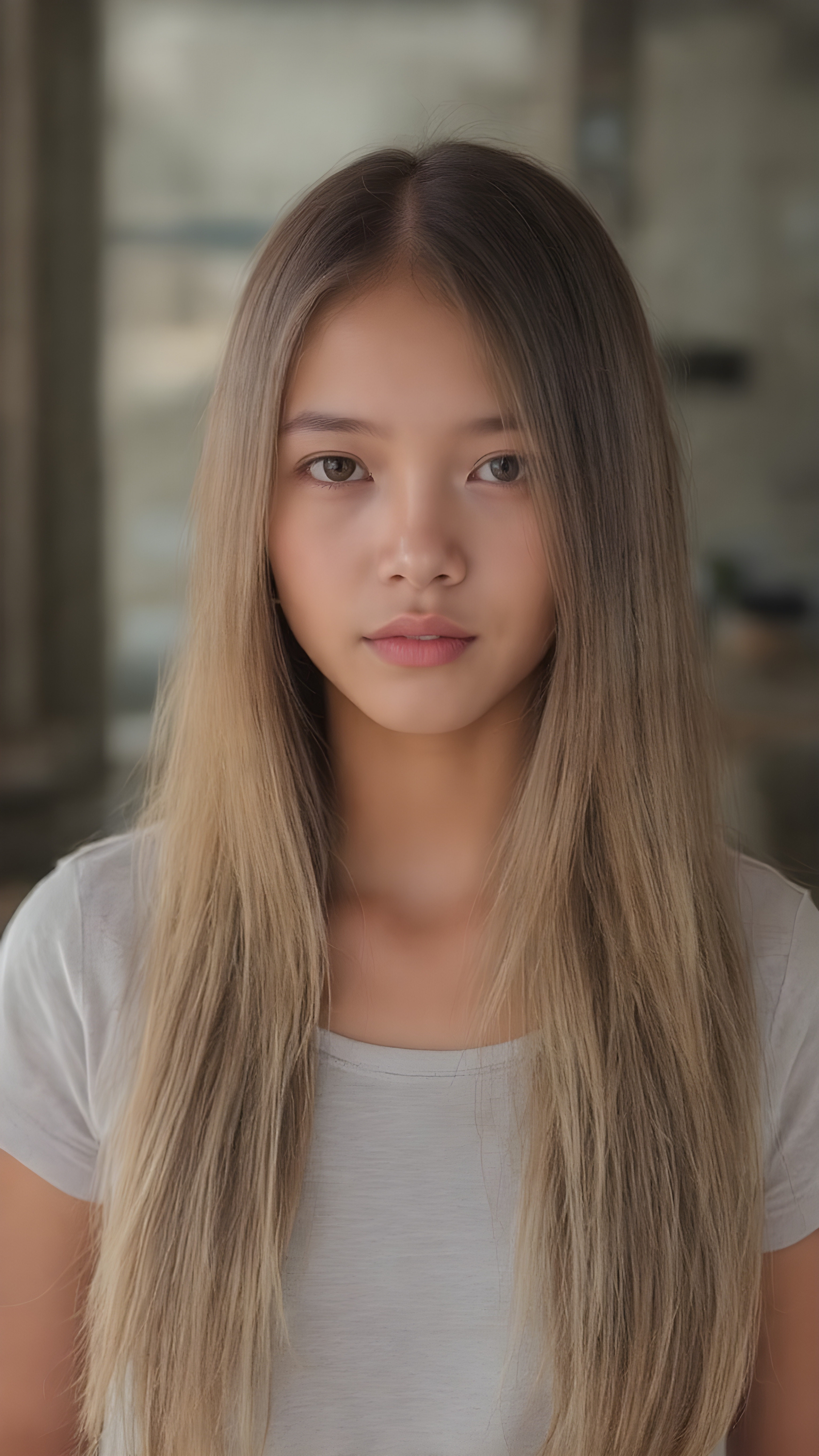 a young tanned asian girl, super long straight blond brown (hair, the same length), the hair falls down to her upper body, stunning, light grey thin t-shirt support her perfect female body