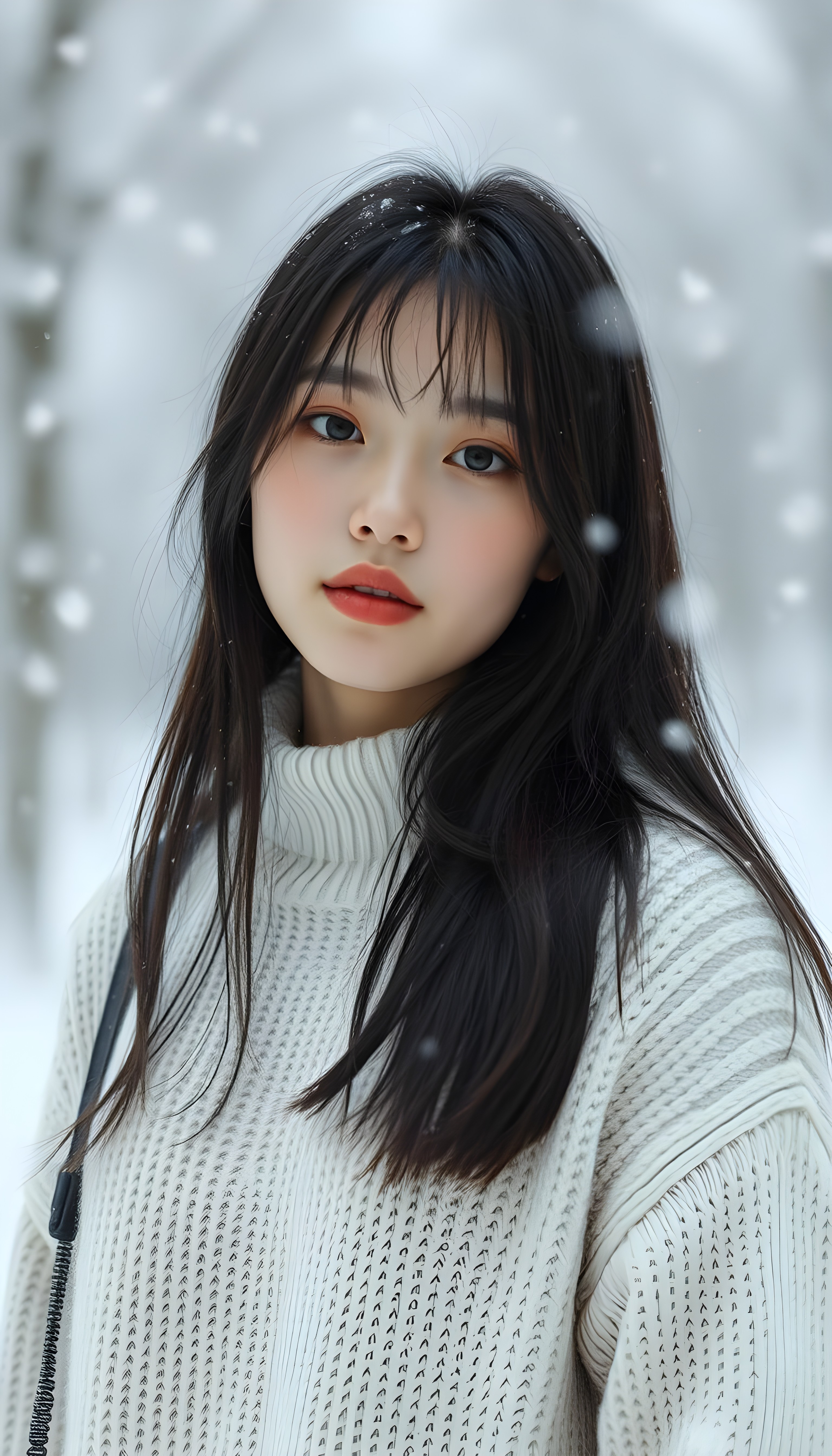 a cute teen girl, longs straight black hair, round face, full lips, is standing in falling snow, wears a white sweater made of fine wool