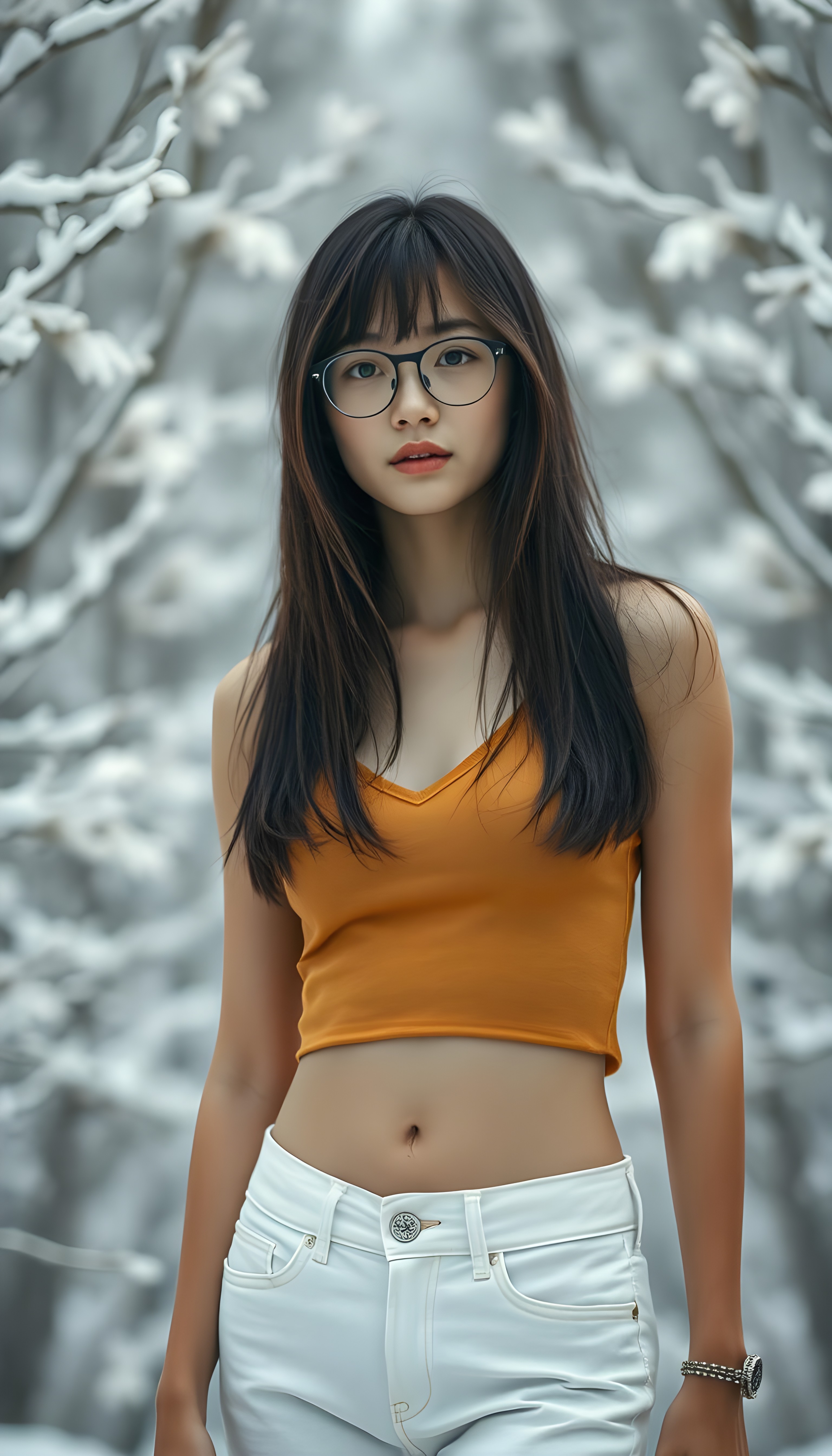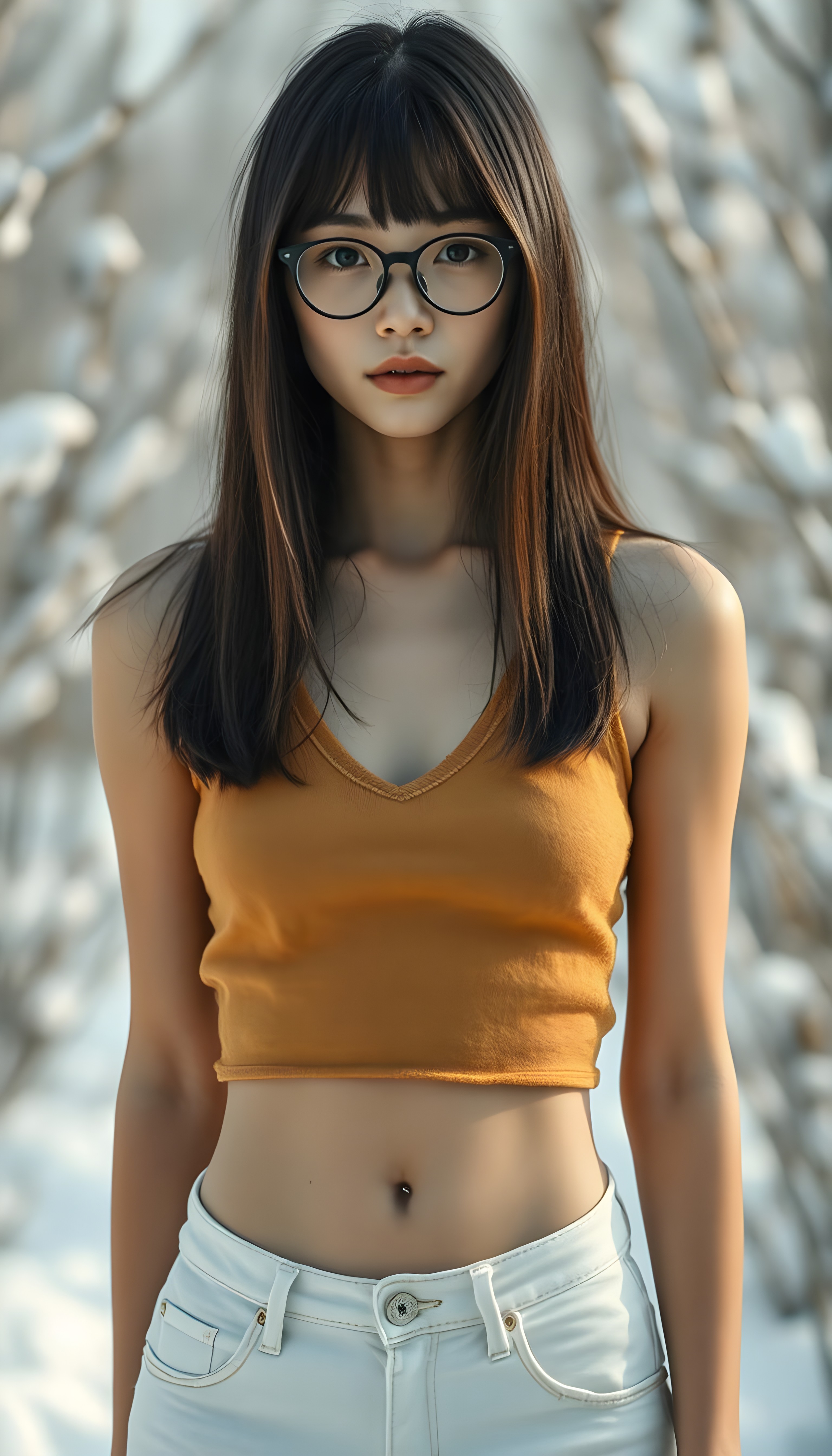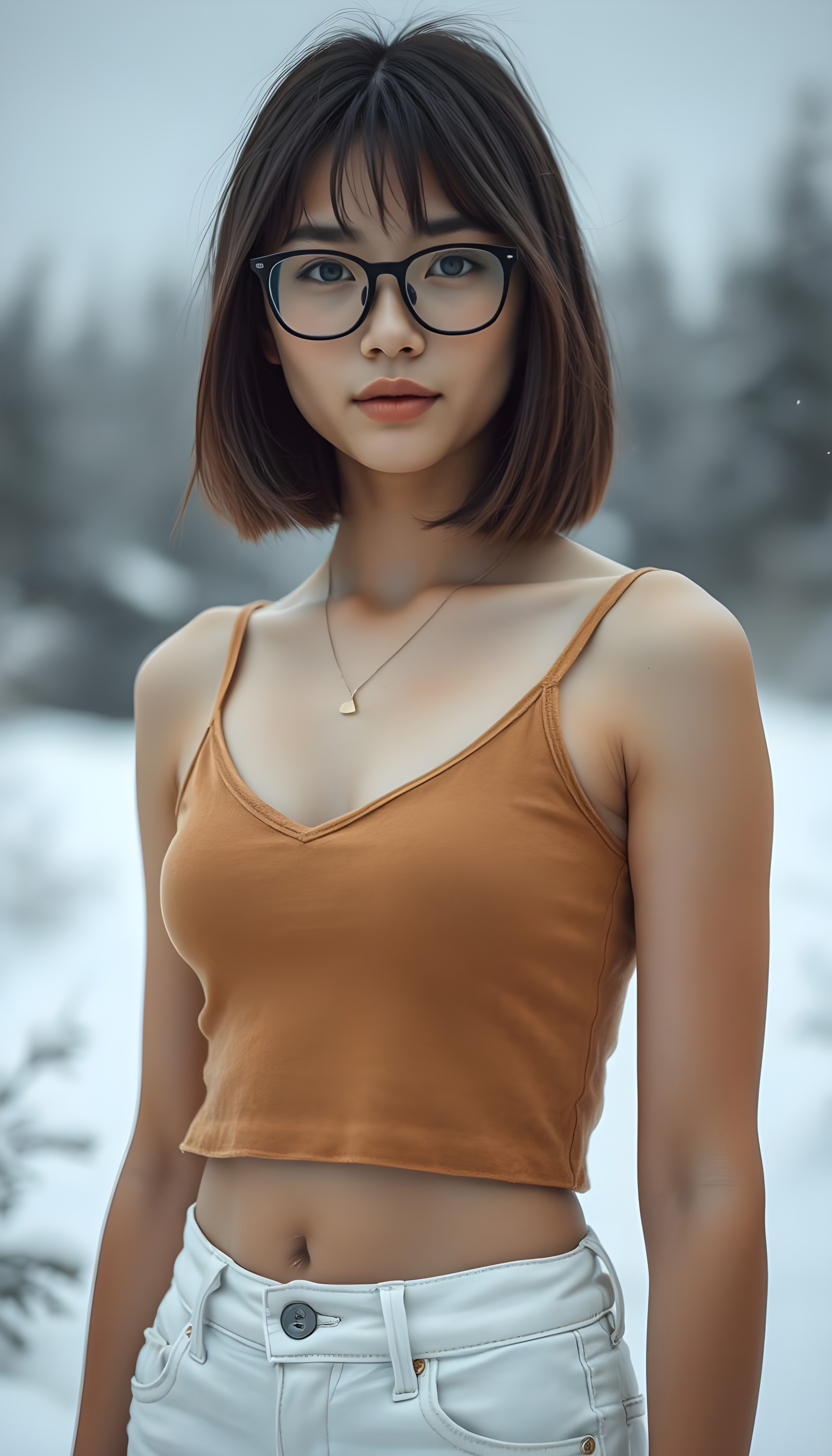 a detailed and realistic body photo: a (((white-skinned young tanned teen girl with soft, ((black shoulder long straight hair and brown highlights, bangs and bob cut))), wearing a ((plain amber fine wool cropped tank top, deep v-neck, white denim jeans pants))), perfect curved fit body, you can see her cute round belly button, standing confidently in a serene snow-covered ((white landscape, trees)), black glasses.