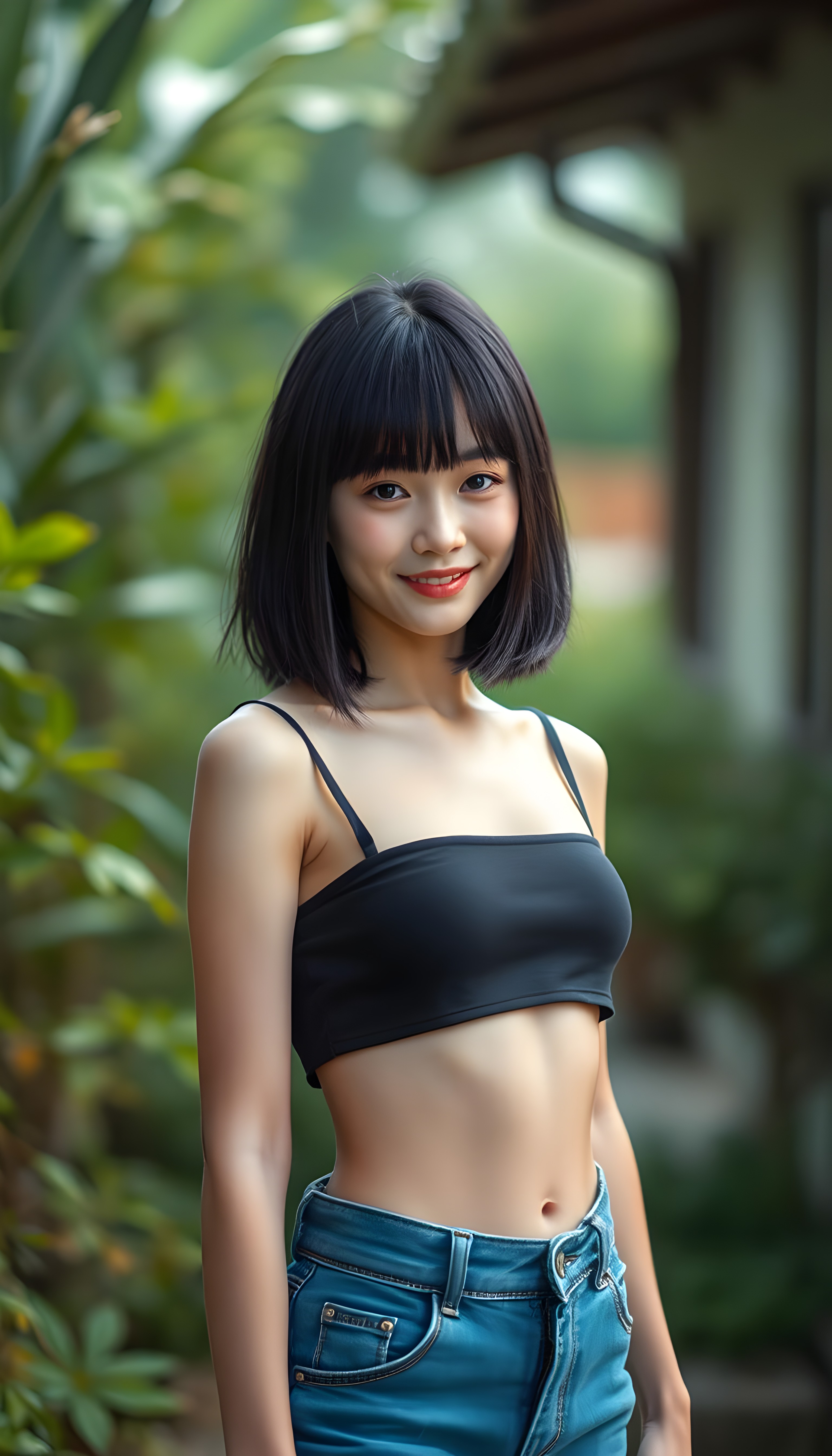 an (((adult Japanese girl, looks like Shimizu Hinako))), with straight black soft full open hair, bob and bangs cut, and a delicate, (((thin and toned body)), adorned with sleek, (((blue short denim jeans pants))), paired with a cropped top in a (((black sleeveless thin strap crop top))), that accentuates her slender figure. Her face is (((pale and flawless))), with (((bright white skin))), rosy cheeks and (((natural looking eyes))). She is exuding an air of youthful confidence and (natural beauty). (((Full body view))) of her looking happy and playful, set against a natural and (high-resolution) backdrop, showcasing her full figure and (((straight and toned legs))) that are distinctly visible, she stands in front of the viewer, you can see her round cute belly button.