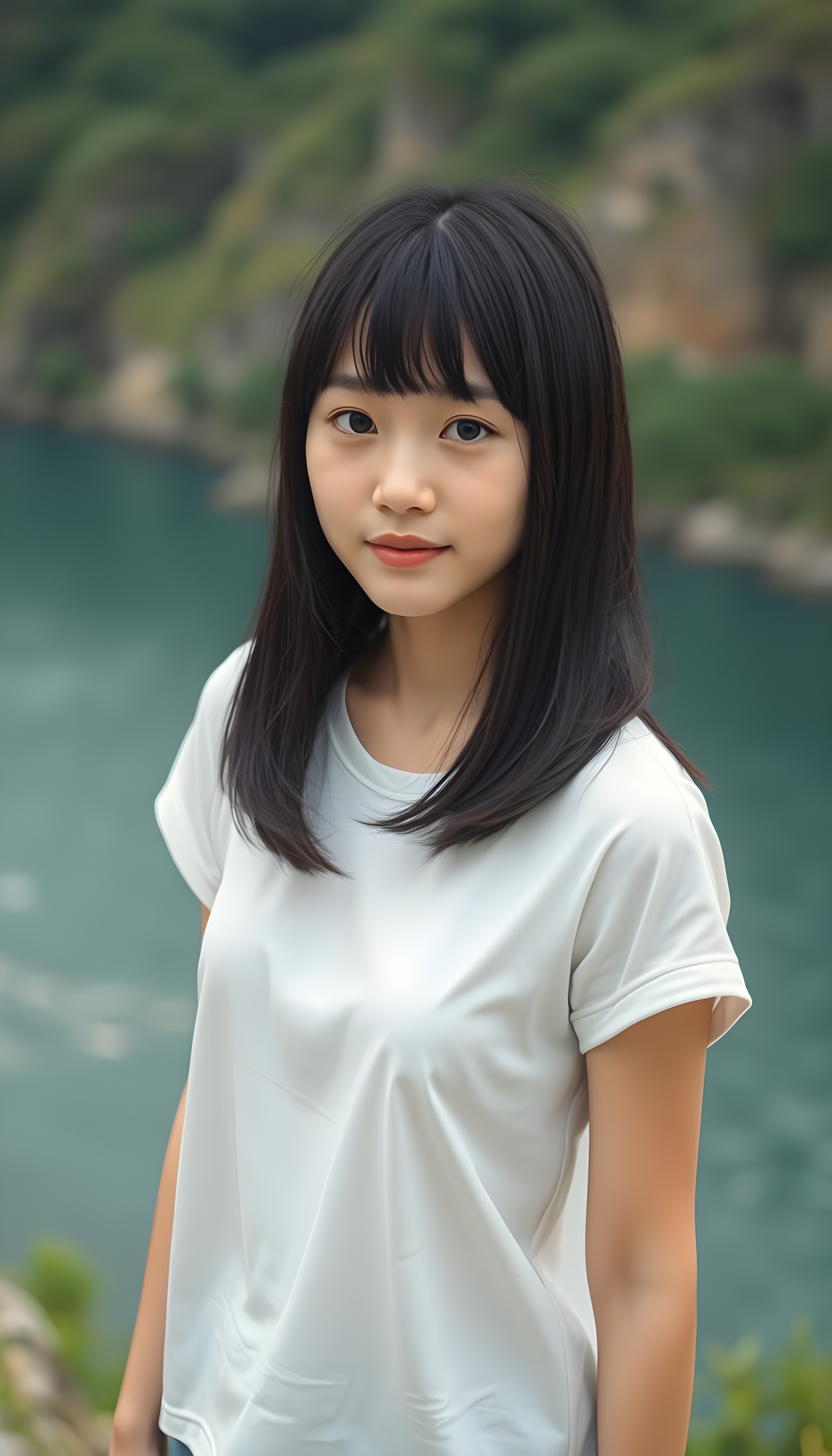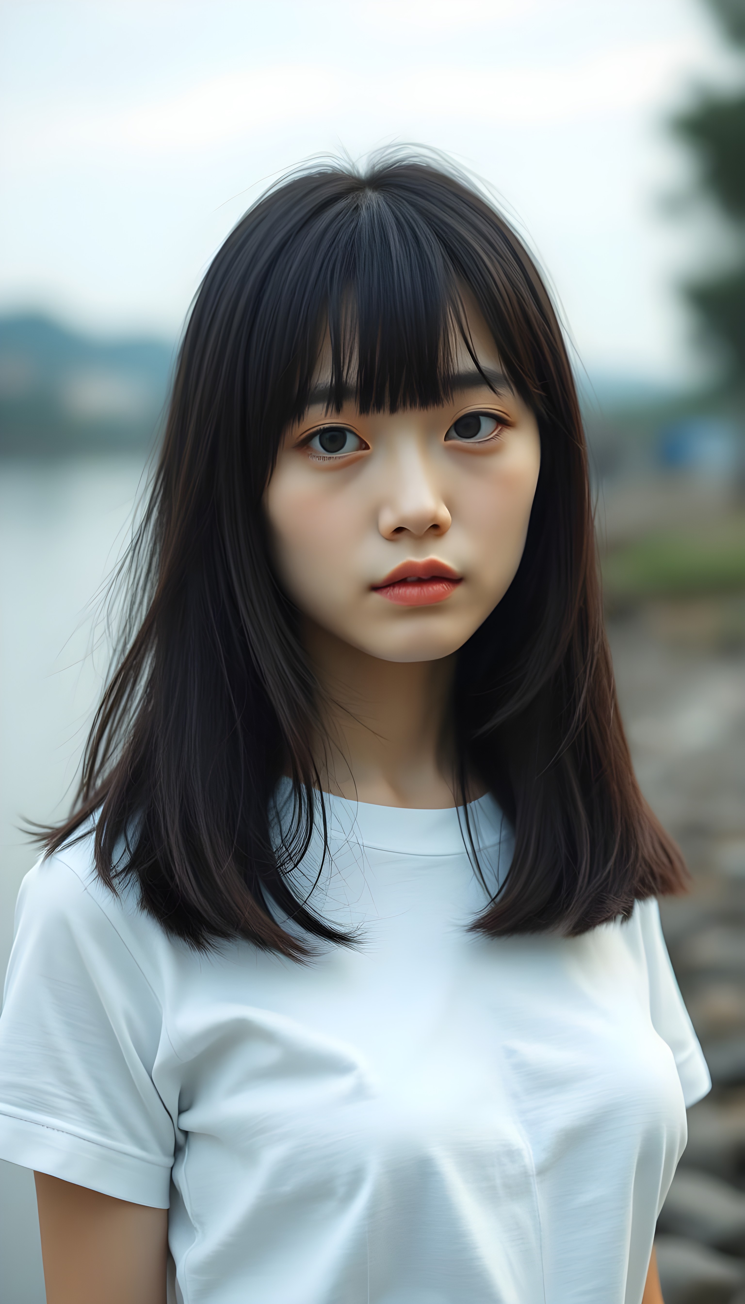 an (((adult and cute Japanese girl))), with straight black soft full open hair, bangs and bob cut, white simple plain dressed in a short, thin t-shirt. She is standing on the bank of a large river. The river is deep blue with green banks and a few trees.