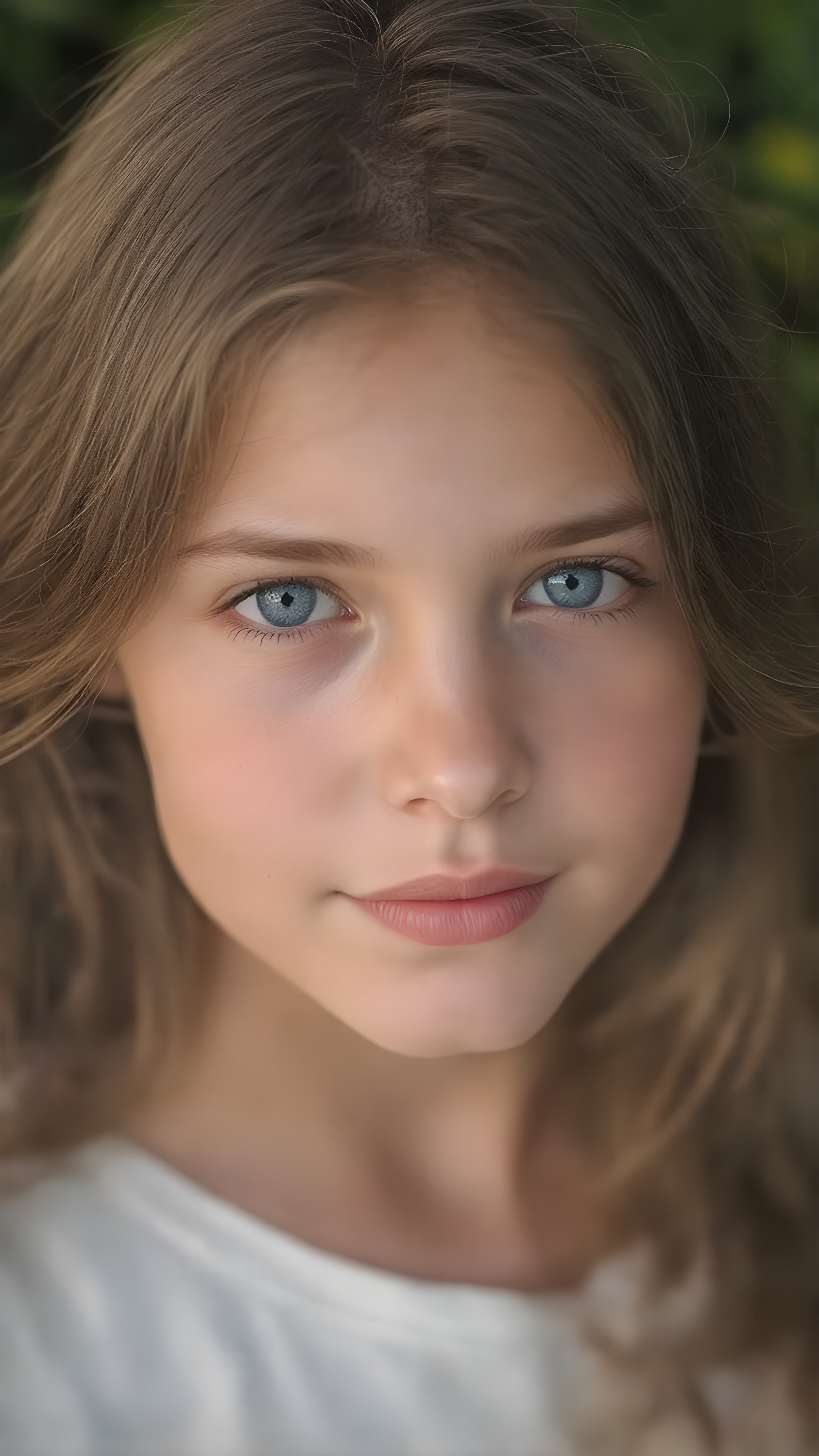 ultra-realistic portrait of a beautiful young girl, natural proportions, soft and smooth fair skin with subtle freckles, long wavy chestnut hair with natural shine, deep blue eyes reflecting soft daylight, fine eyelashes, delicate eyebrows, gentle and authentic smile, slightly rosy cheeks, wearing a simple light pastel blouse, no jewelry, photographed outdoors in a lush garden with blurred green background (bokeh), golden hour lighting, captured with a high-end DSLR camera, 85mm lens, aperture f/1.4, extremely sharp focus on the eyes, natural skin texture, photorealistic, high resolution, no makeup, cinematic composition