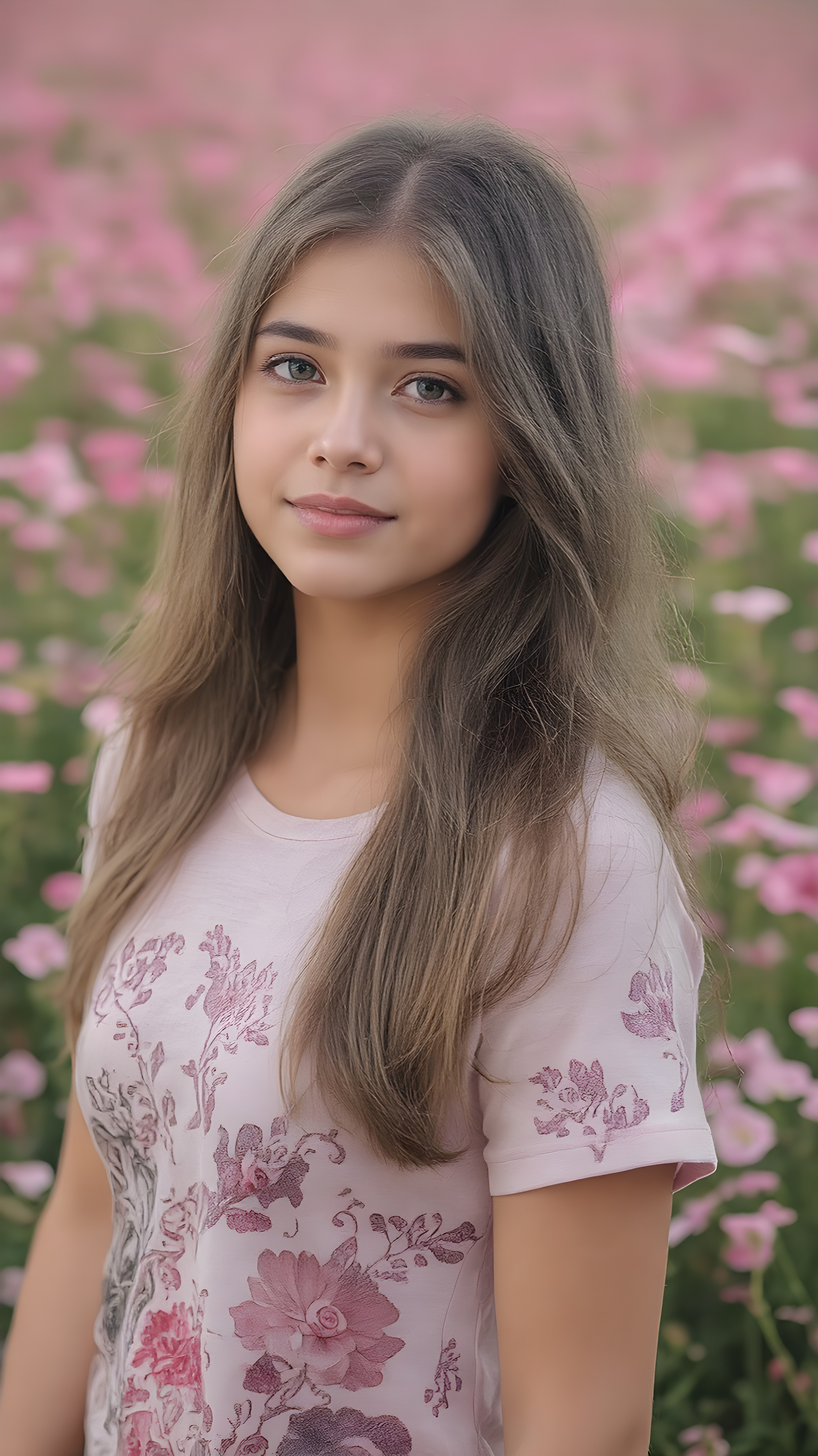 full body side image of a breathtakingly beautiful 19-year-old girl, showcasing her radiant complexion and striking long, straight brown hair framed by her exuding a serene and natural elegance. She is captivated by the vast, captivating flower field, her eyes reflecting the enchantment of the moment. Her attire is a perfectly executed (((lifted short t-shirt))), a masterpiece crafted from the finest fabric, highlighting her graceful figure in all the right places. The T-Shirt features intricate floral patterns and luxurious textures, perfectly accentuating her youthful beauty. Her hair is styled in loose, natural waves, adding to the ethereal atmosphere of the scene. The overall mood of the picture is one of youthful vitality and natural elegance, perfect body and face and a smile that radiates warmth and charm
