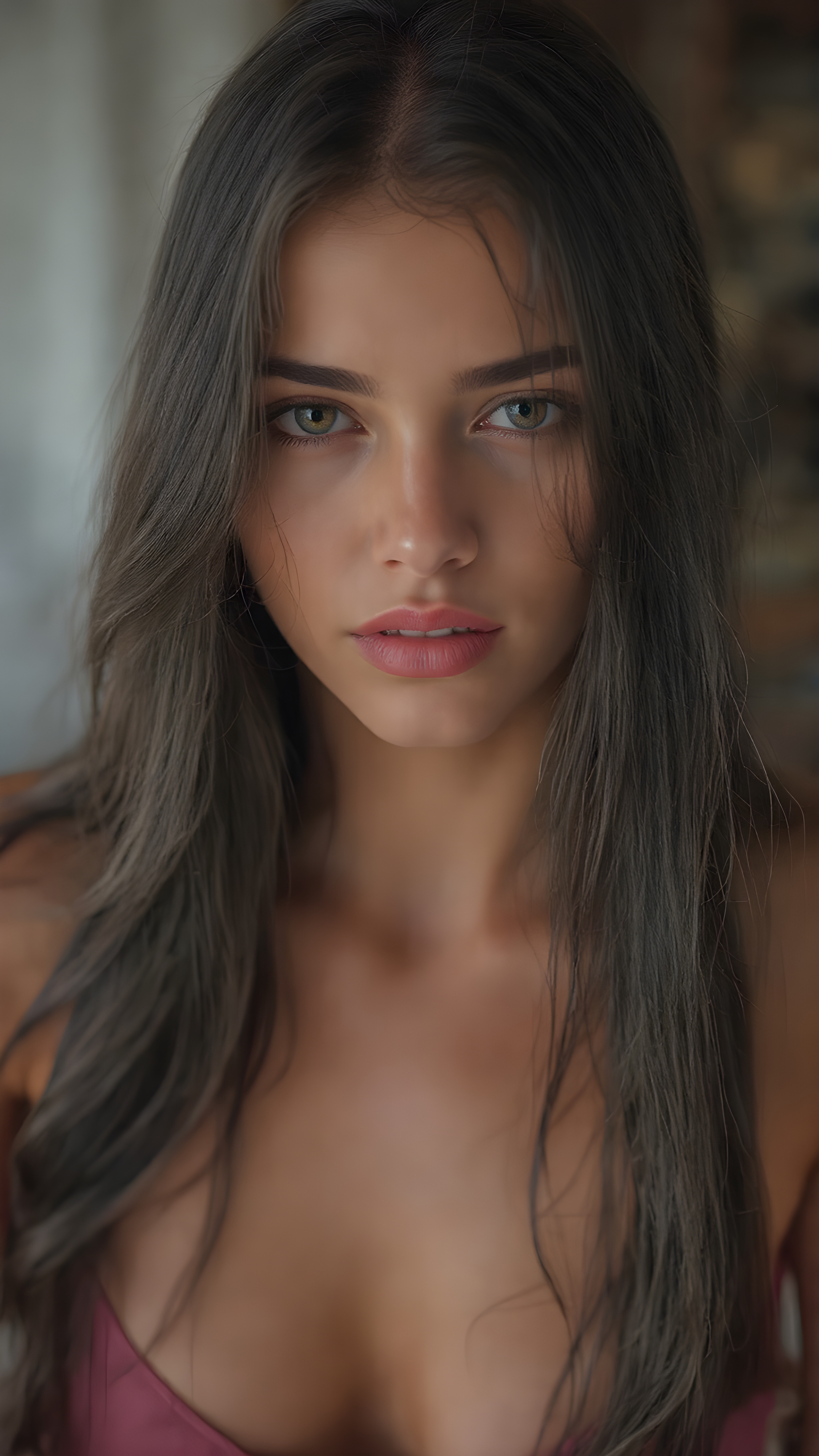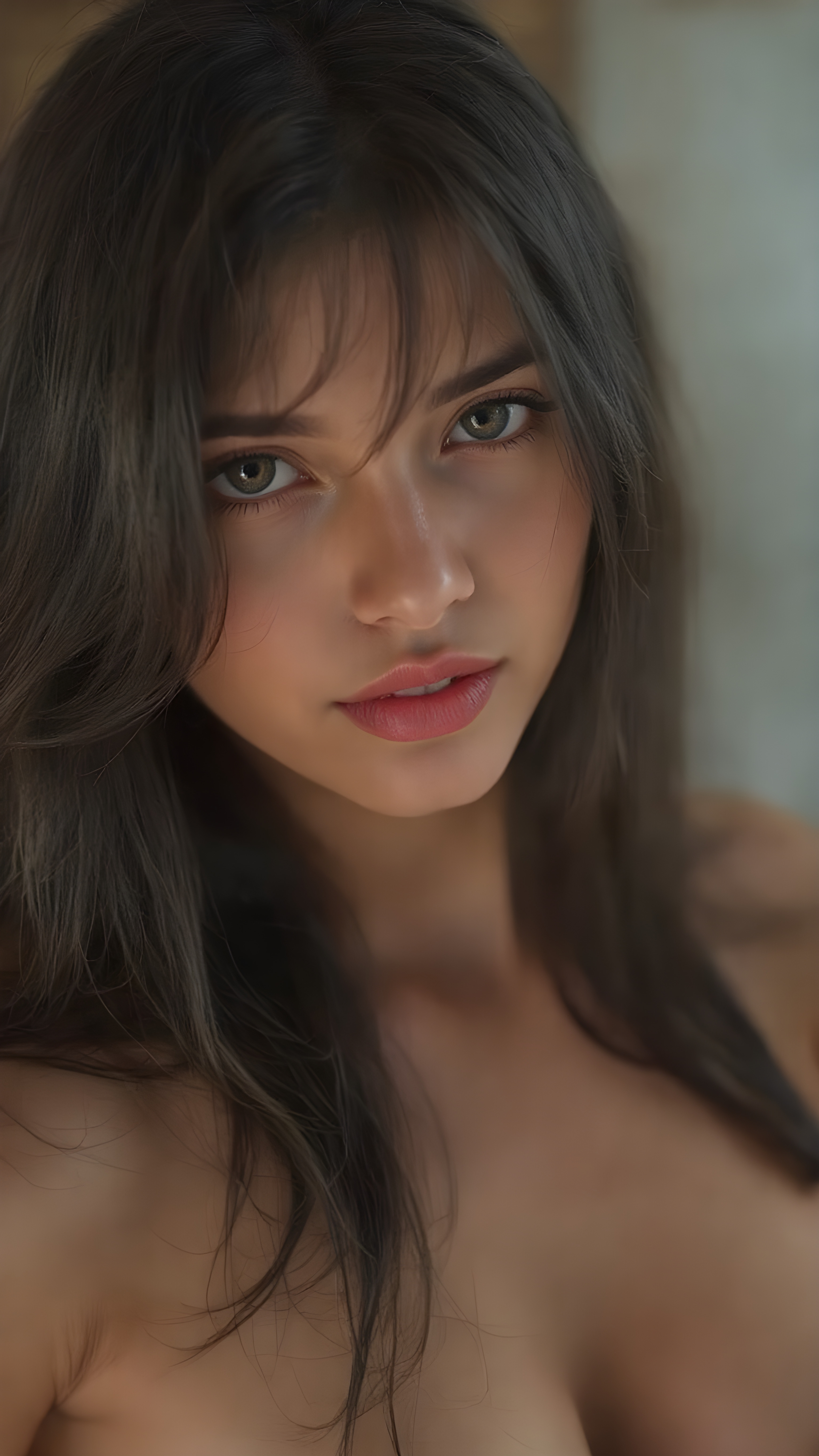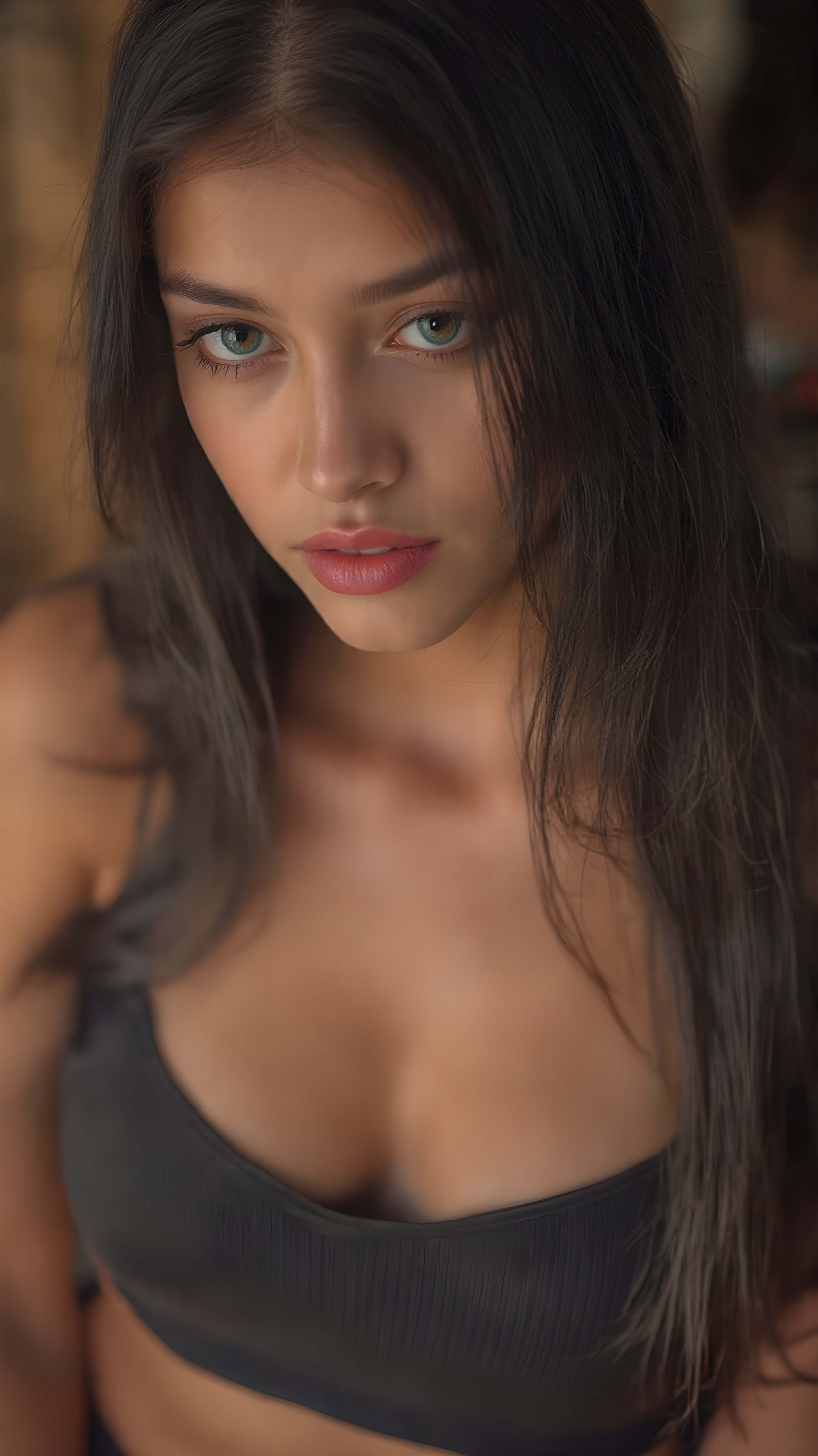 A (((very young, (((well-bustified cute valkyrie with a sleek, toned and tan body))), with long, straight soft black hair, wearing a ((short, tight, low-cut tank top)) that accentuates her ((perfectly round face)) and flawlessly smooth skin. Her ((full kissable lips)) are painted in a (bright red lipstick) that complements her (((seductive eyes))), which are framed by (black eye makeup) that enhances her (alluring gaze). (((Her youthful complexion is evident from her (freshly shampooed locks), whose curls gracefully frame her face in a (seductive pose). The scene is set against a (softly backlit backdrop) that (flatters her figure) and (enhances her alluring gaze)