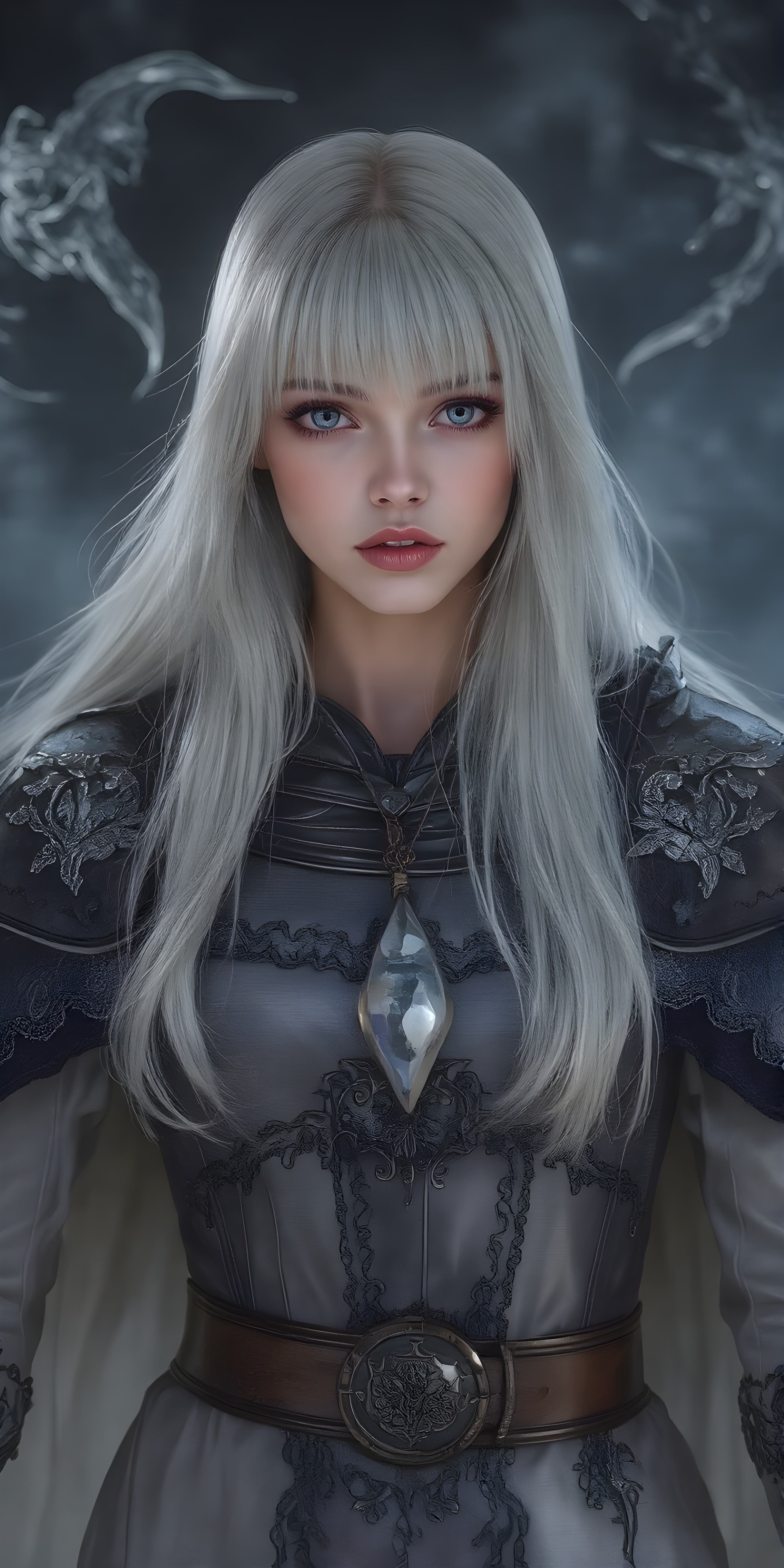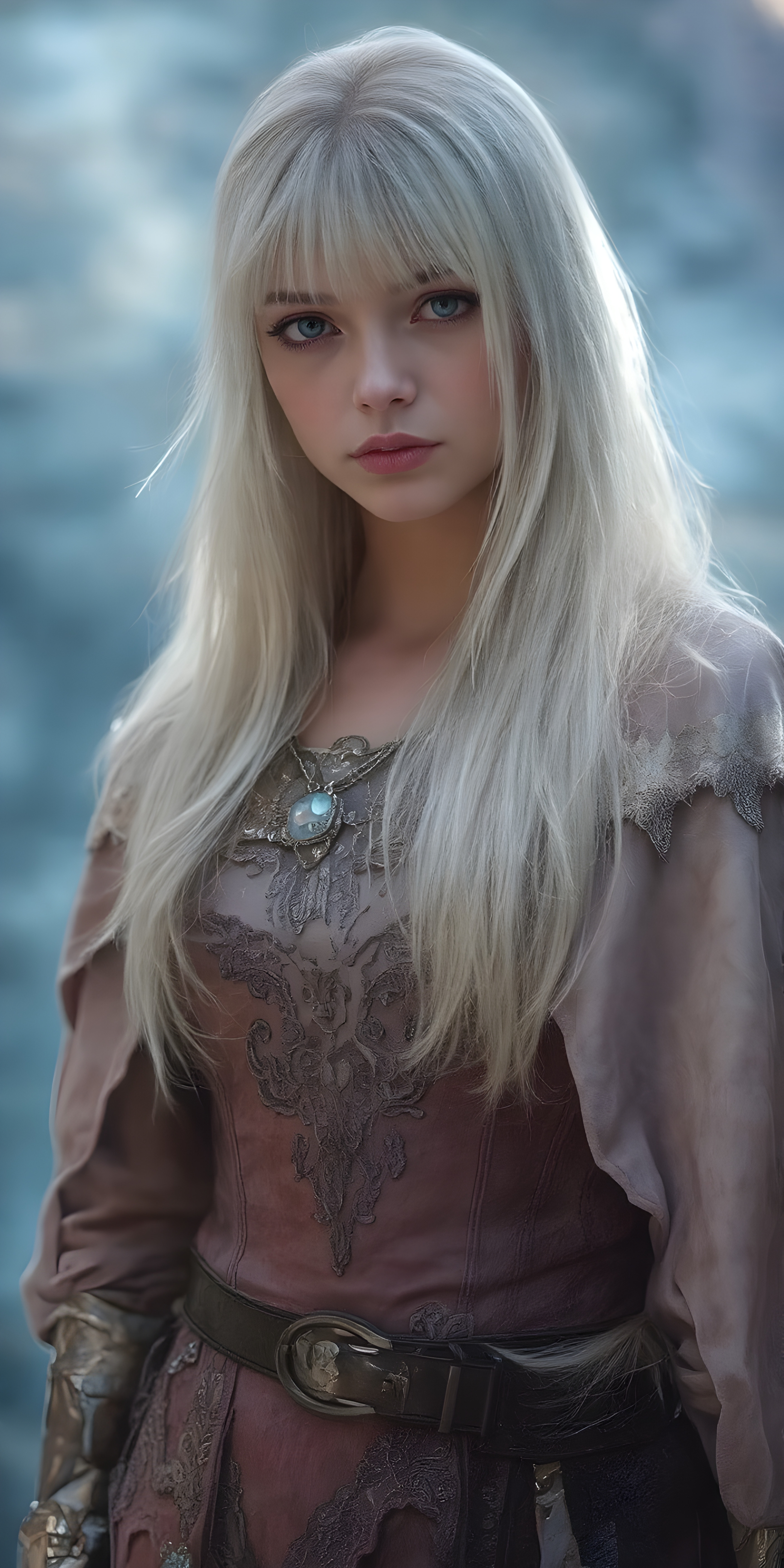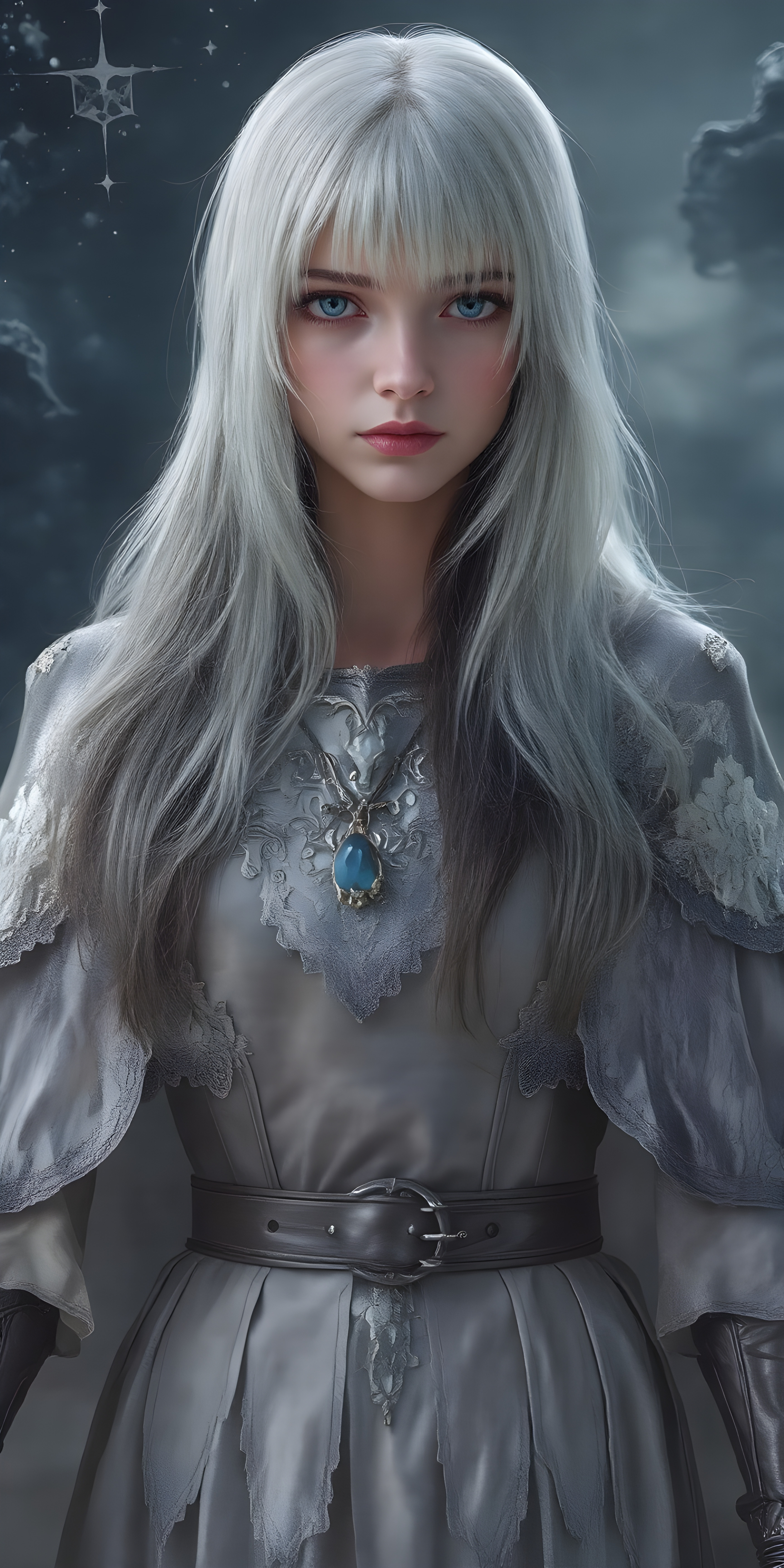 In a fantastical realm, a (((fantasy girl with an unmistakable face her features delicate yet alluring))), long straight white hair, bangs, stands clad in armor that blends light and fantasy. Crafted from intricate thin silver and gold threads, the armor shines with a soft, iridescent glow. A flowing cloak, woven from shimmering silk and velvet, drapes over her shoulders and billows softly in the breeze. Adorned with embroidered stars and constellations, the cloak is adorned with delicate lace details and velvet pockets that sparkle like diamonds in the moonlight. A leather belt sits comfortably on her waist, adorned with polished leather details that match the armor’s sleek contours. A pair of polished silver gloves adds to the elegance of her ensemble, accentuating the delicate threads of her cloak and highlighting the alluring nature of her attire. Her hair, a cascade of midnight black and indigo, wears a small moonstone pendant that dangles softly off her neck until the next night.
