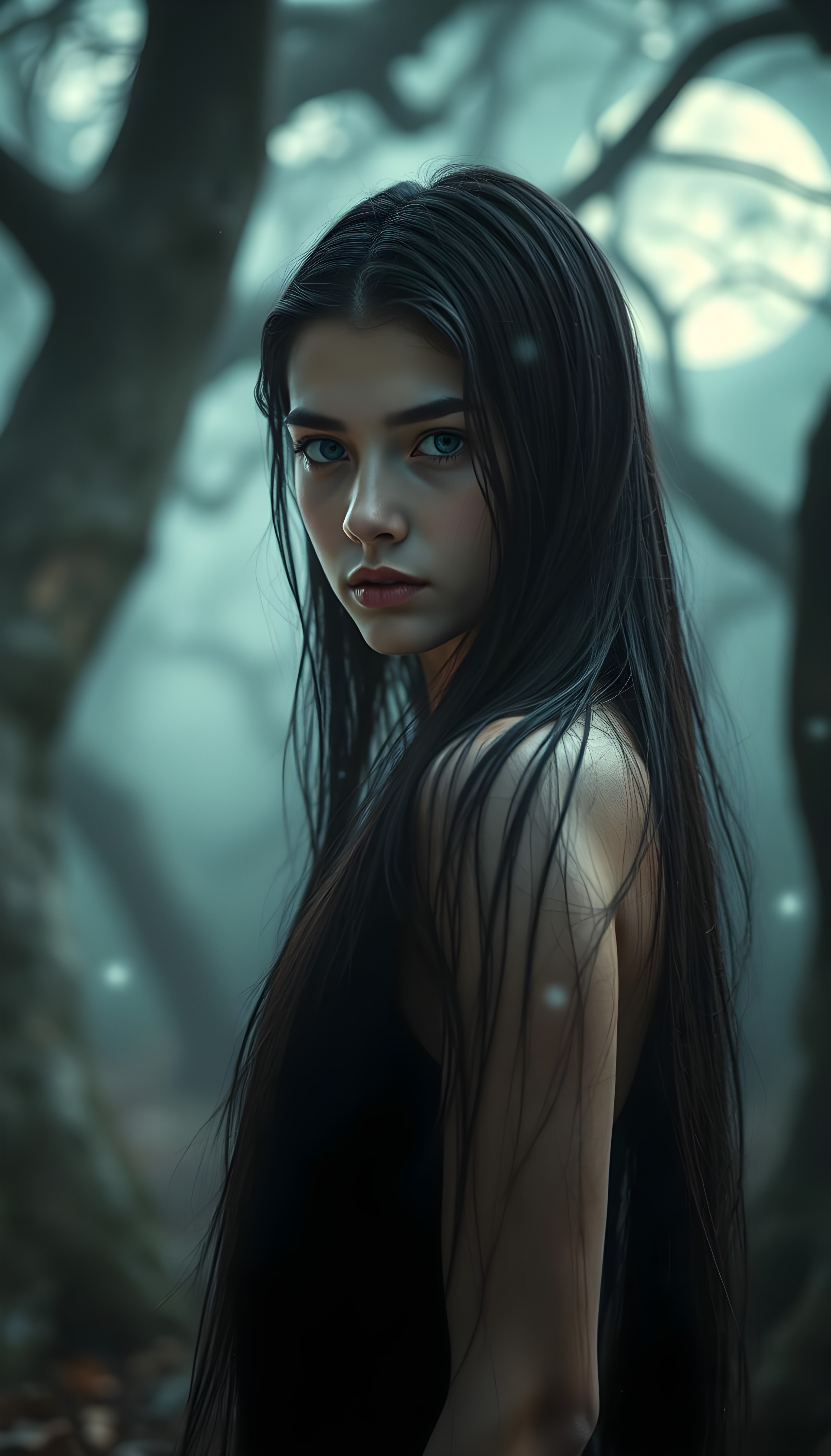 A young adult female girl with identical, piercing blue eyes gazes intensely at the viewer. Her long, straight black hair flows gracefully down her back, contrasting against the soft, ethereal glow of her wet skin. The setting is a mystical, moonlit forest. Ethereal mist swirls around her, adding an otherworldly ambiance. The light is soft and diffuse, highlighting her features with a magical, almost iridescent quality. She stands confidently, surrounded by ancient trees with twisted branches that reach toward the night sky, creating a sense of mystery and enchantment.
