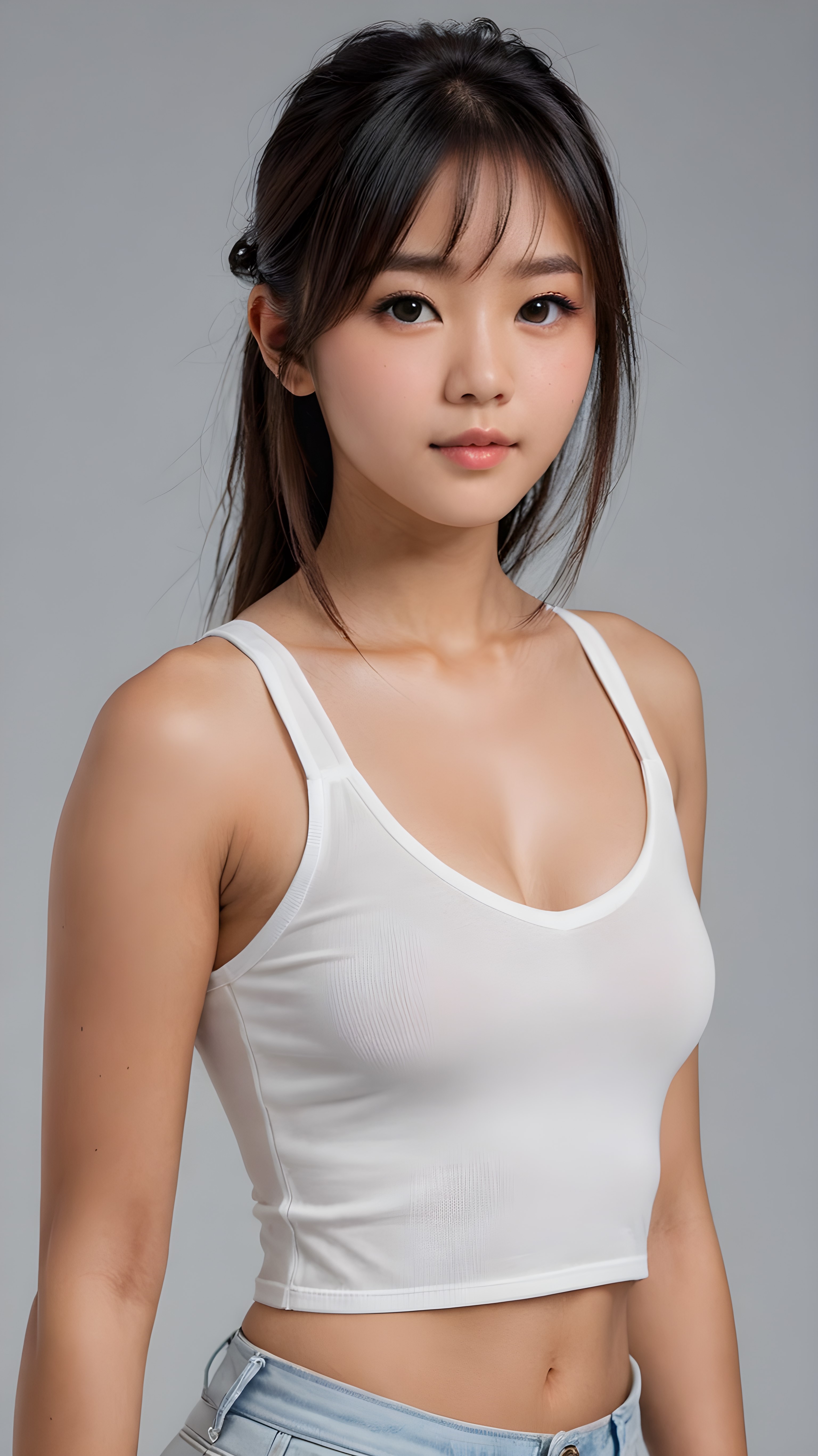 a realistic, Asian busty teen girl, 13 years old, long straight soft jet hair, bangs cut, perfect curved body, (wears a super short tight (white crop tank top, deep v-neck)), perfect anatomy, grey background, side perspective ((realistic)) ((stunning)) ((gorgeous)) ((hight resolution)), upper body 1:3