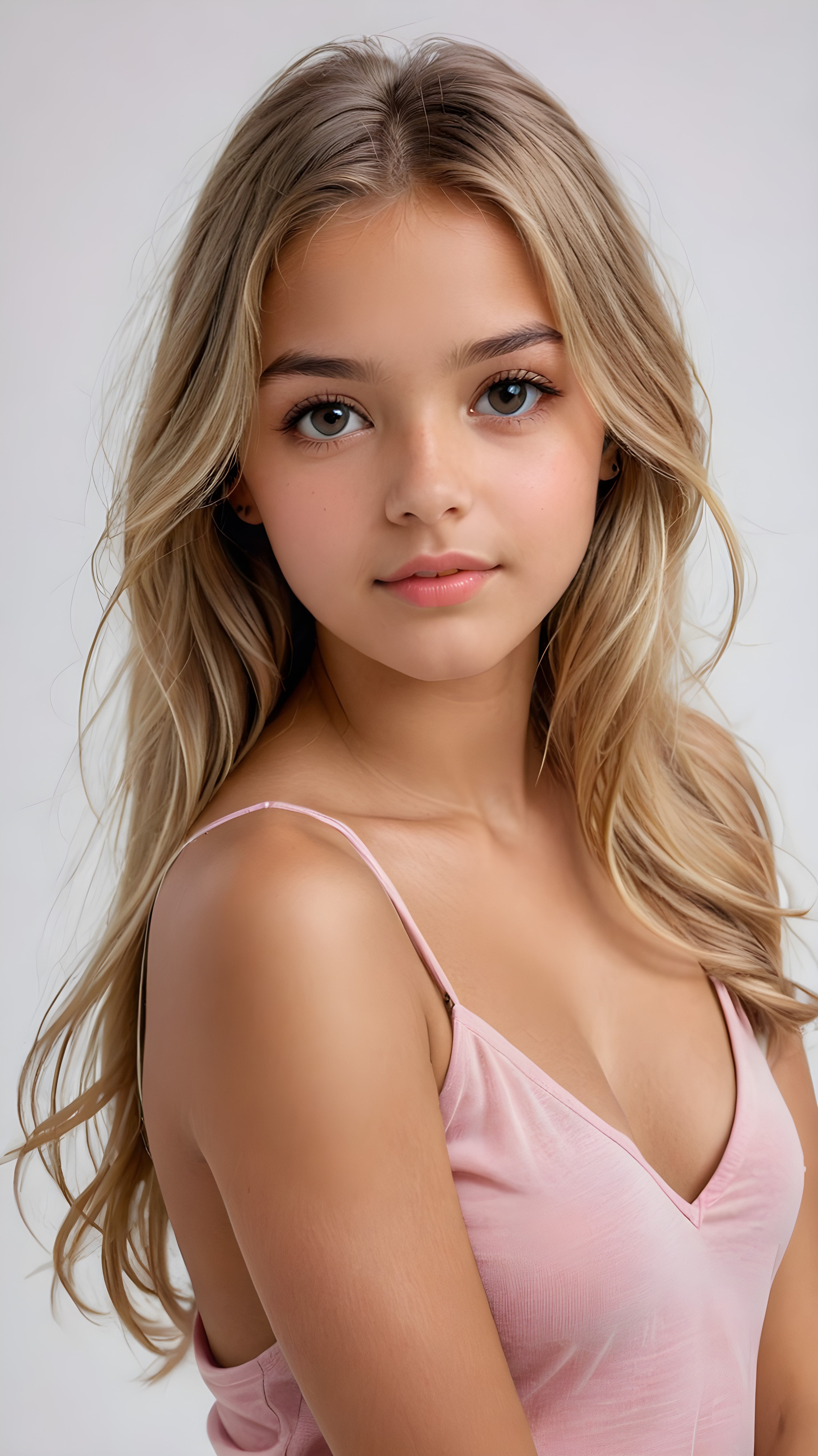 a beautiful and detailed portrait of a young and pretty tanned model girl, 14 years old, long straight soft blonde hair falls over her shoulders, she wears a thin short t-shirt with deep v-neck and looks seductively at the viewer with her big shining eyes, full lips, her skin is flawlessly beautiful, she has a wonderfull curved body ((side view))