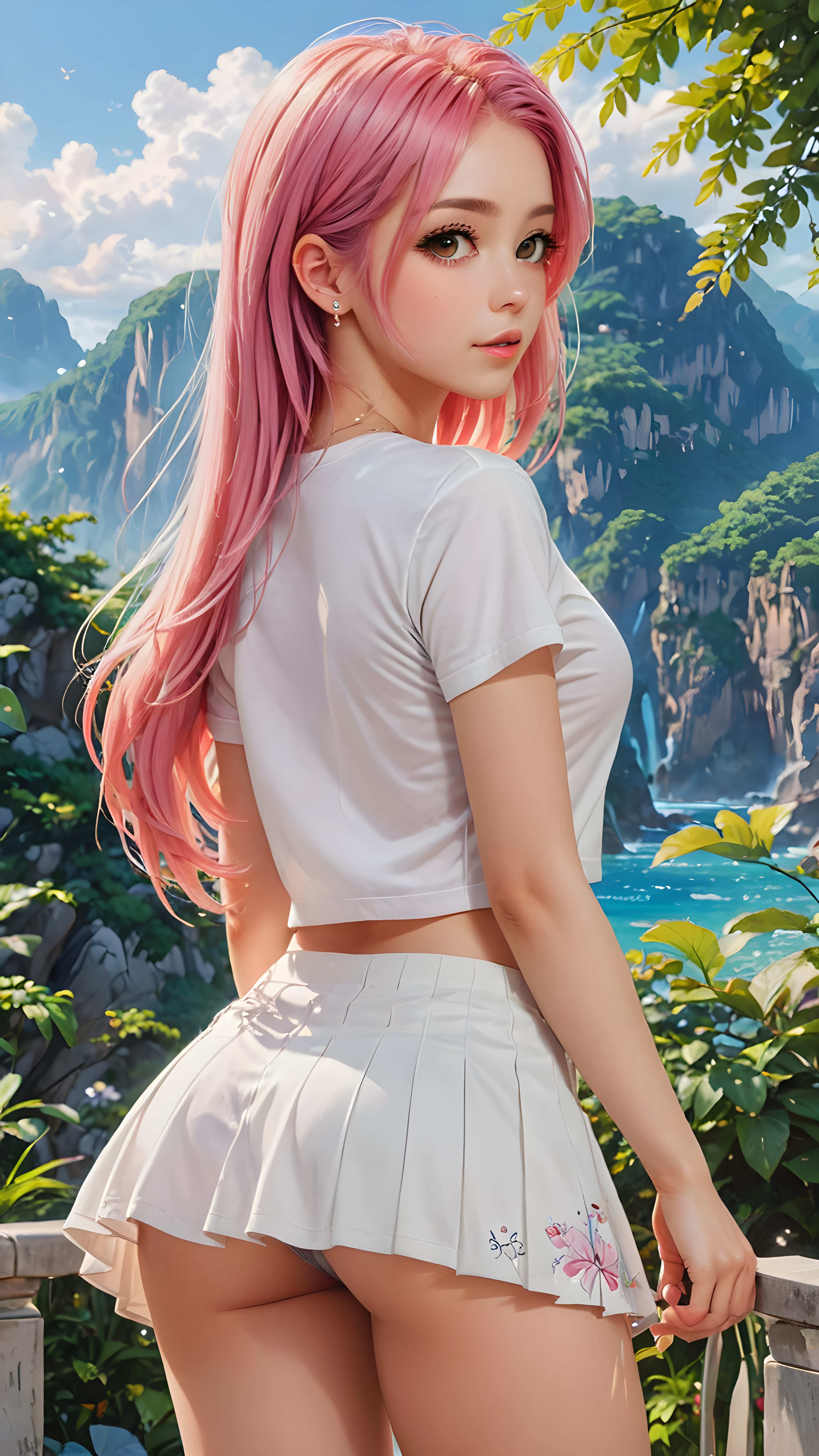 a breathtakingly beautiful (((portrait))), featuring a (((stunning girl, pink hair))) with intricate, details-filled ((long, straight soft hair)) cascading down her back in a sleek, flowing style against a (summery backdrop), she wears a (white short crop tank top) and a (round super short mini skirt)