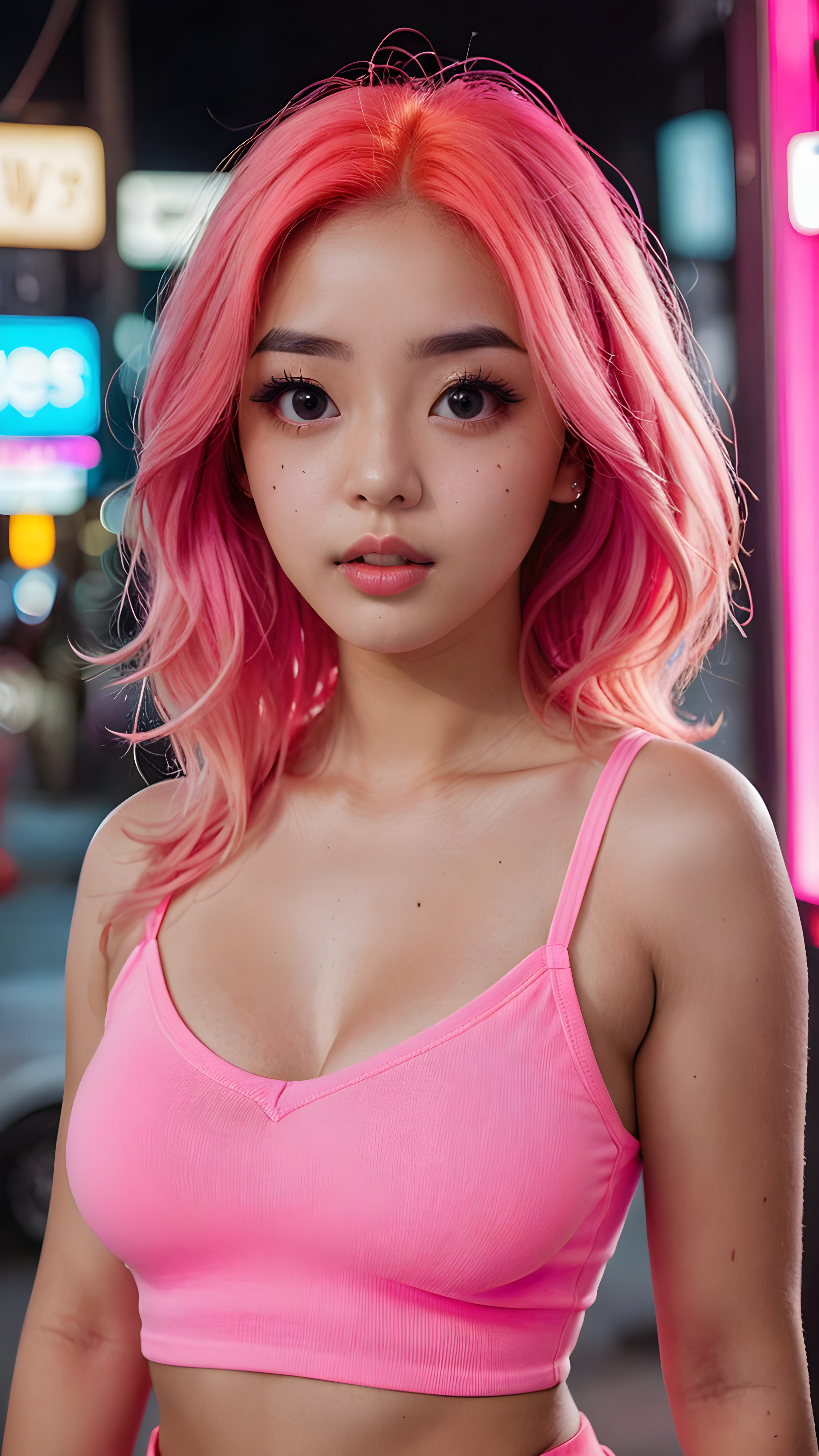 a (((cute girl))), ((pretty face)), (((perfect body))), ((neon pink cropped tank top, deep v-neck)), (((perfect curvy body))), ((beautiful long straight jet neon pink hair)), ((thick eyebrows)), ((full lips)) (((perfect large cute eyes))), ((pretty face)), ((cute stabs)), ((perfect curvy body)), (((korean))))