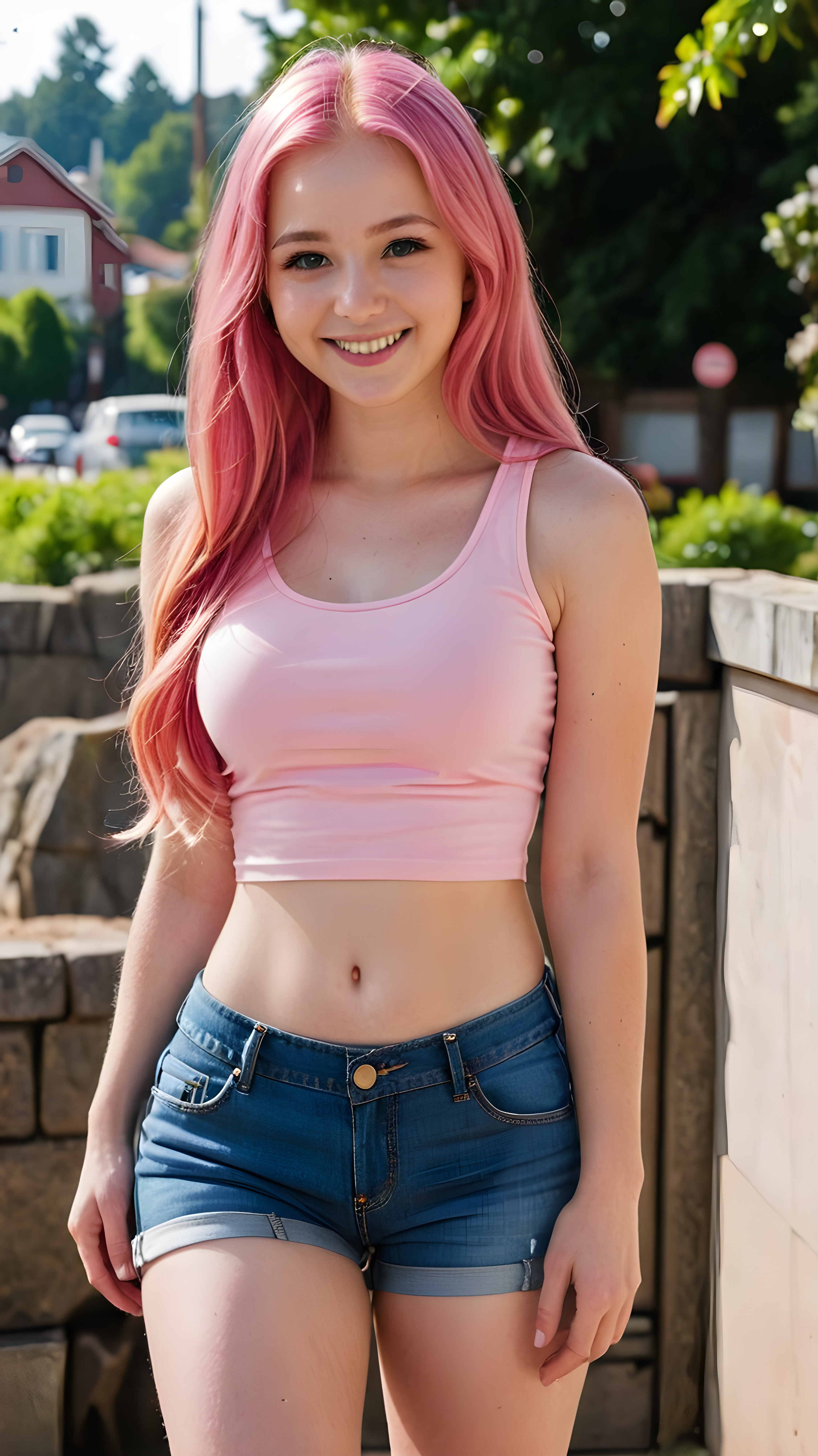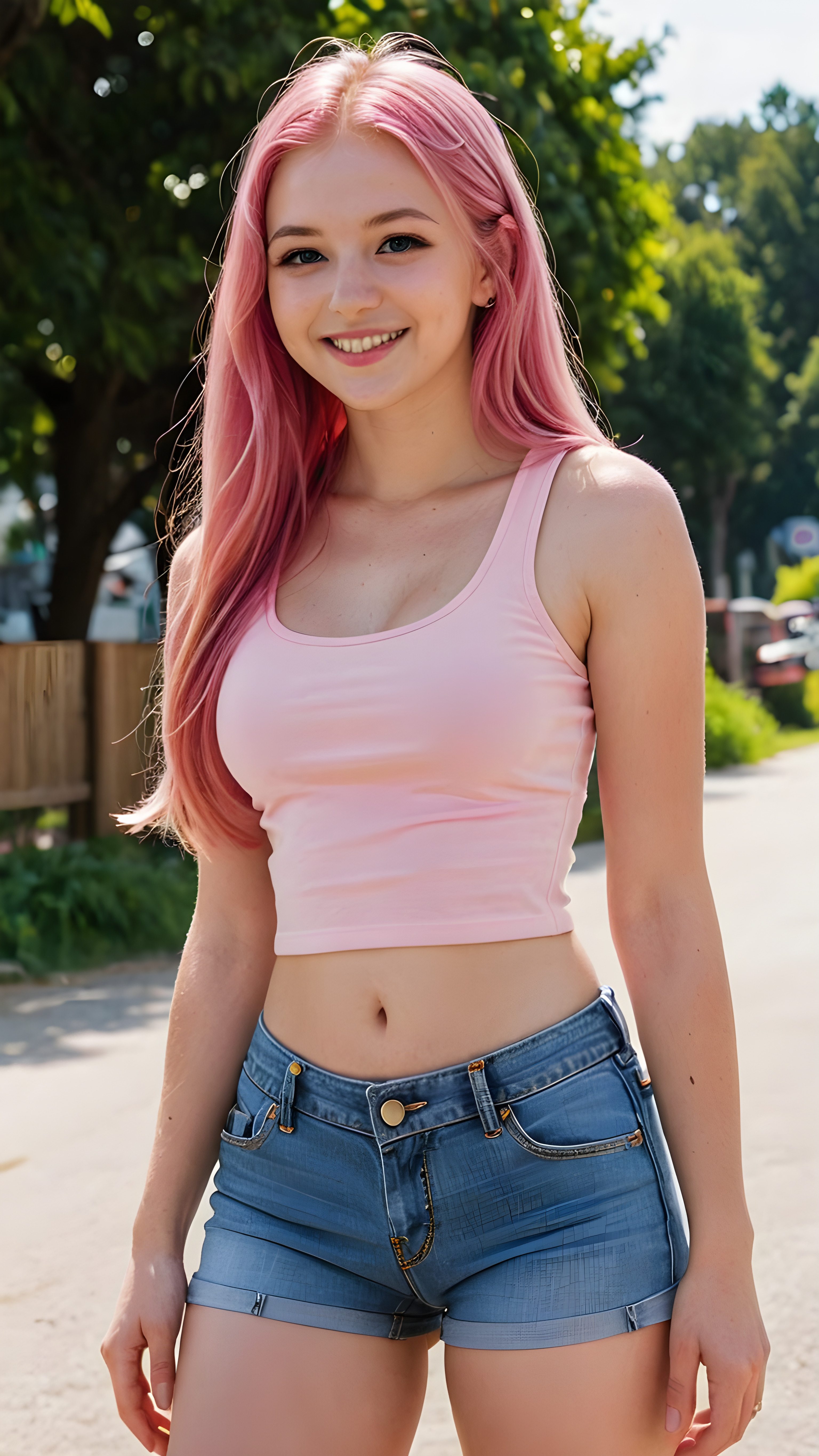 (((cute))) (((long, straight pink soft hair))) ((stunning)) a ((beautiful)) (gorgeous) teenage girlie, ((perfect body)) ((perfect face)), ((wears a pink form-fitting tight cropped Tank Top, accentuating her (((navel))))) and ((loose fitting pink jean shorts)) ((smiling)) ((sunny))