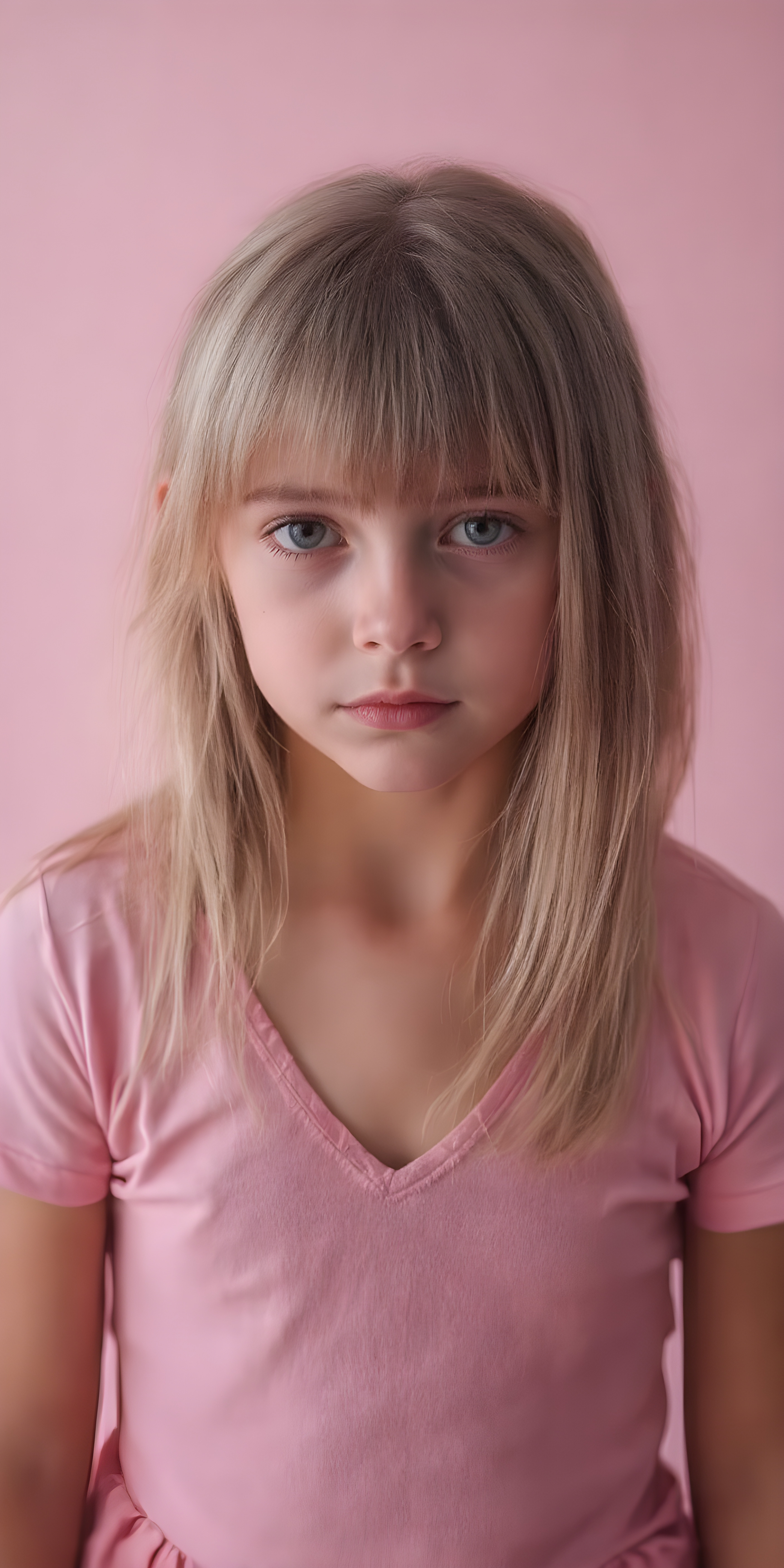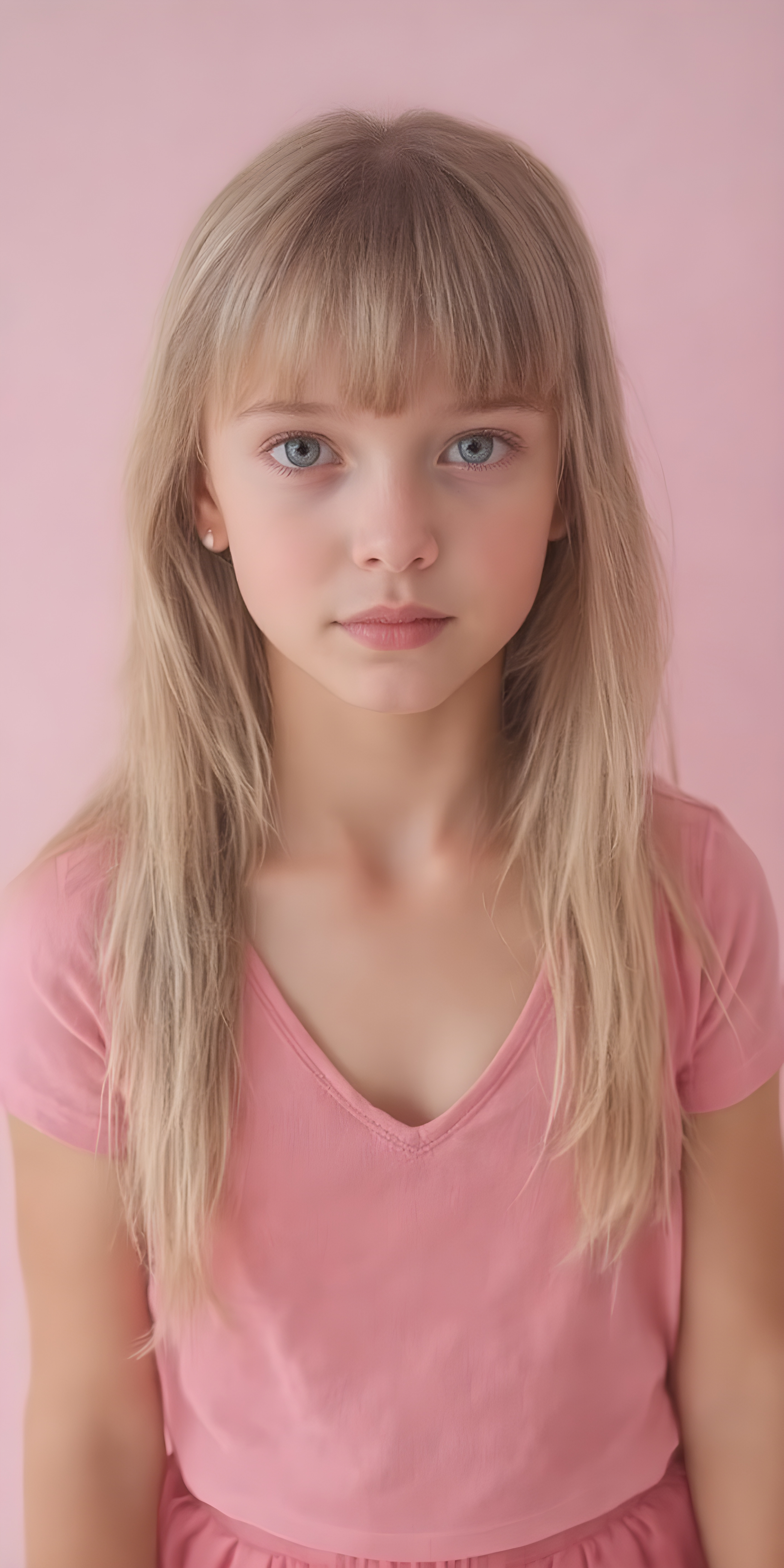 a young cute young girl with long, straight ((soft pink hair)), bangs and an angelic face wears a thin, pink wide t-shirt that accentuates her perfectly shaped body, deep v-neck. She looks seductively into the camera with a slight smile and wears a short dark pink round mini skirt, all against a light pink backdrop, full body shot