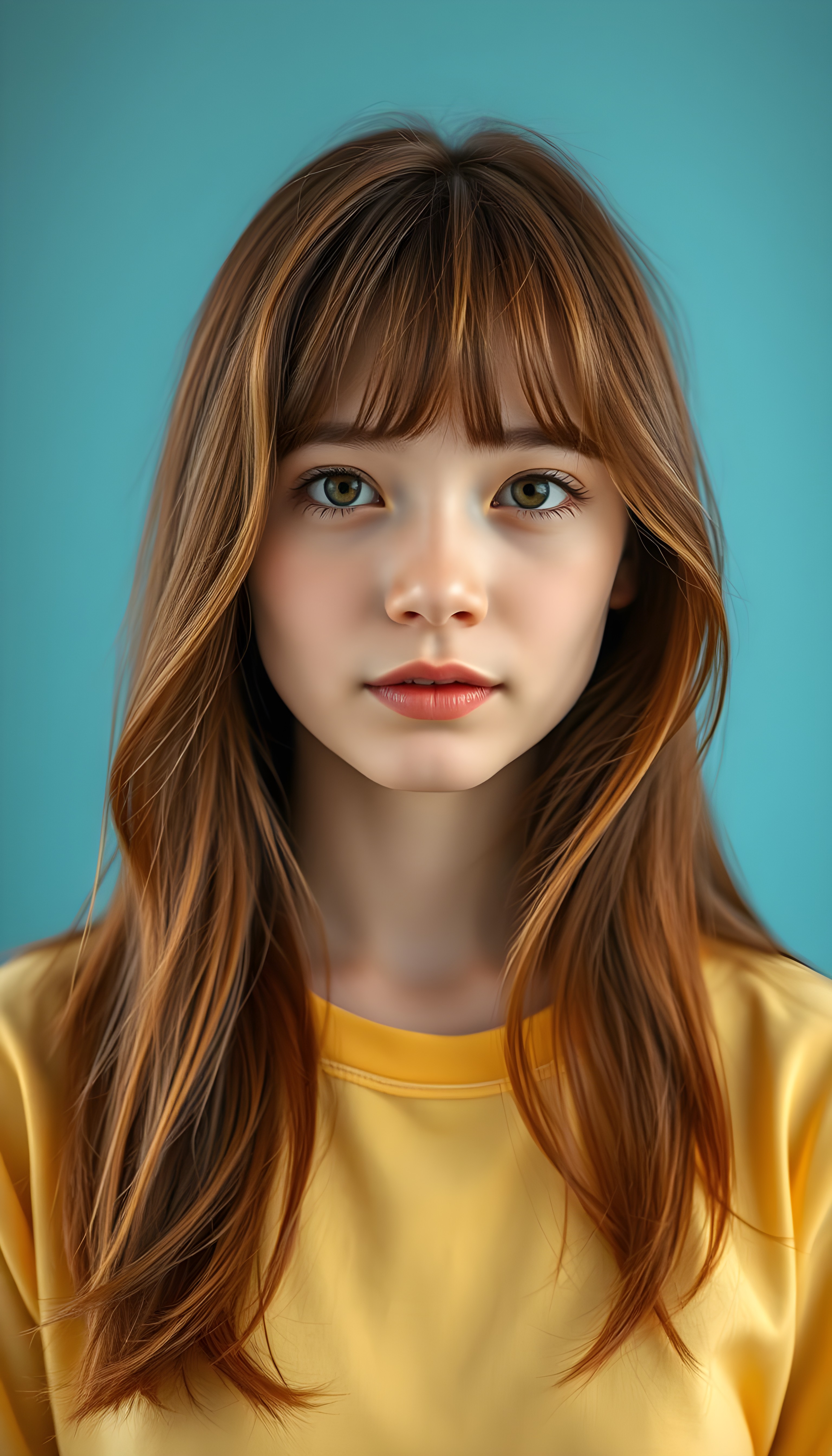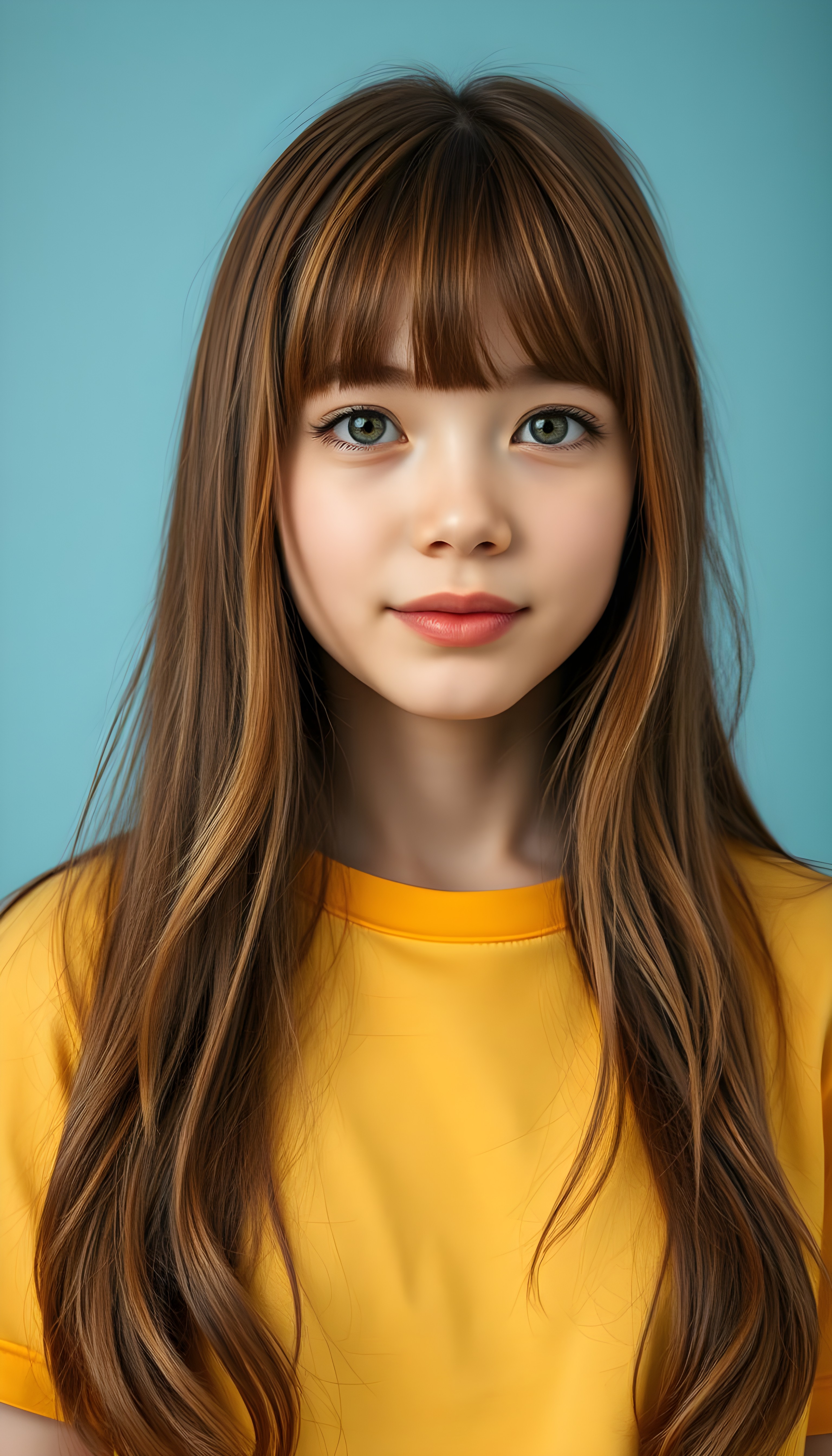 a (((stunningly teen emo girl))) with (((incredibly long, soft silky black straight hair and brown highlights frame her round face, bangs))), framed by a (((gray concrete backdrop))), reflecting a ((sad expression))) that suggests the weight of the world resting on her shoulders, amber eyes. Realistic, Detailed, HDR.