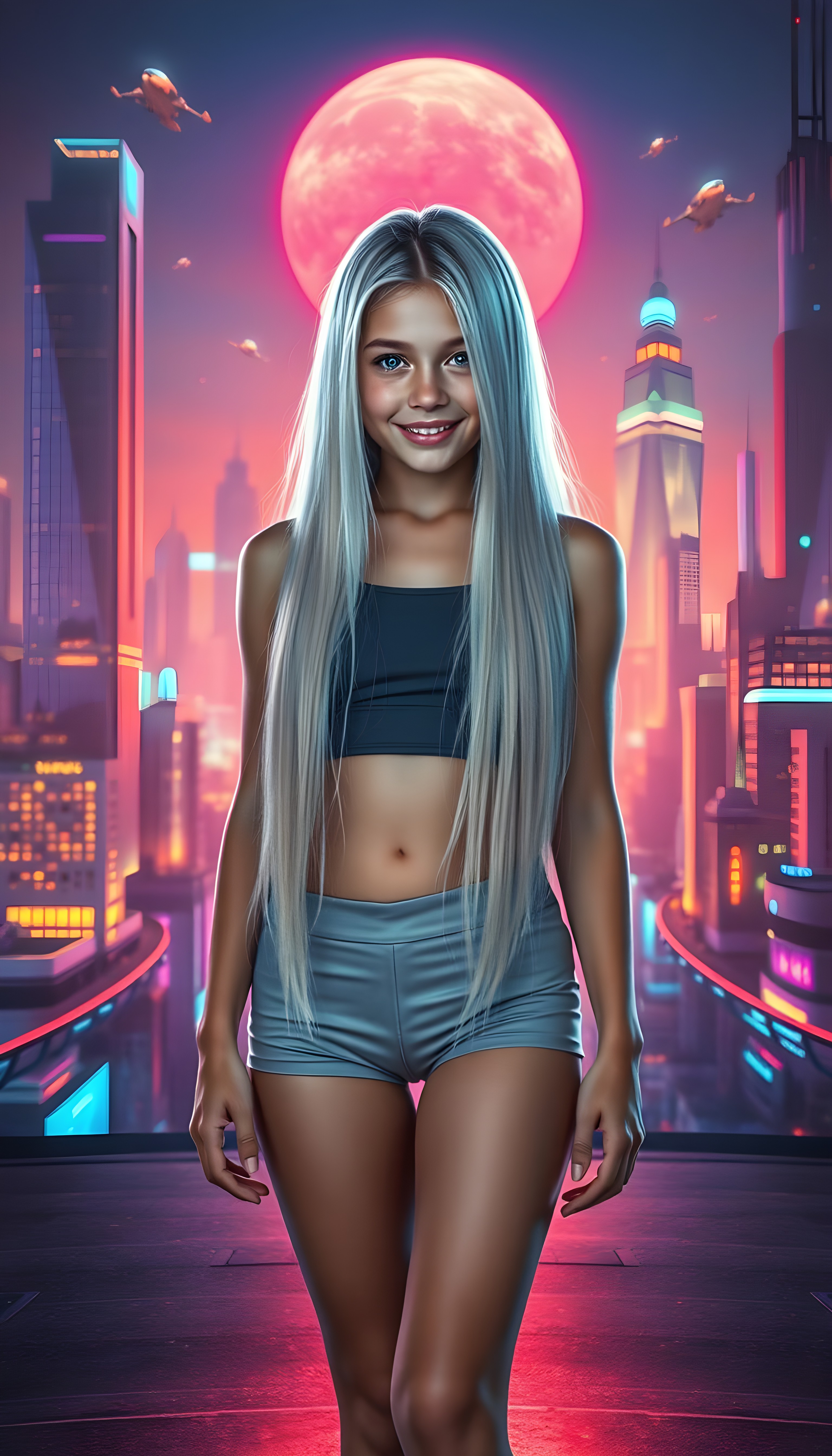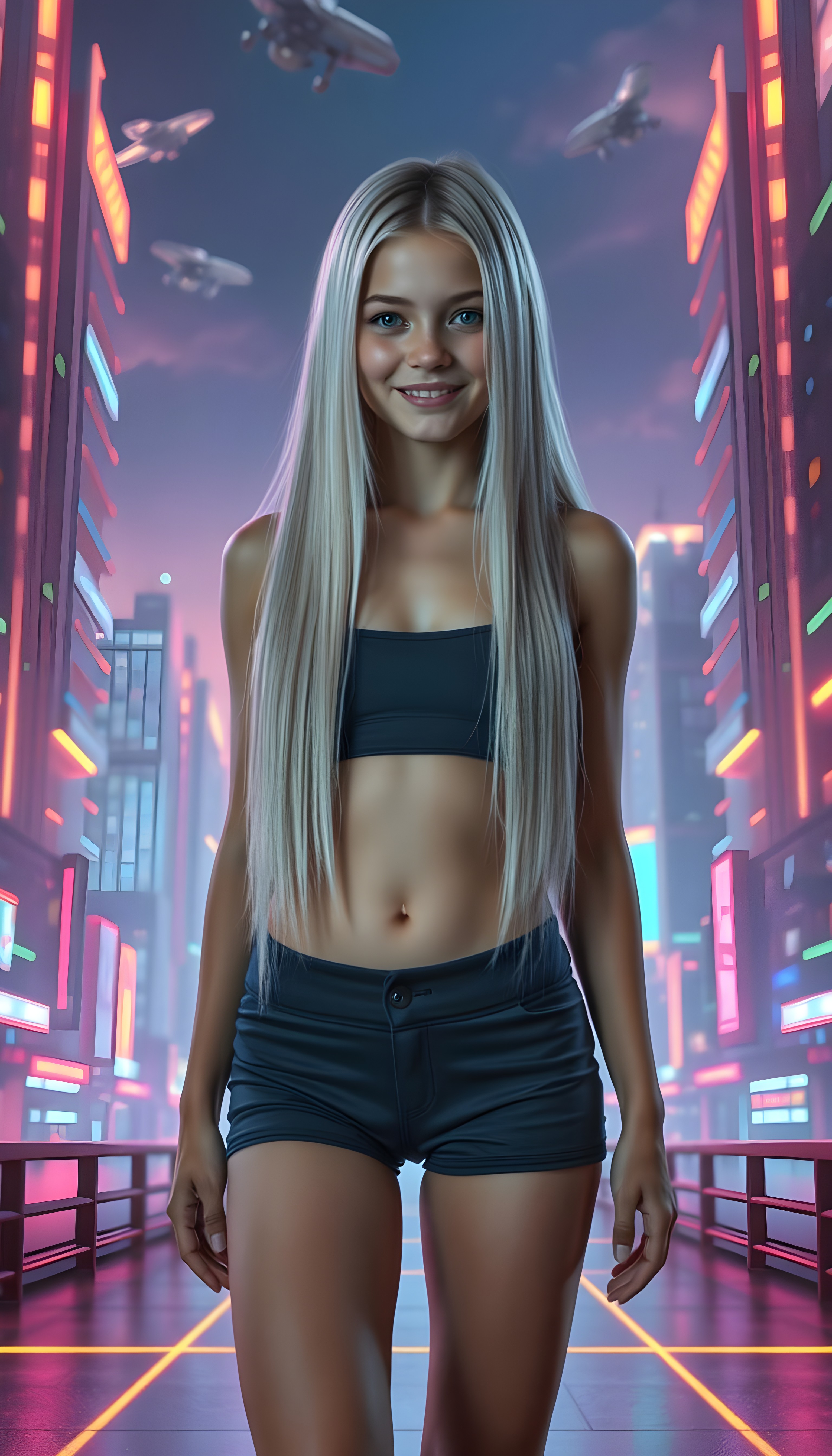 A young girl with long, straight hair cascading down her back, standing confidently in a futuristic, neon-lit cityscape. She wears a sleek, form-fitting crop top and high-waisted shorts, her posture exuding elegance and playfulness. Her eyes sparkle with determination, her smile radiant. The background features a vibrant, holographic skyline with towering skyscrapers and flying vehicles, illuminated by an array of colorful lights. The scene is dynamic, with a subtle glow emanating from the ground, adding a sense of motion and energy to the image. Front view.