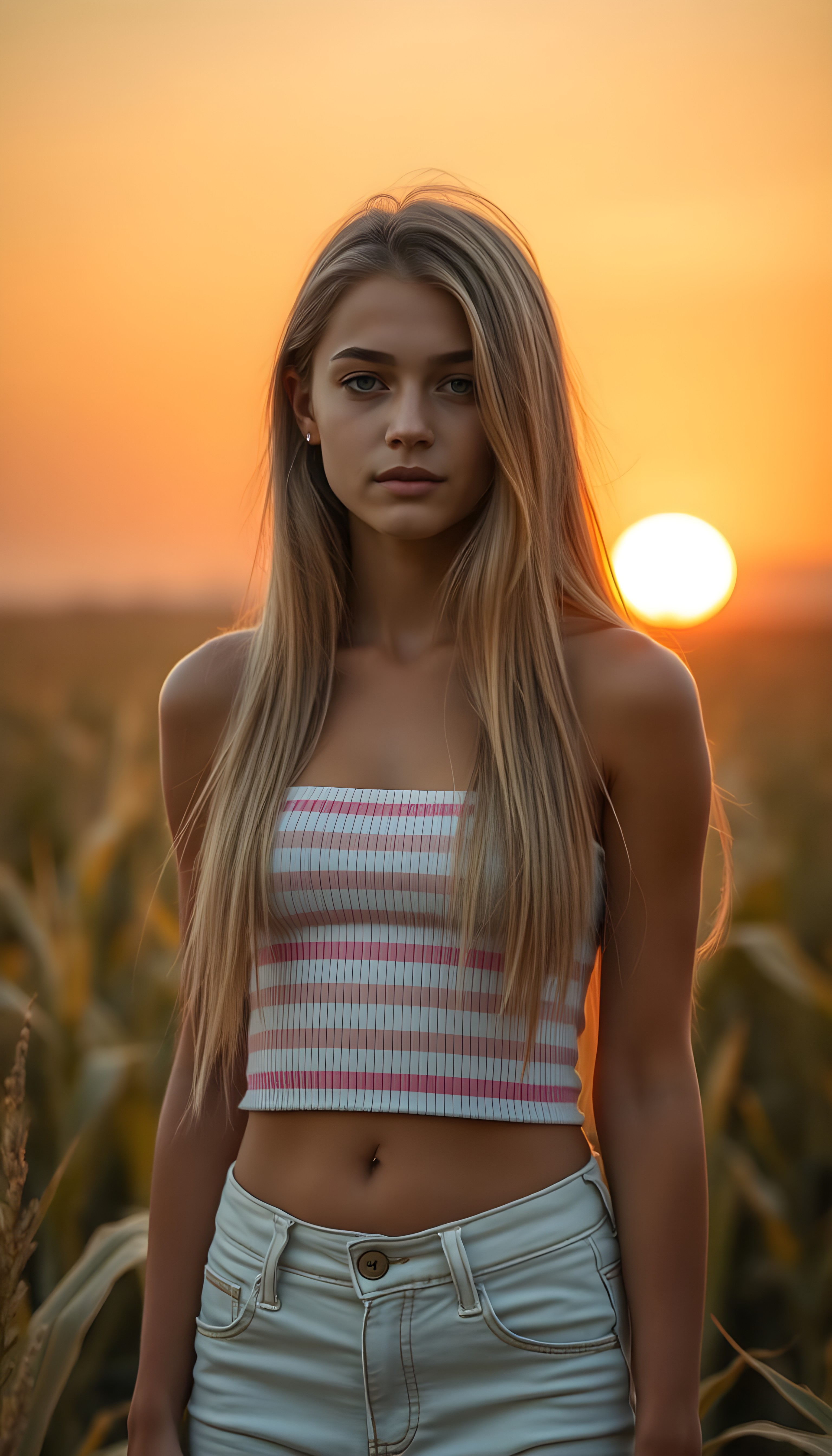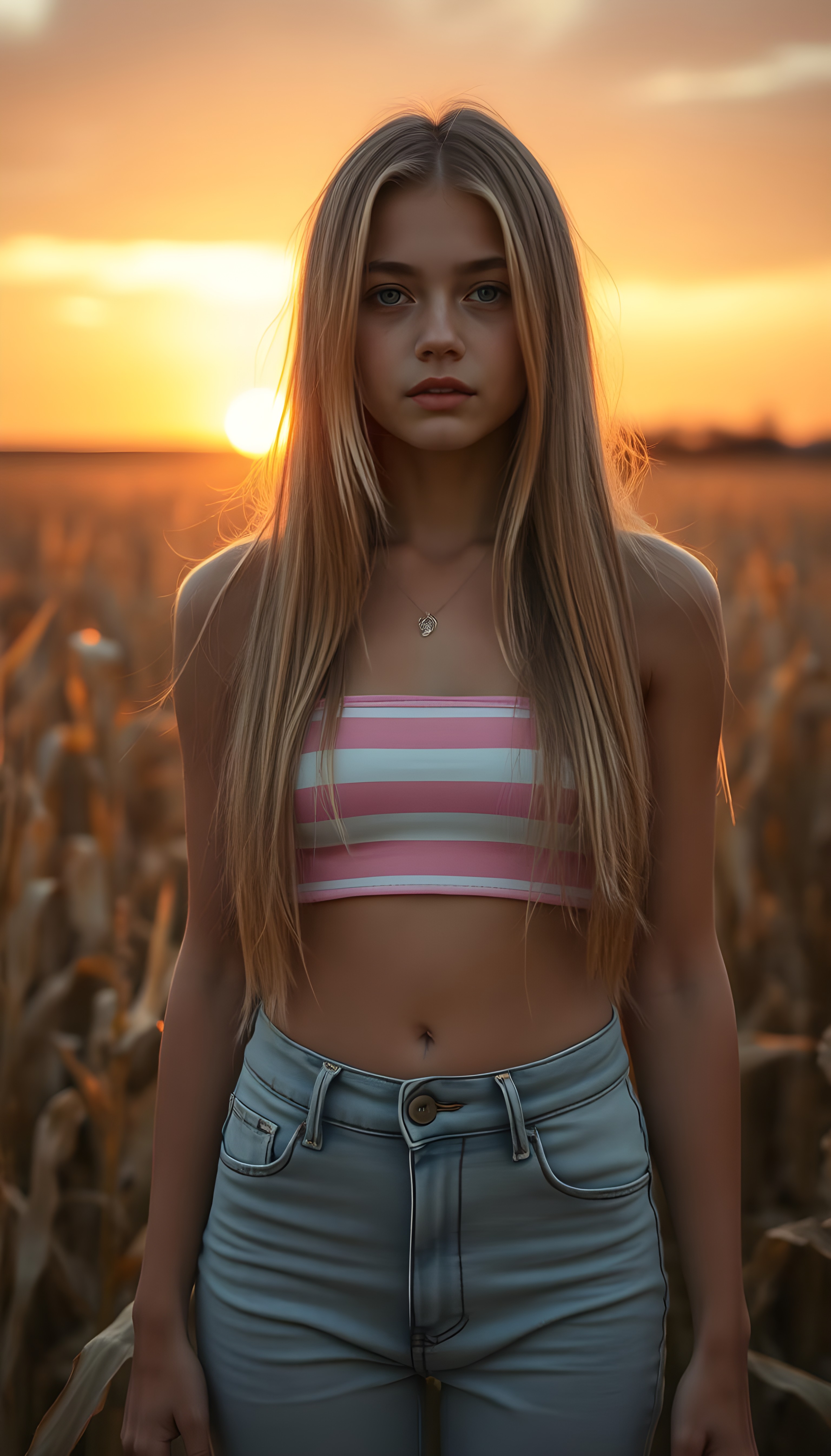 An enchanting young girl with long blonde straight jet hair stands in the middle of a golden cornfield. The sun is setting on the horizon, bathing the scene in soft orange and golden hues. The girl has a perfect, feminine figure and is wearing a white and pink striped cropped tank top and short jeans pants. Round small belly button.