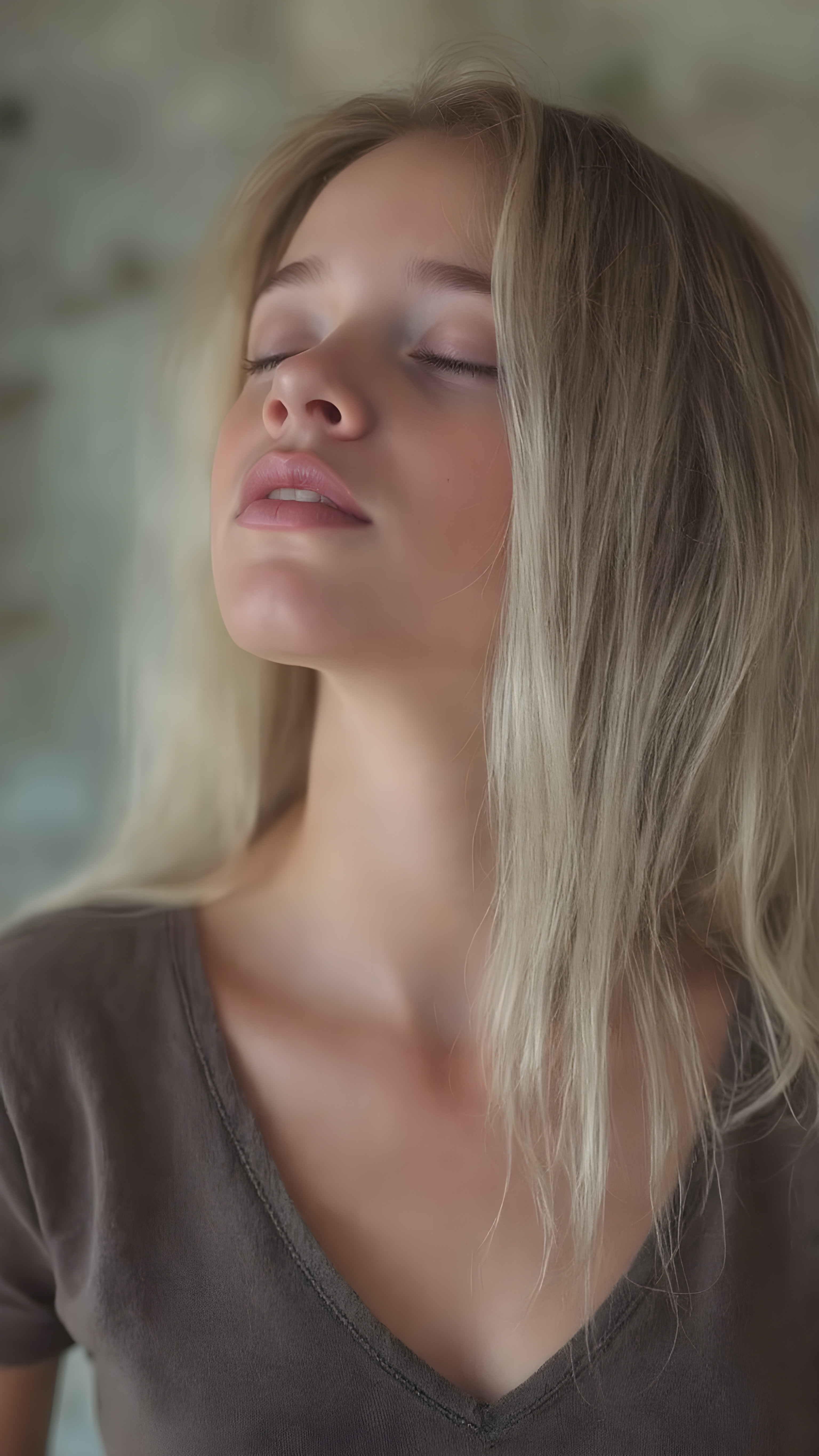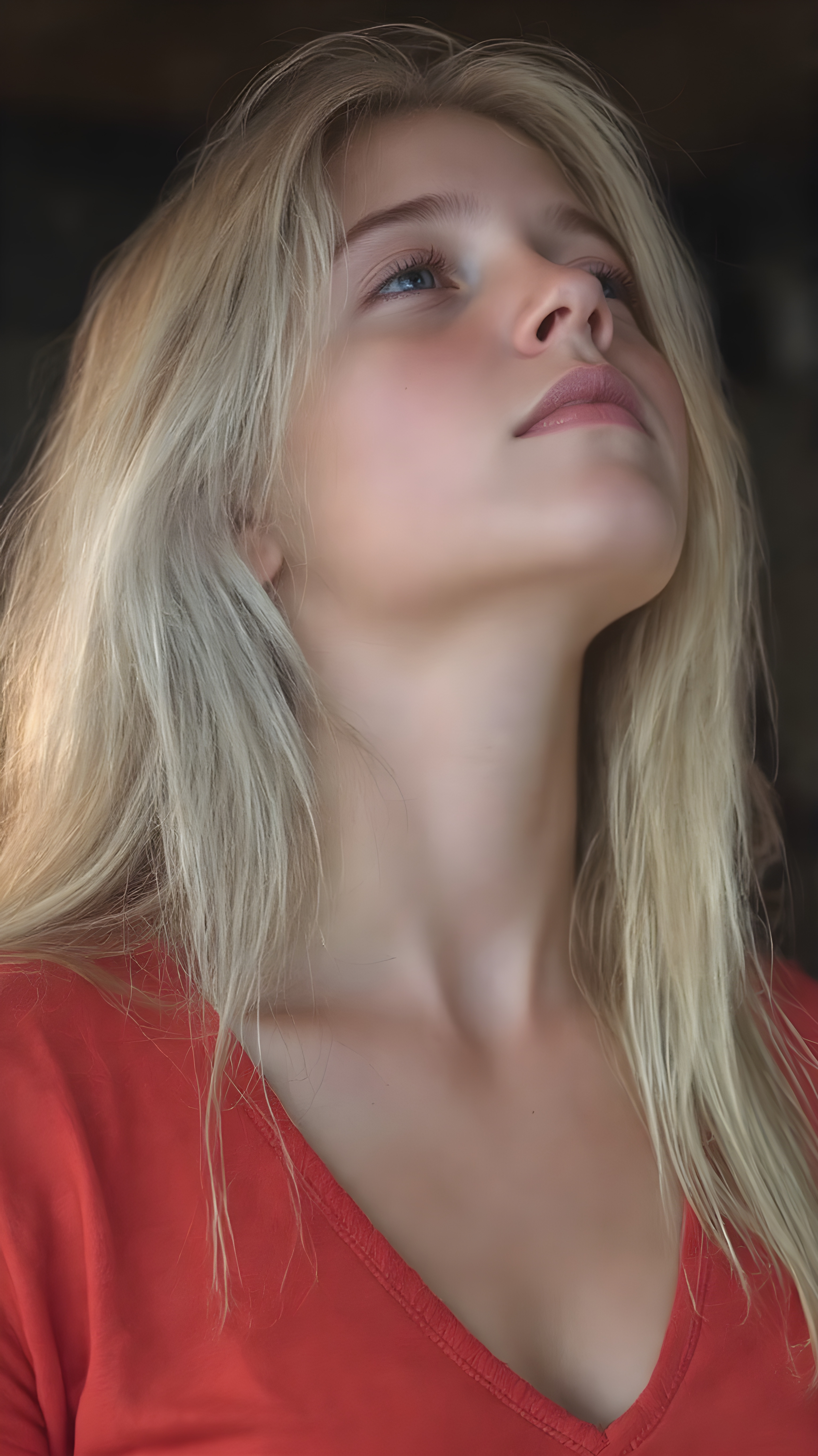 (full upper body side view) of a young teen girl with long white hair falling down her back looking up with closed eyes and slightly open mouth. Her flawless skin is shiny and wet. The picture captures the beauty of a young woman, the girl feel the pure pleasure, the girl wears a short t-shirt with deep v-neck