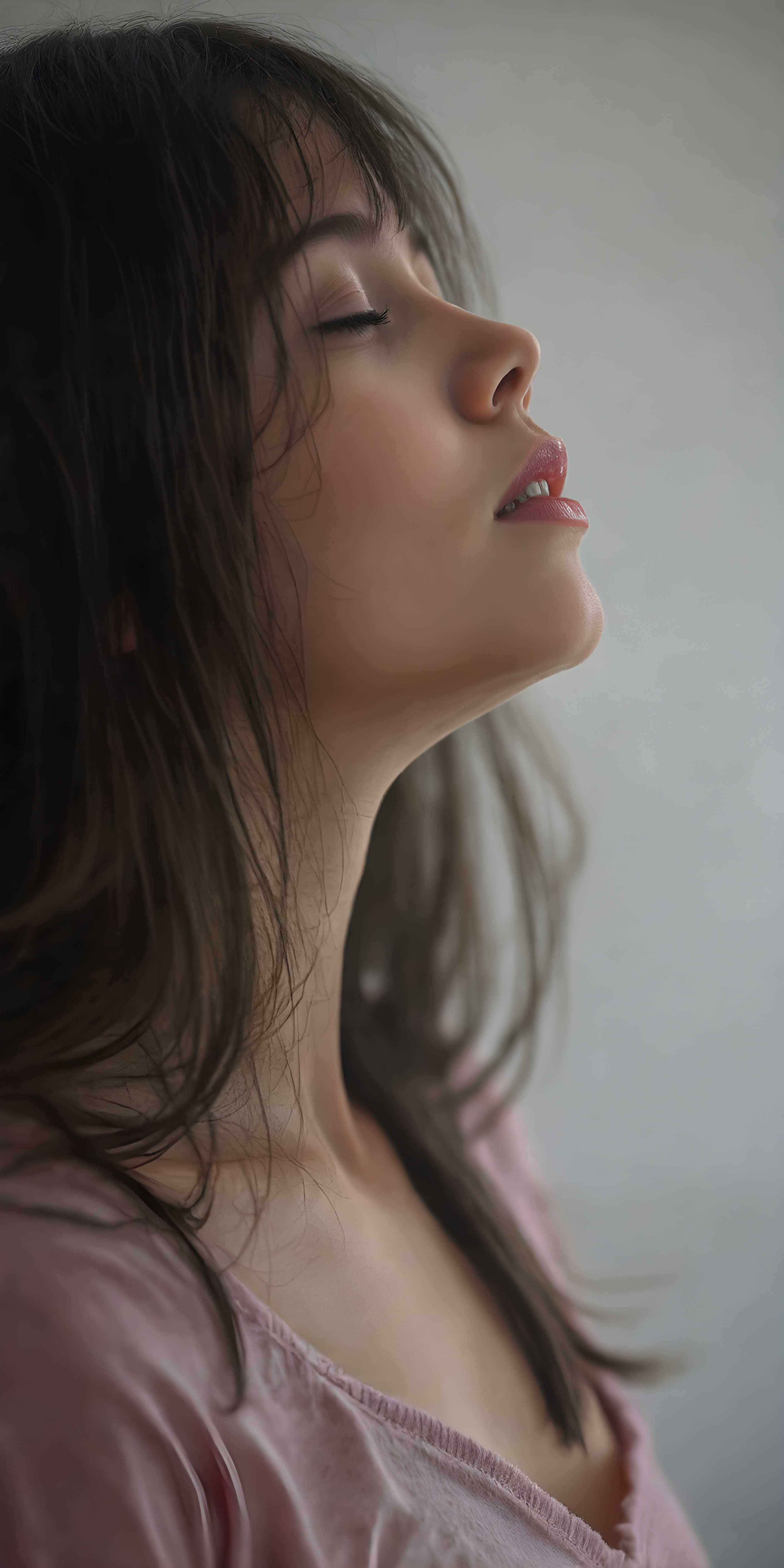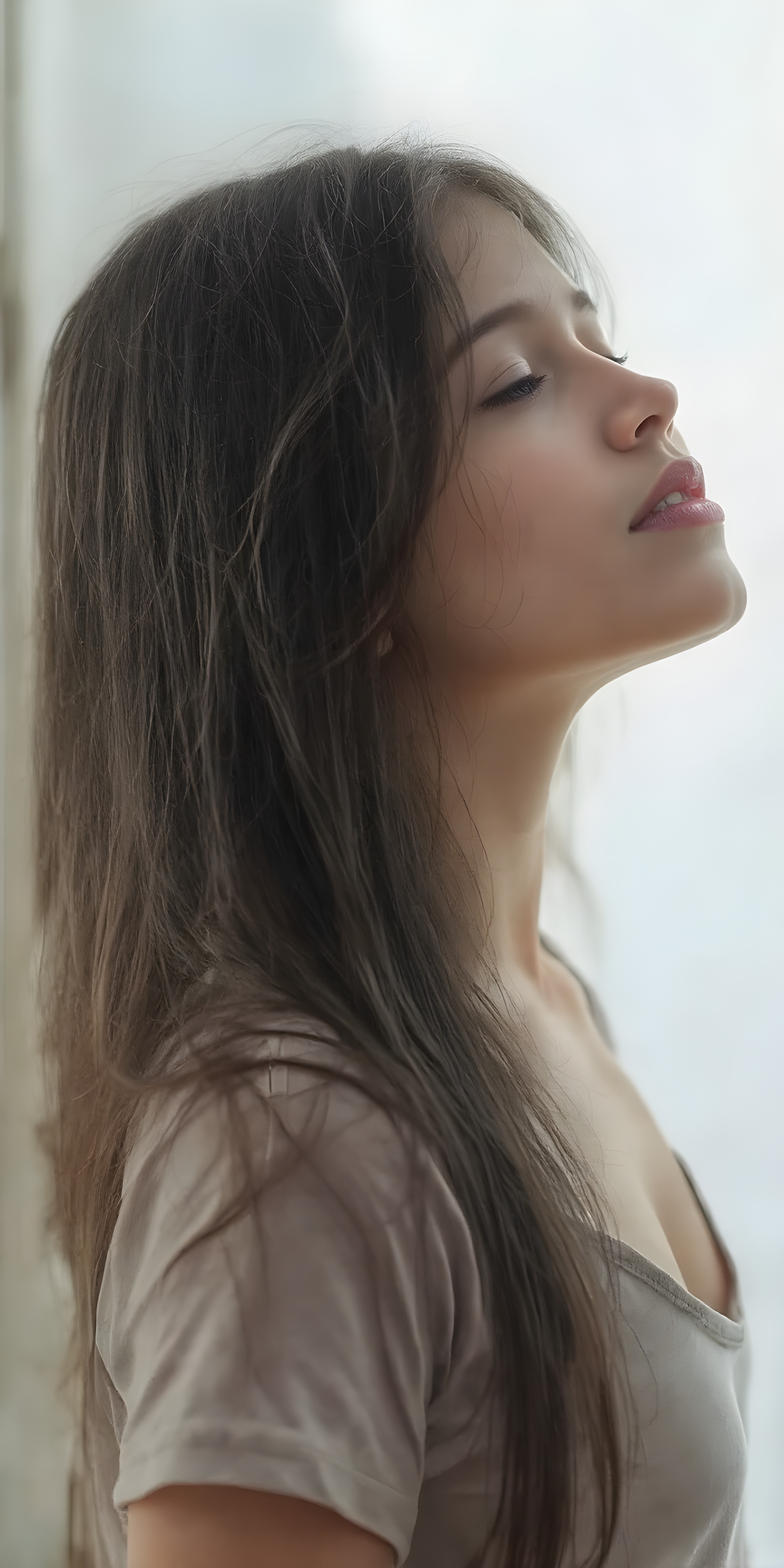 (full upper body side view) of a young girl with long black hair falling down her back looking up with closed eyes and slightly open mouth. Her flawless skin is shiny and wet. The picture captures the beauty of a young woman, the girl feel the pure pleasure, the girl wears a short t-shirt with deep v-neck
