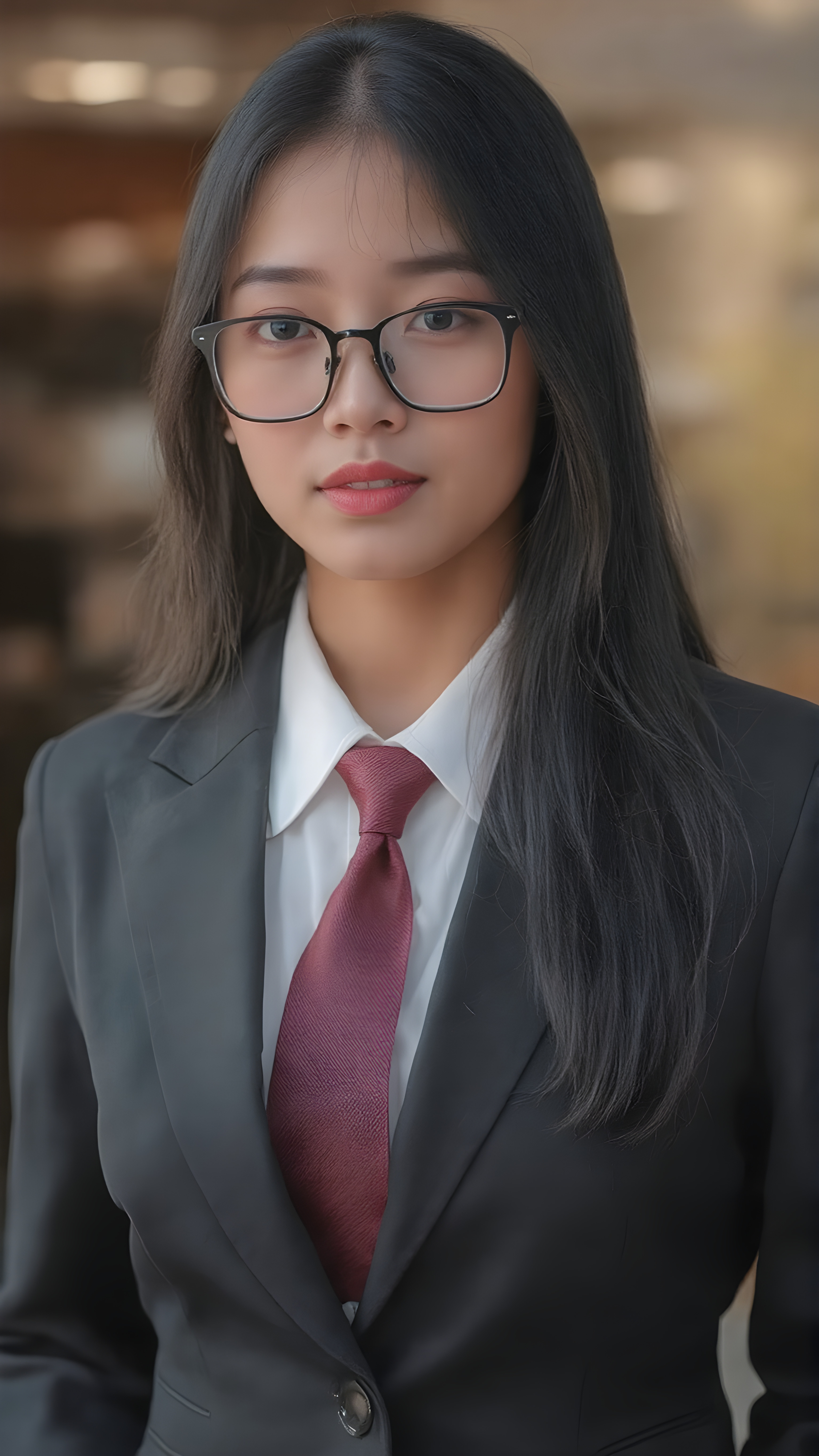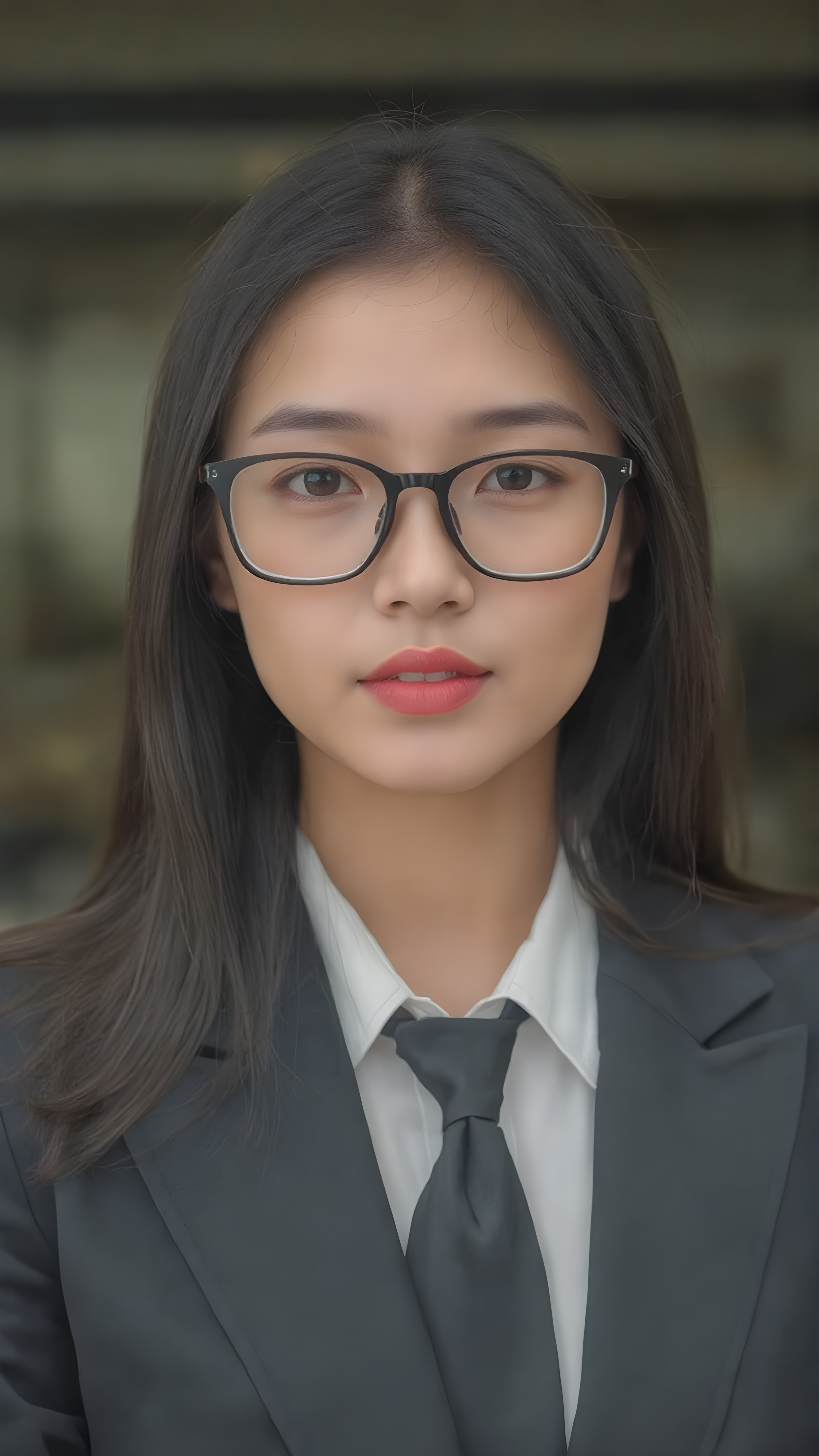a young Asian woman in a business suit, including a white shirt, tie, long black straight hair, red full plump lips, black thin glasses