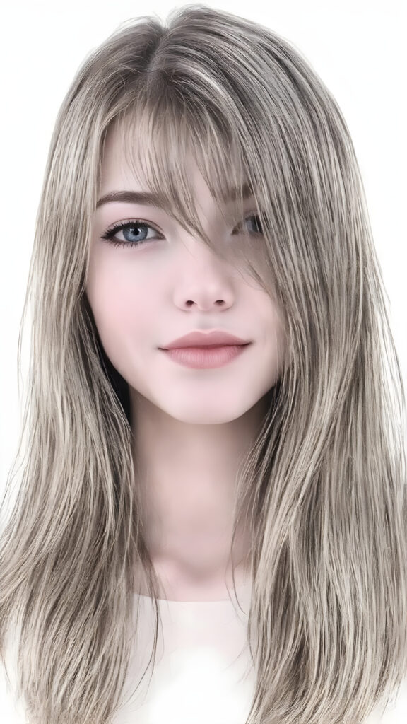 ((hand drawing)) a breathtakingly beautiful (((full body shot))) of a young adult girl, age 18, with luxuriantly flowing, straight, soft COLOR hair framing her exquisite face, gazing joyfully at the viewer. Her figure is strikingly poised, exuding an air of youthful vitality