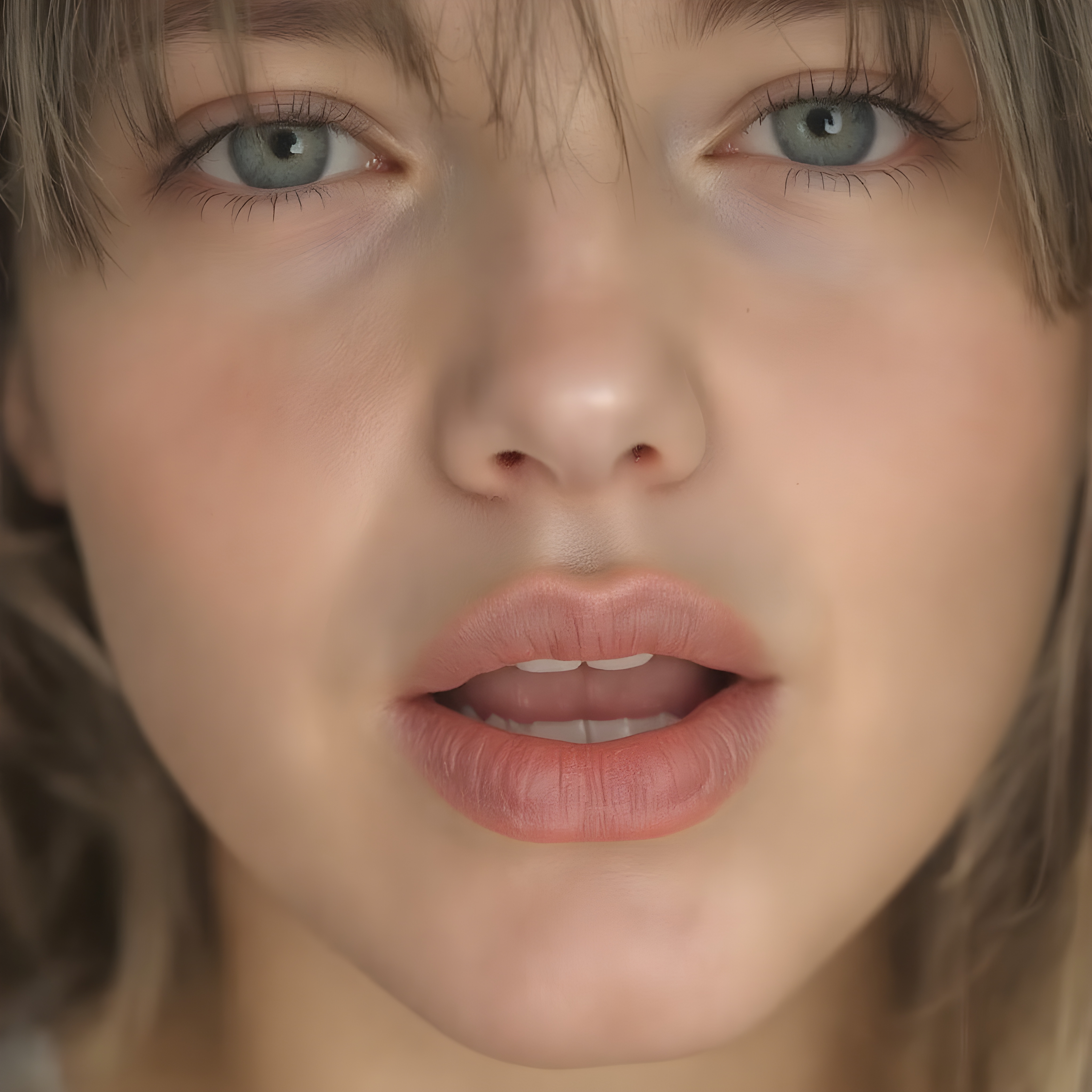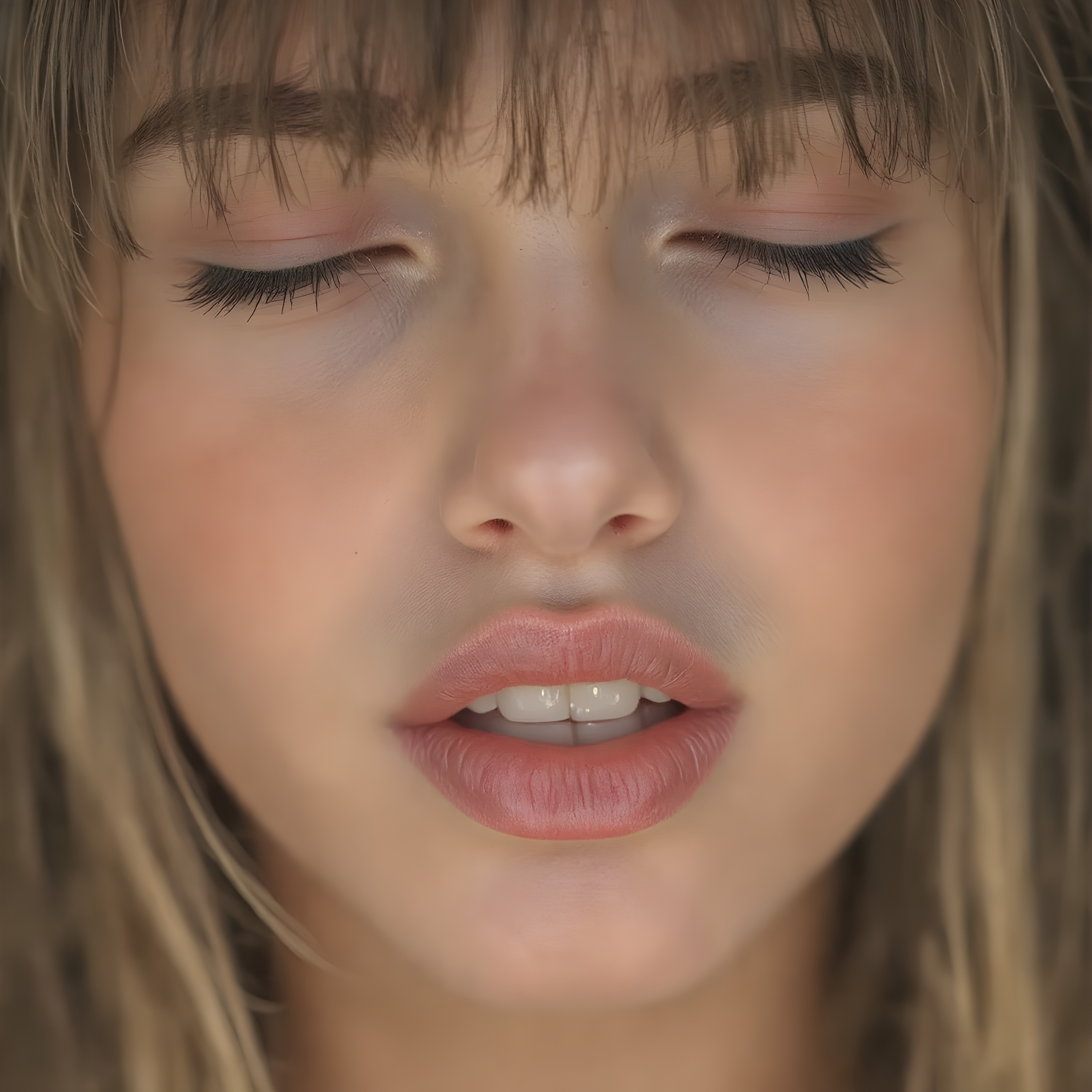 a beautifully facial of a adult girl, with hyper realistic, ultra high definition skin texture and glossy lipstick-adorned full lips, the scene is captured in a high-resolution, 8K setting, under a soft, diffused light, bangs cut, open mouth + and closed eyes