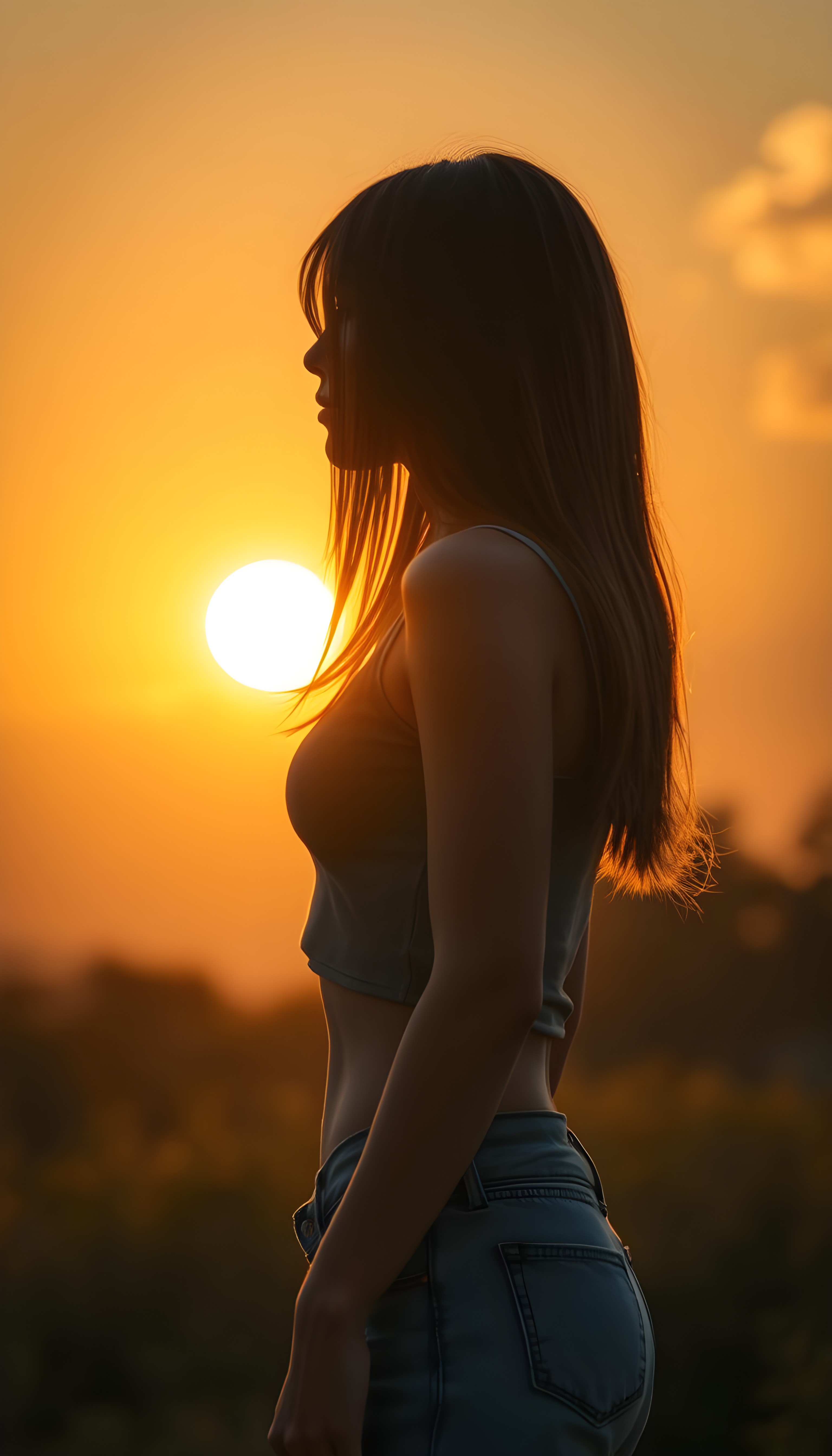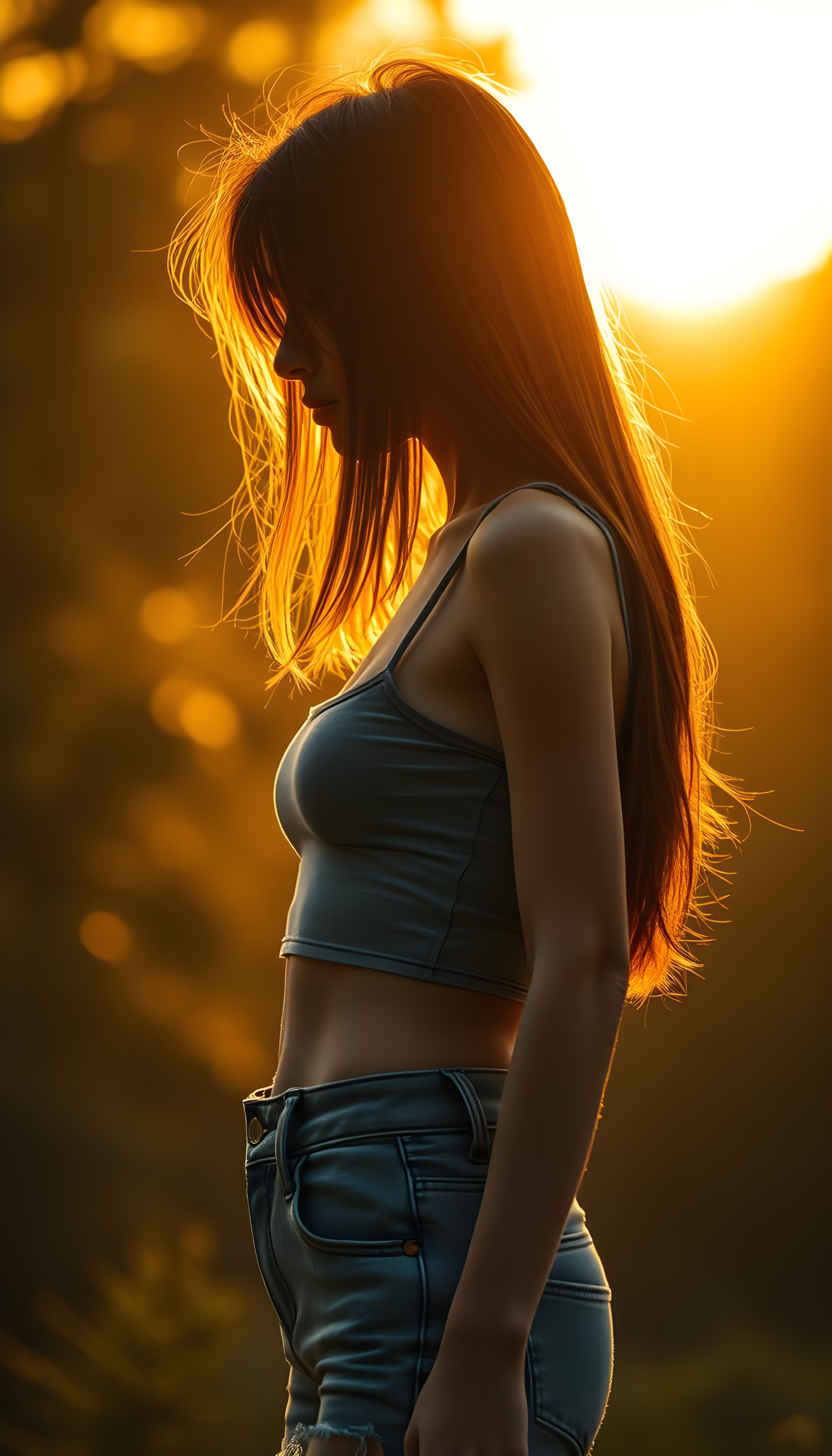 (hyper-realistic, highly-detailed, vivid ((full body ((+ ATTRIBUT)) photo))), with ((rich colors, golden highlights, golden light)), ((low light)), ((crisp details)), ((dramatic diffuse backlighting)), ((high-dynamic range)), ((dramatic sunset)) a well busty teen girl wearing short jeans and a cropped short light grey tank top, perfect pose, shoulder-length straight brown hair falls down to her back like a waterfall.