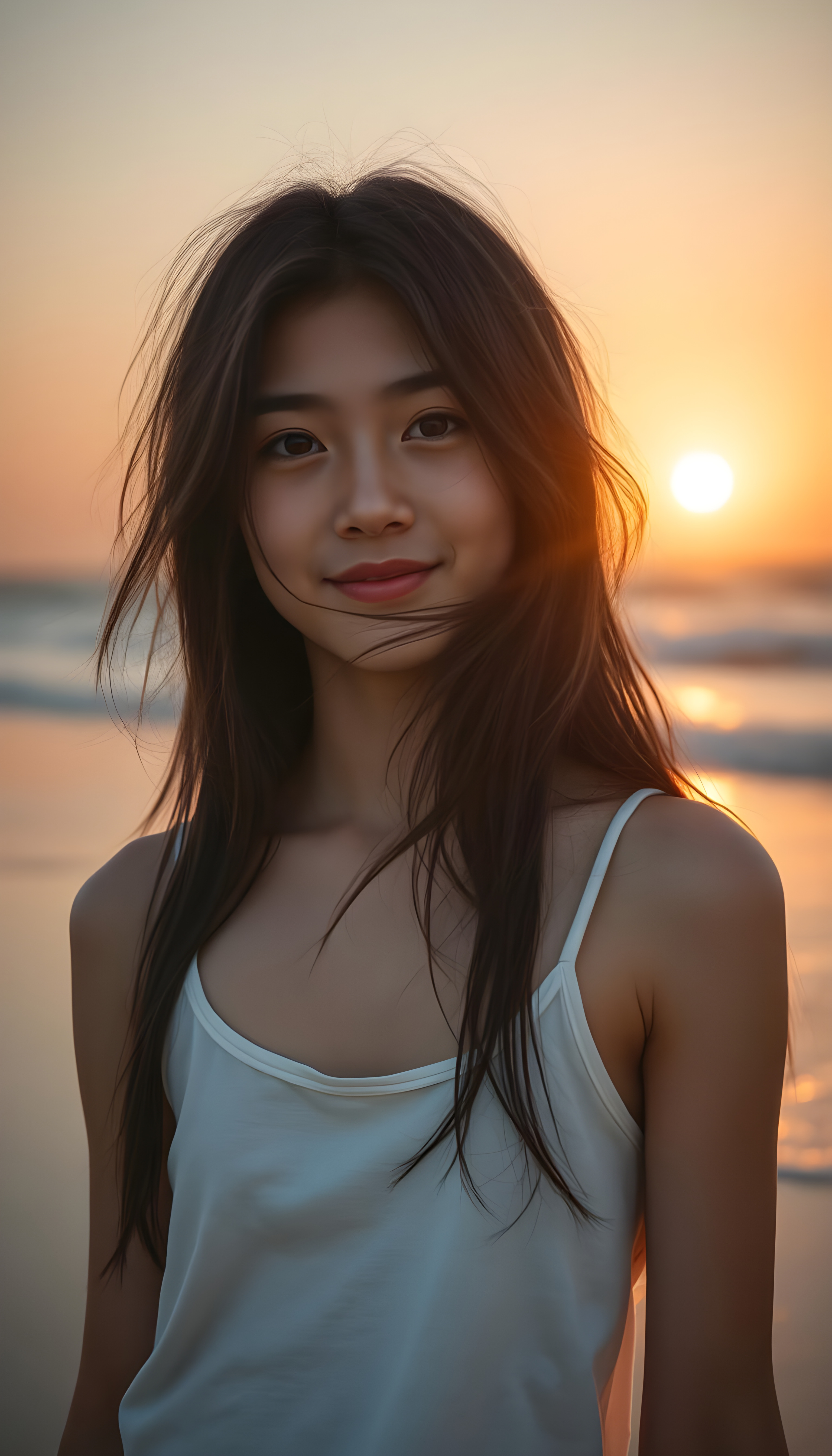 A young, artistic girl with long, flowing dark hair adorned with subtle highlights stands on a serene beach at sunrise. Her hair cascades around her face, accentuating her delicate features. She wears a simple, white cotton tank top, her expression a warm, gentle smile. The scene is bathed in soft, golden light, with the sun casting a warm glow over the ocean and her silhouette. The background features rolling waves and a distant horizon, creating a peaceful and dreamy atmosphere.