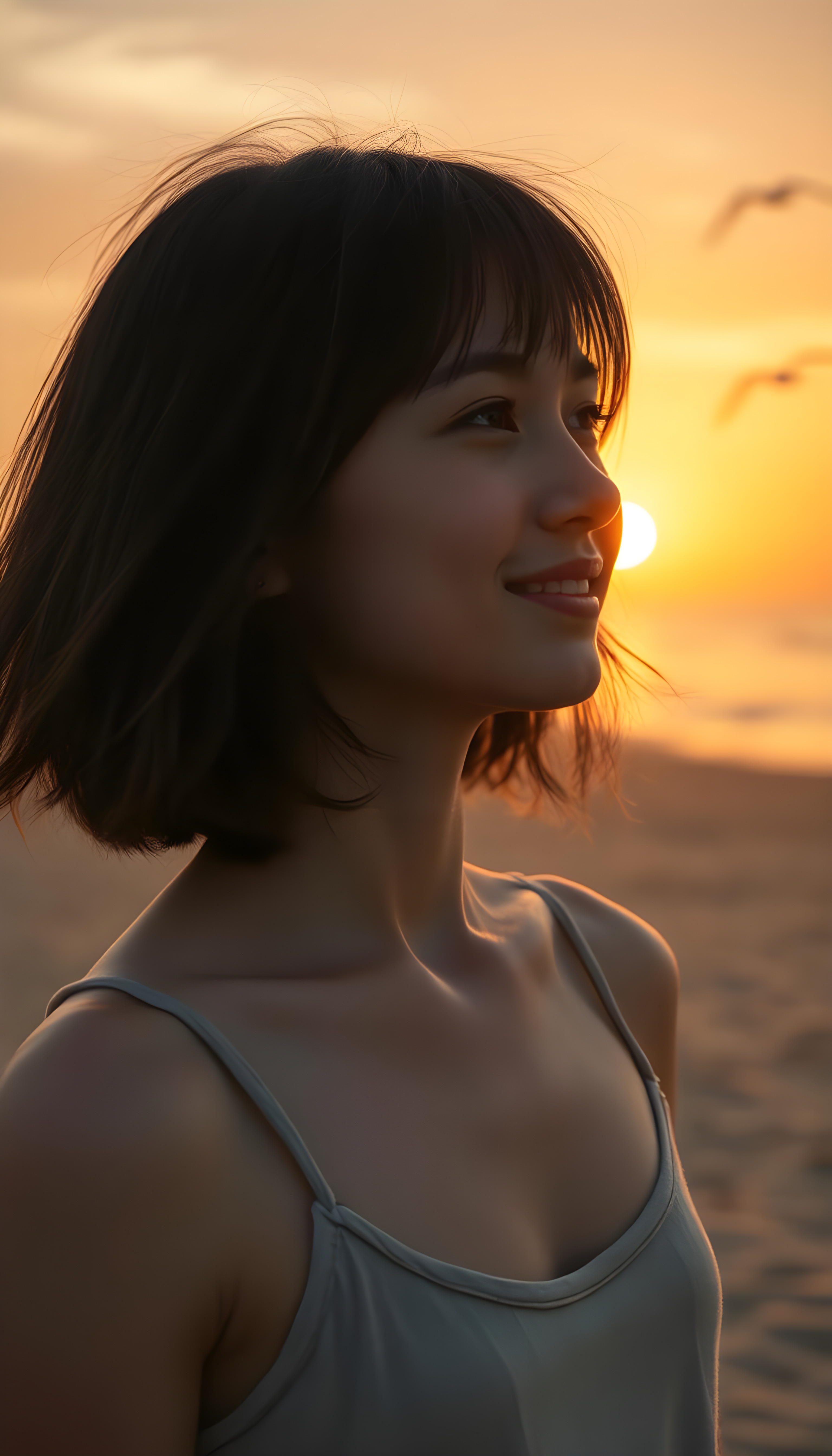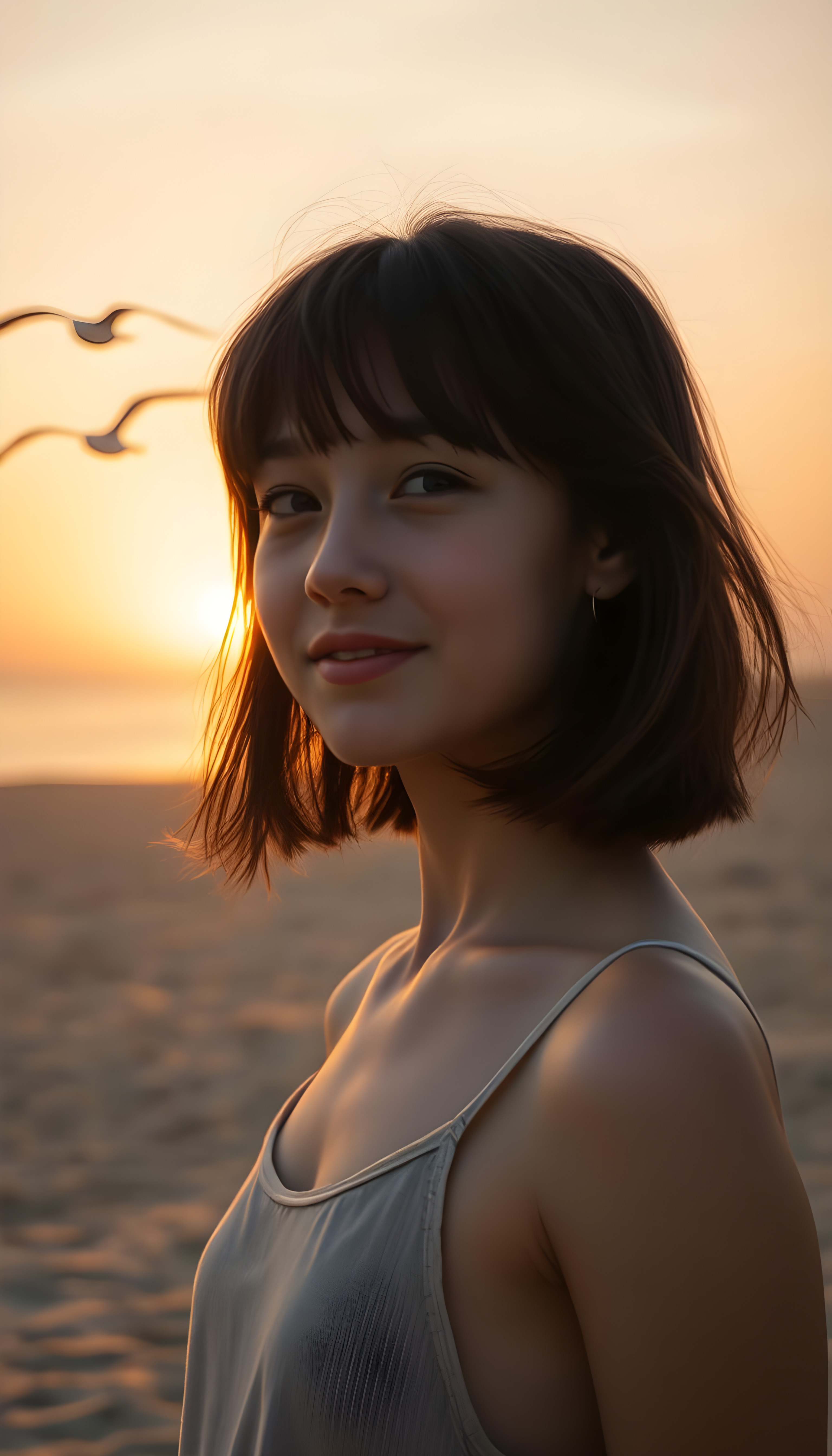 A young girl with soft, dark shoulder-length hair and gentle bangs, her face round and detailed, stands on a vast, deserted beach at sunrise. The sky is a blend of warm oranges and soft pinks, casting a golden glow over the calm sea. She wears a thin, fine-wool tank top, her eyes gazing at the horizon with a warm, serene smile. The perspective is from above, capturing her silhouette against the rising sun, with seagulls soaring in the distance. The composition is balanced, with the beach stretching out to meet the horizon, creating a sense of peace and solitude.