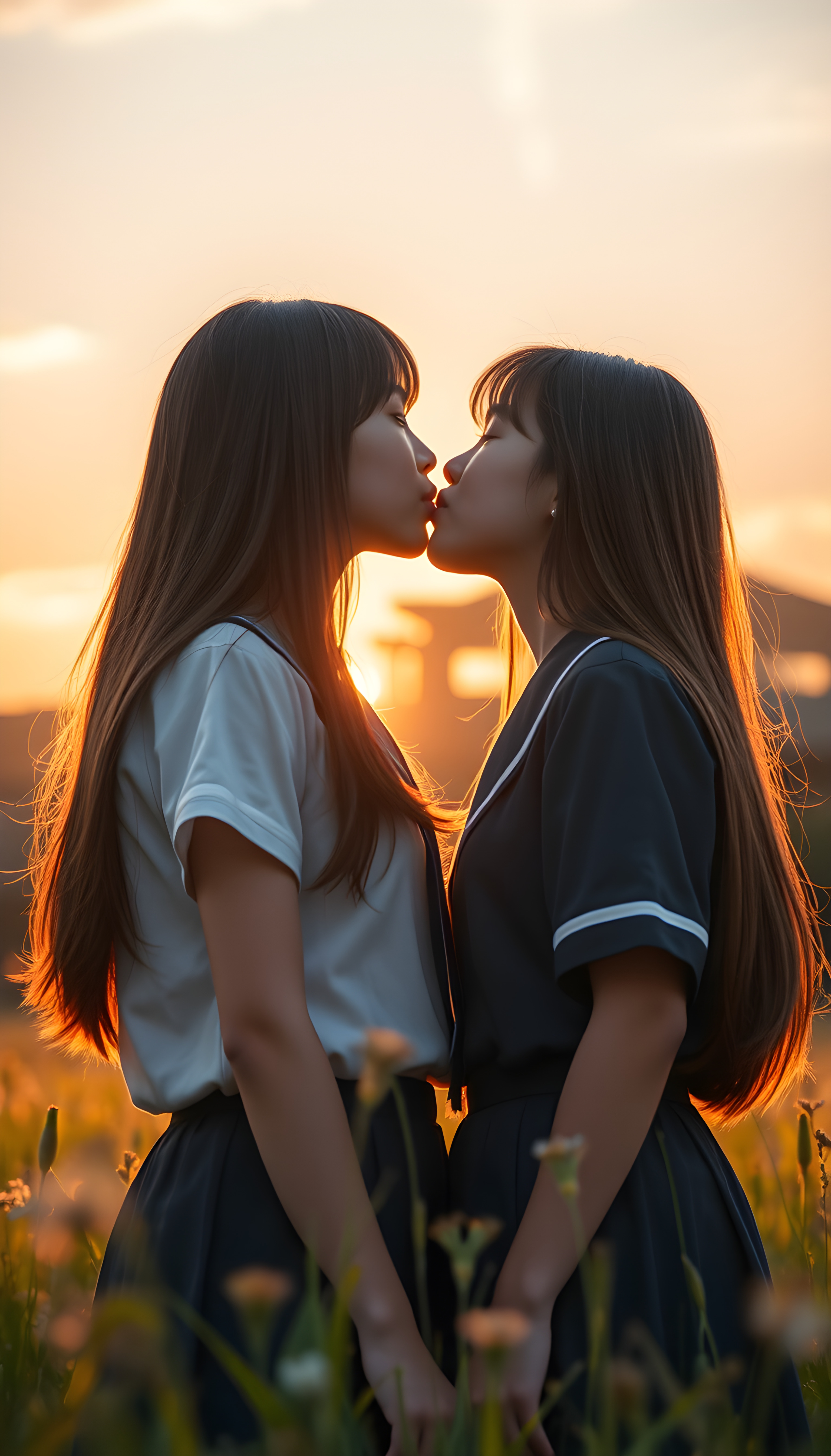 In a sunlit meadow and a dreamy sunset, two cute young Japanese school teen girls about a passionate kiss, long brown straight hair, traditional school uniform